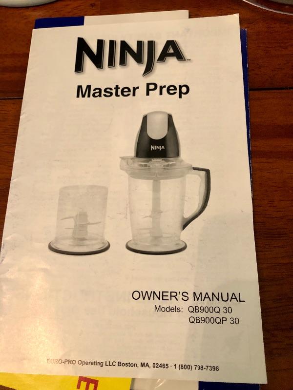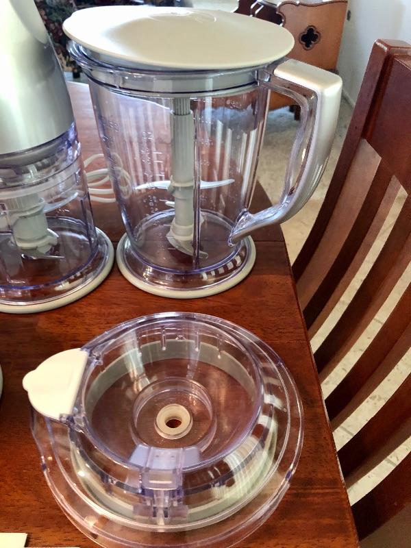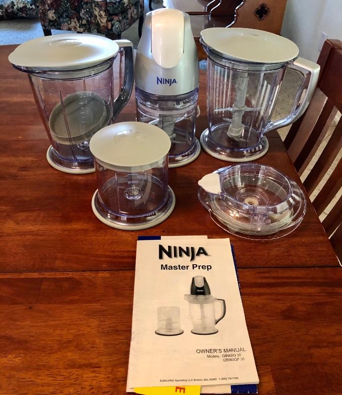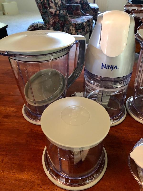 Full set of Ninja food processor cups, pitchers, lids and the motorized base unit.
