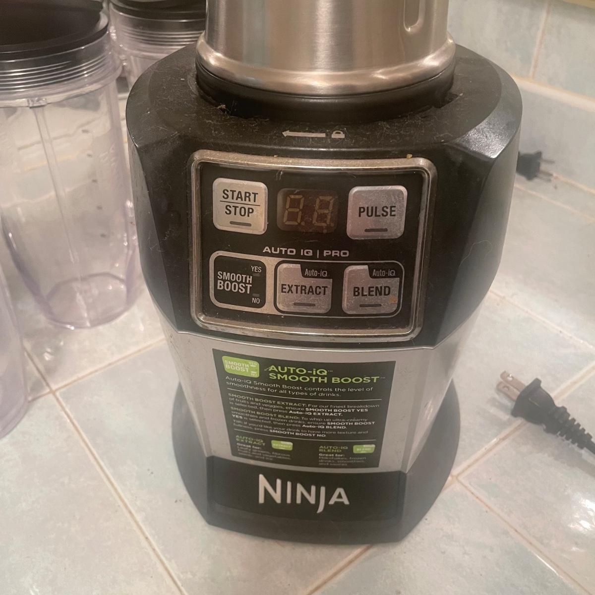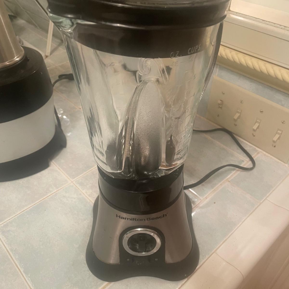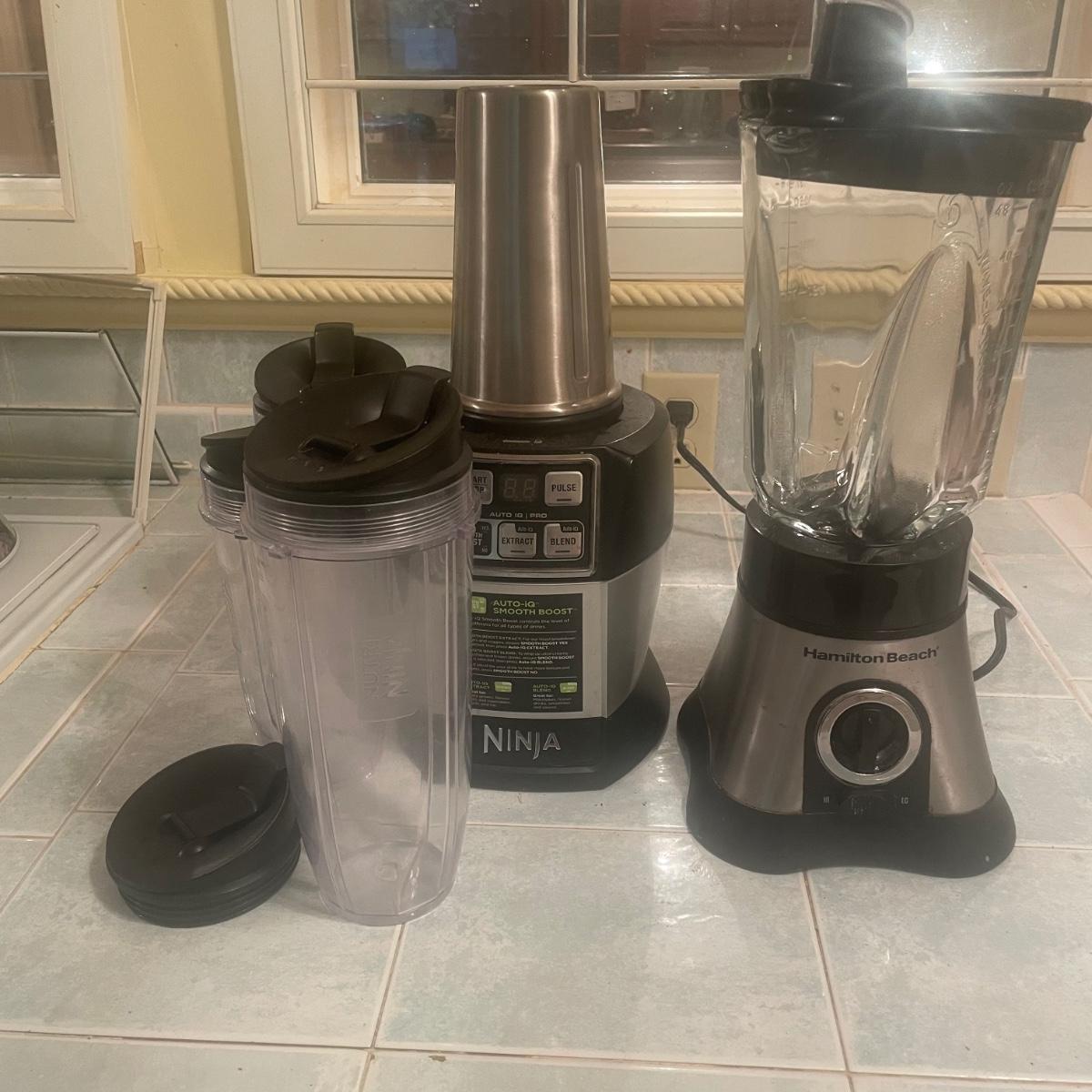 Both appliances powered on when tested. The Ninja IQ Smooth boost blender comes with 3 plastic cups with “˜to go’ lids. The Hamilton Beach is model 58142R and measures 6” d x 15” tall.
