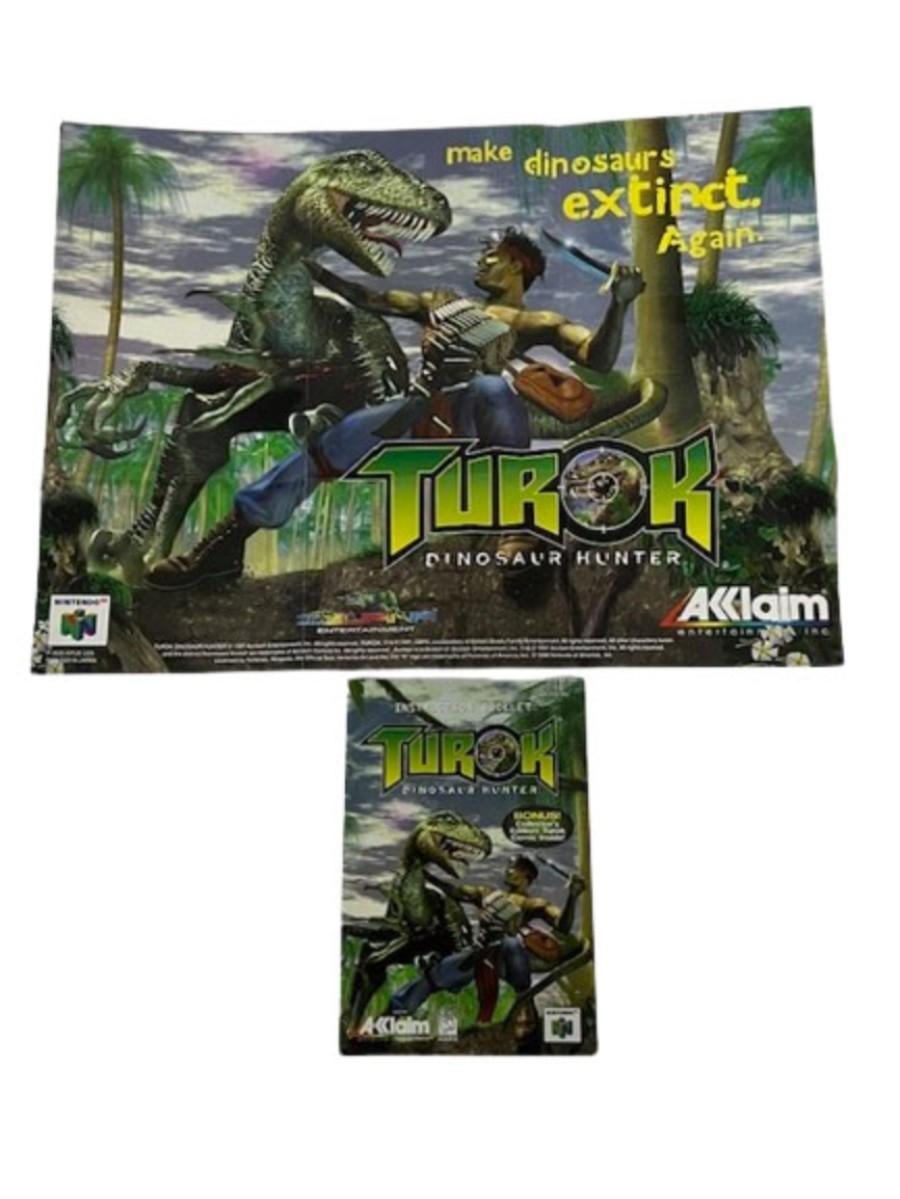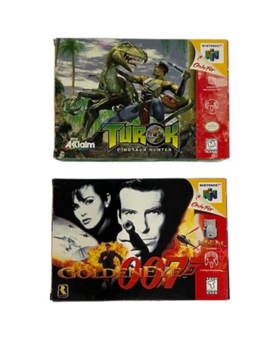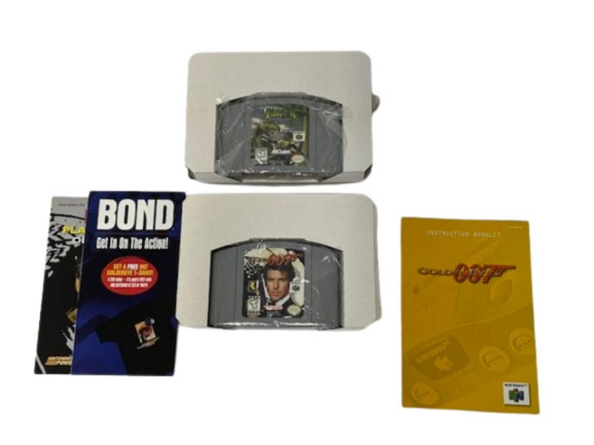 Includes Golden Eye 007 and Turok Dinosaur Hunter, both believed to be complete and in original boxes. A small piece of the cardboard insert from the Turok box is torn off, but is in the box. [SD]