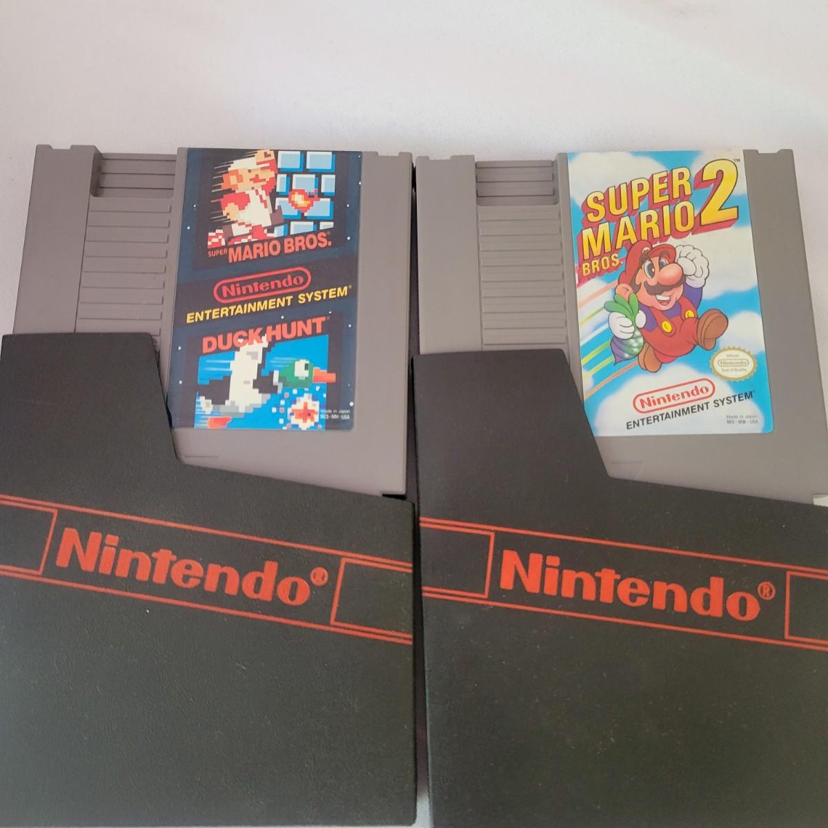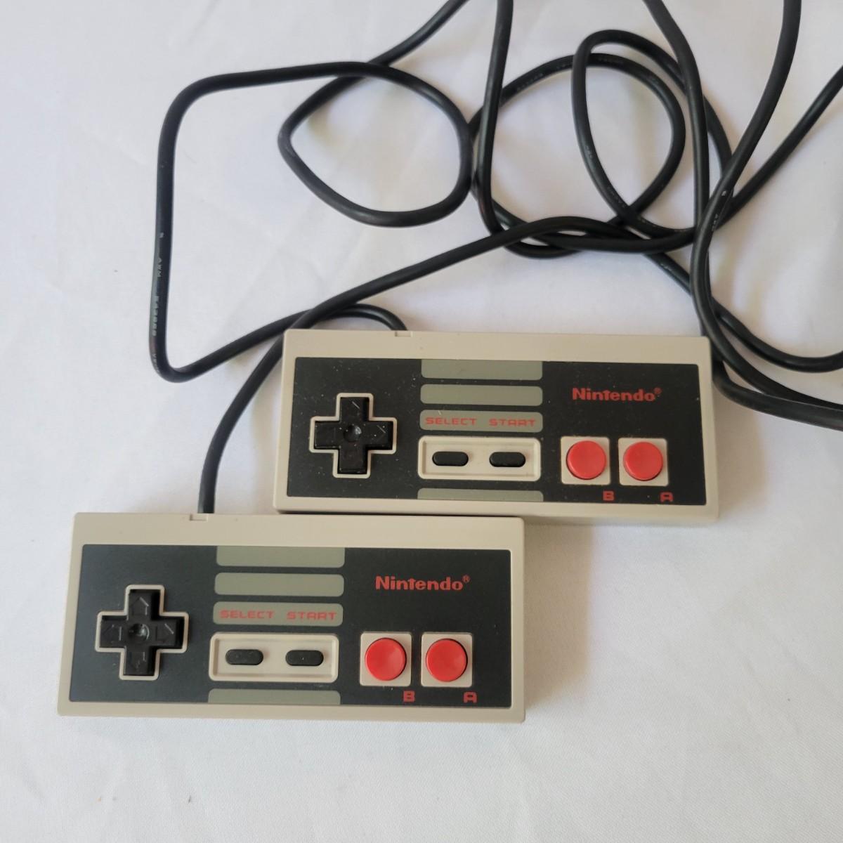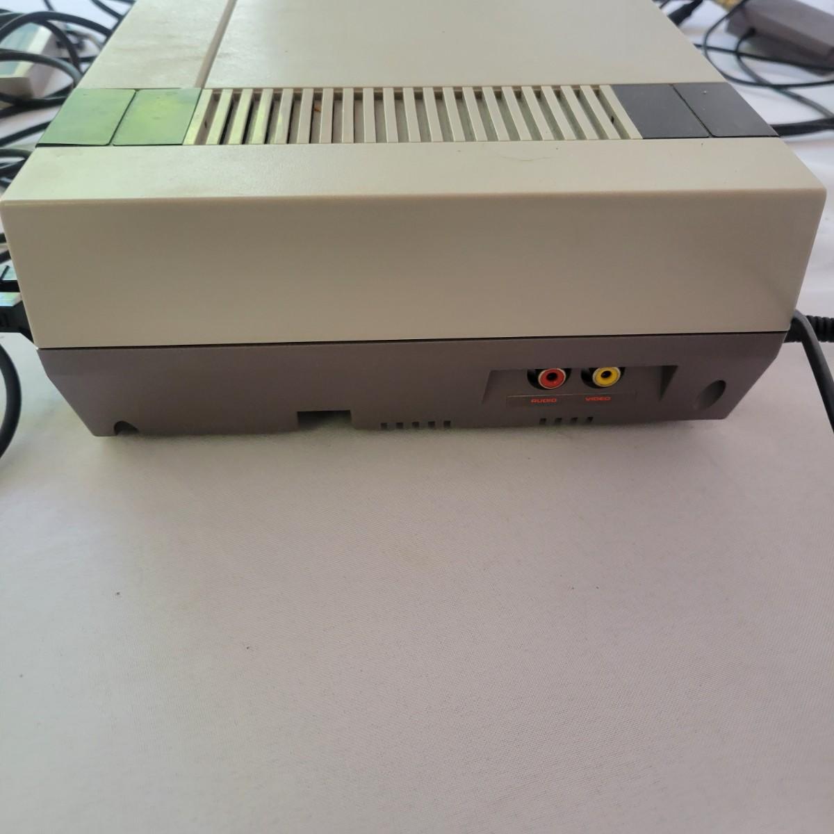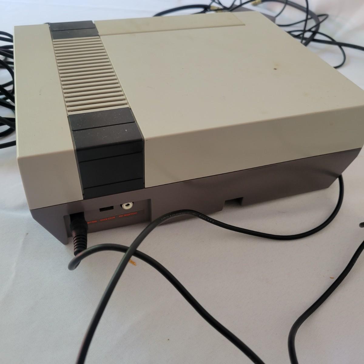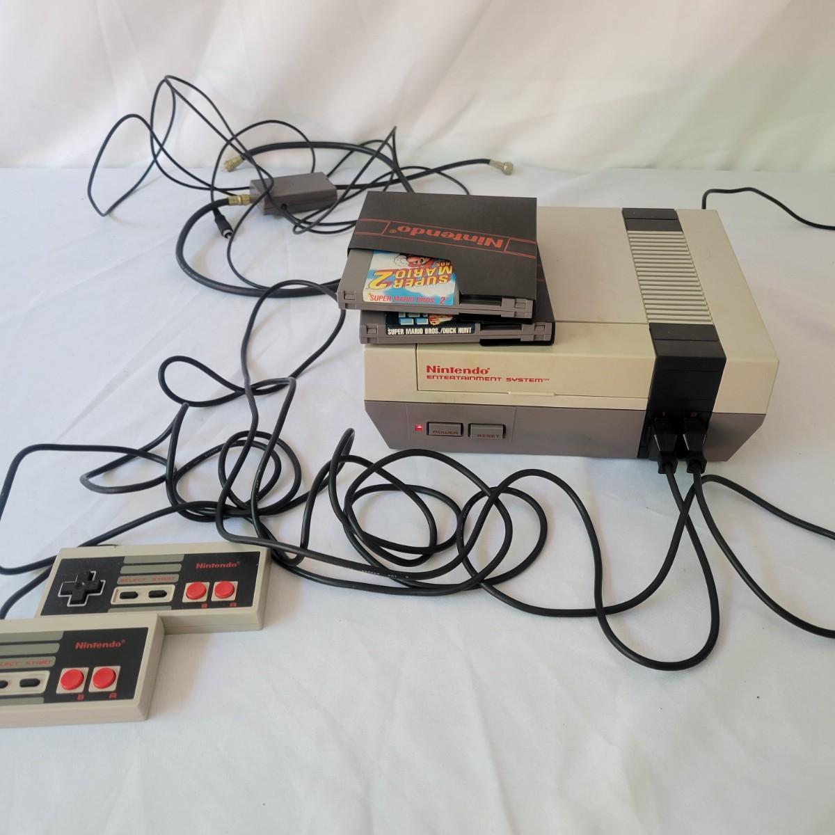 A Nintendo entertainment system with controllers that includes a coaxial TV connection that powered on when plugged in. Also included is two game cartridges that are Super Mario Bros w Duck Hunt and Super Mario 2. Shipping available. Shipping can be costly. We suggest contacting our preferred local shipping provider, Postage Express, with dimensions and getting an estimate before bidding: (828) 670-5501 or postageexpress@yahoo.com.
