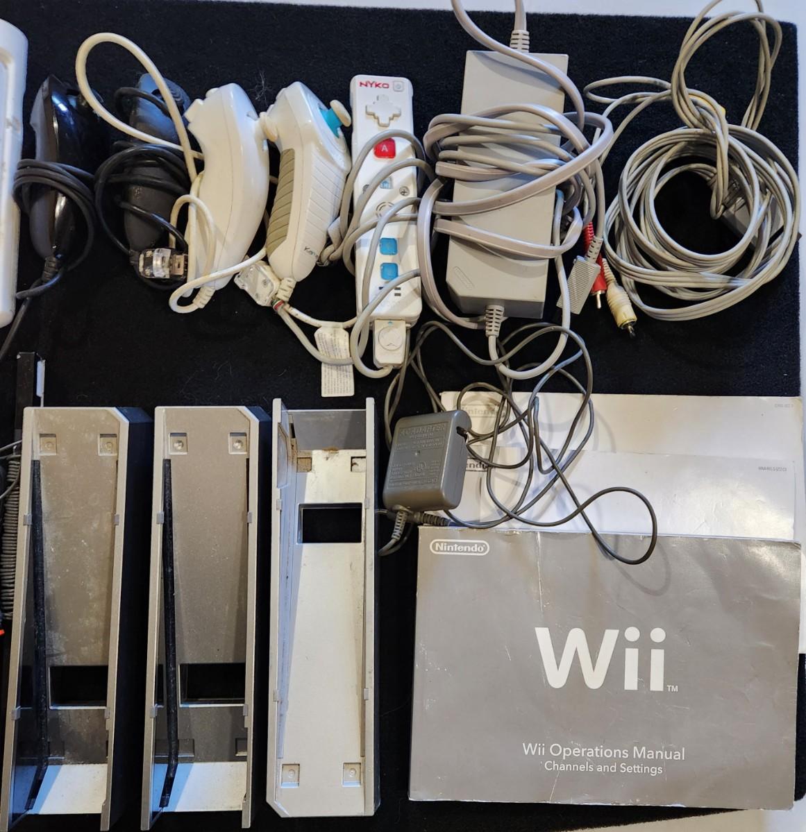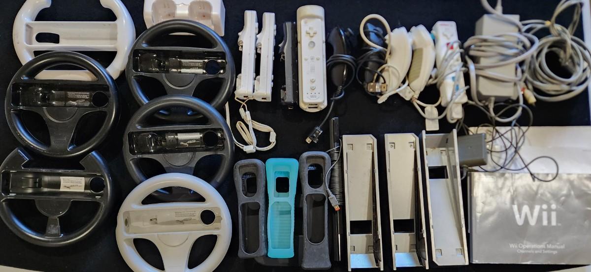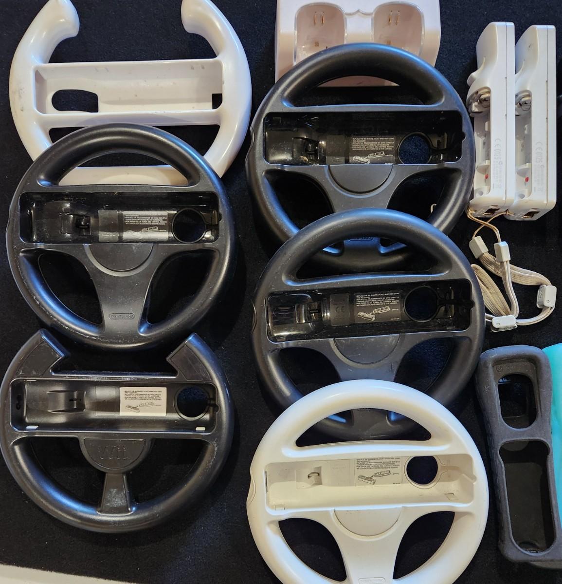 Nintendo Wii Huge Lot of Racing Wheels Controllers Stands & much more.