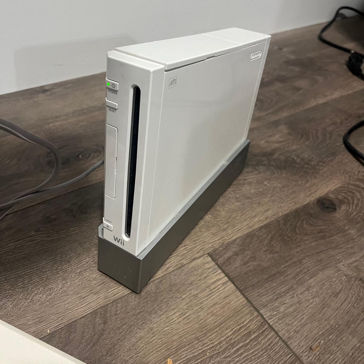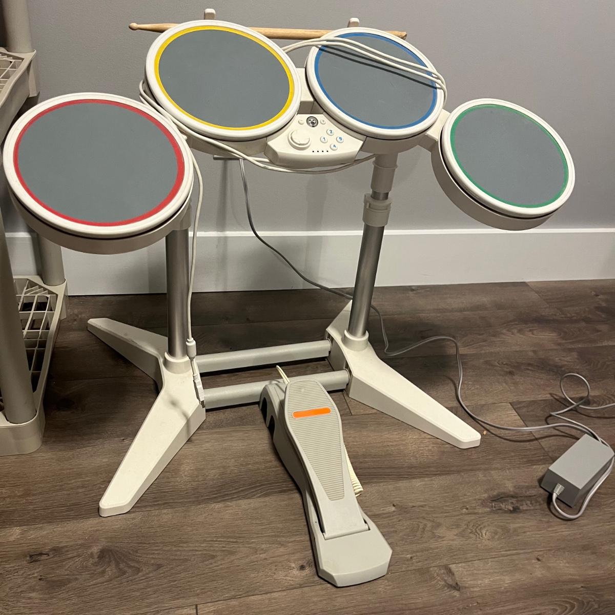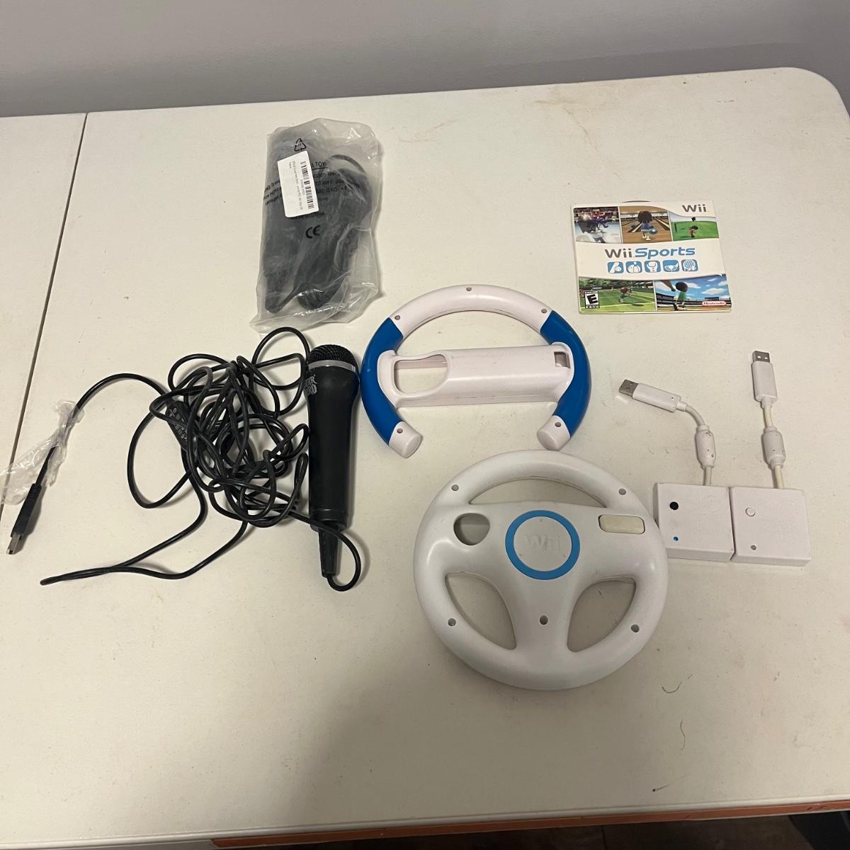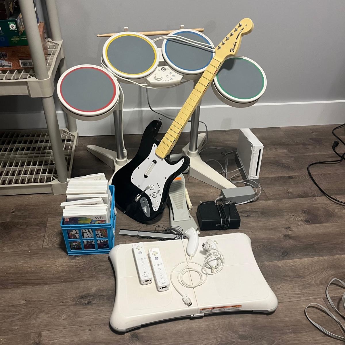 Lot includes a Nintendo Wii with drum set, guitar, two controllers, Wii fit and a selection of games. Also includes a RF modulator. Also includes two microphones and steering wheels. Wii powered on when plugged in.