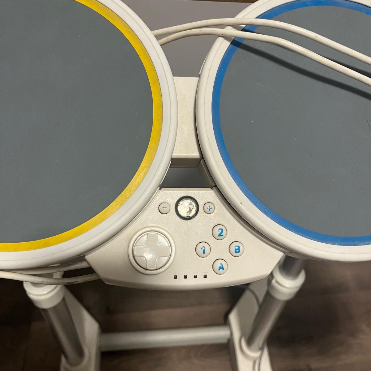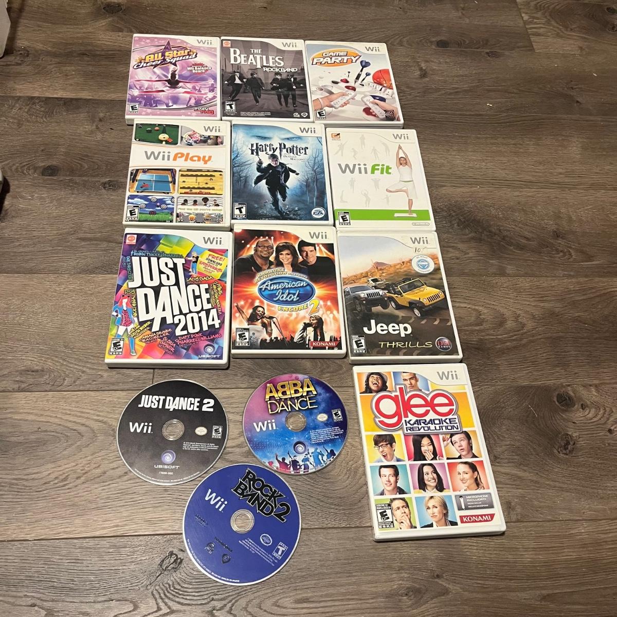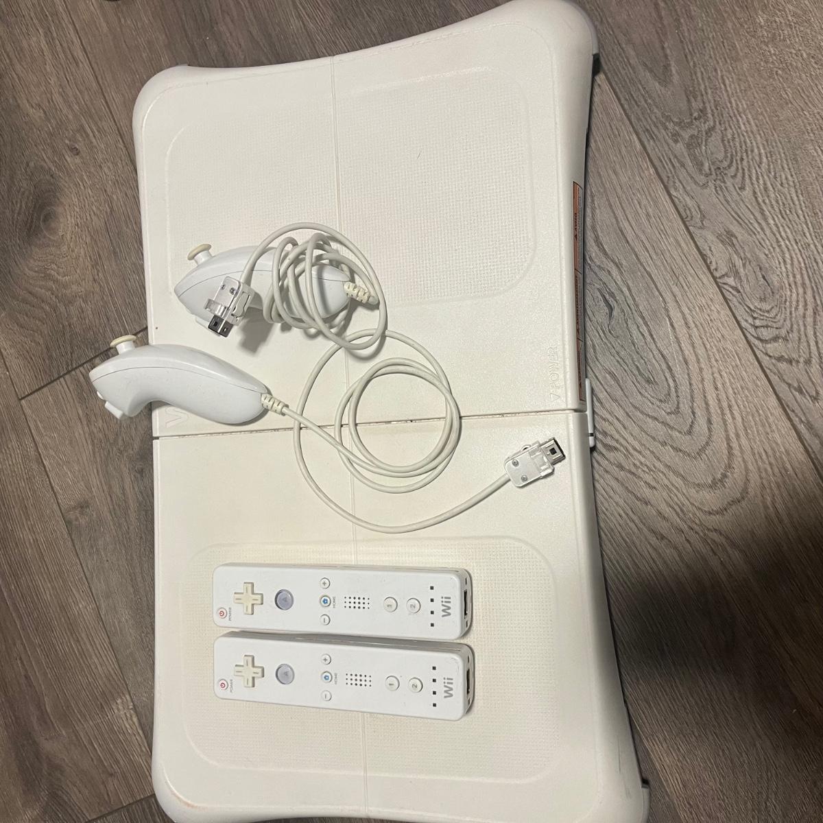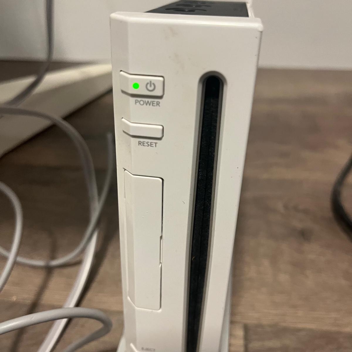 Lot includes a Nintendo Wii with drum set, guitar, two controllers, Wii fit and a selection of games. Also includes a RF modulator. Also includes two microphones and steering wheels. Wii powered on when plugged in.