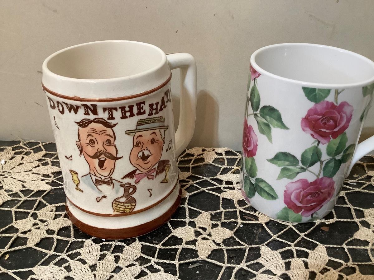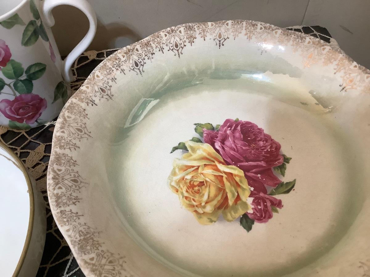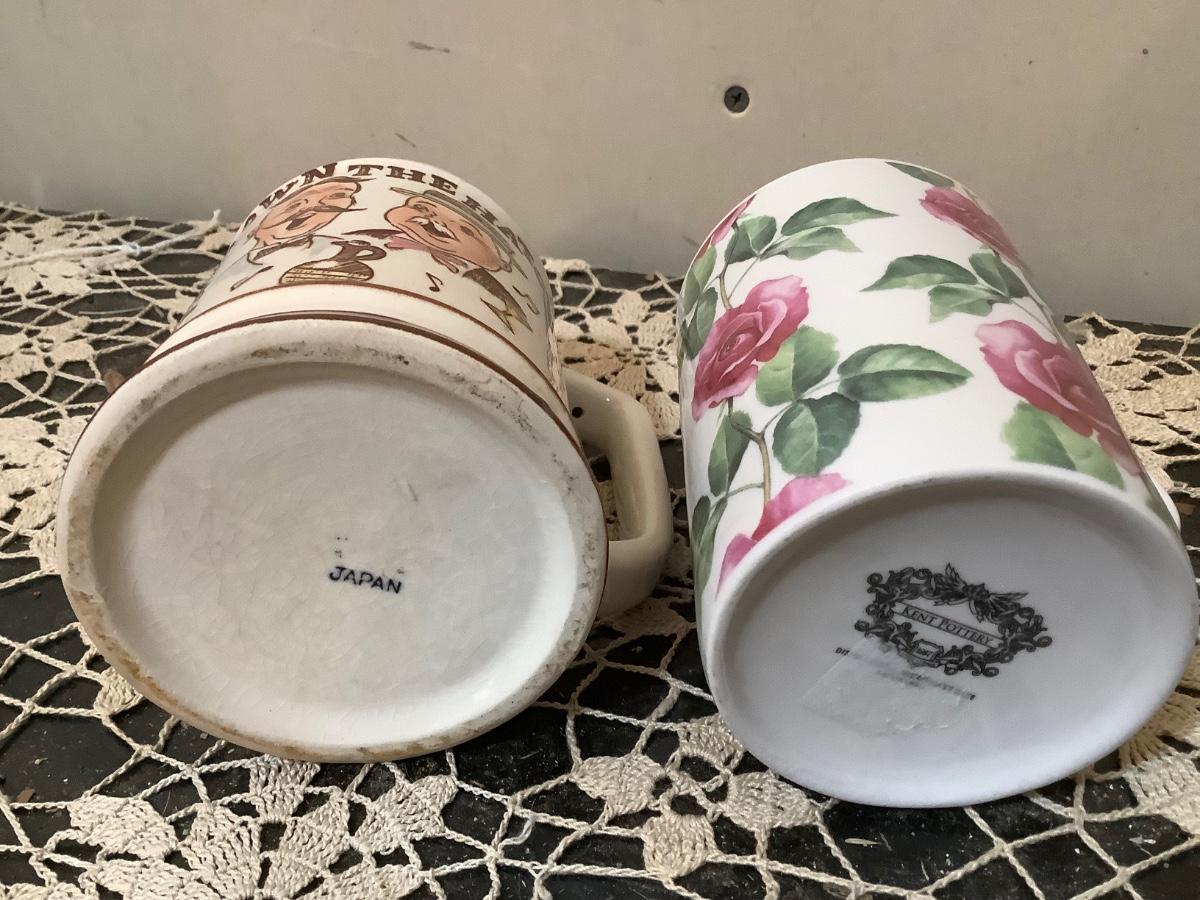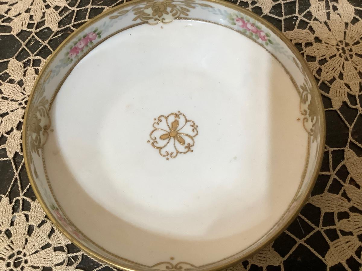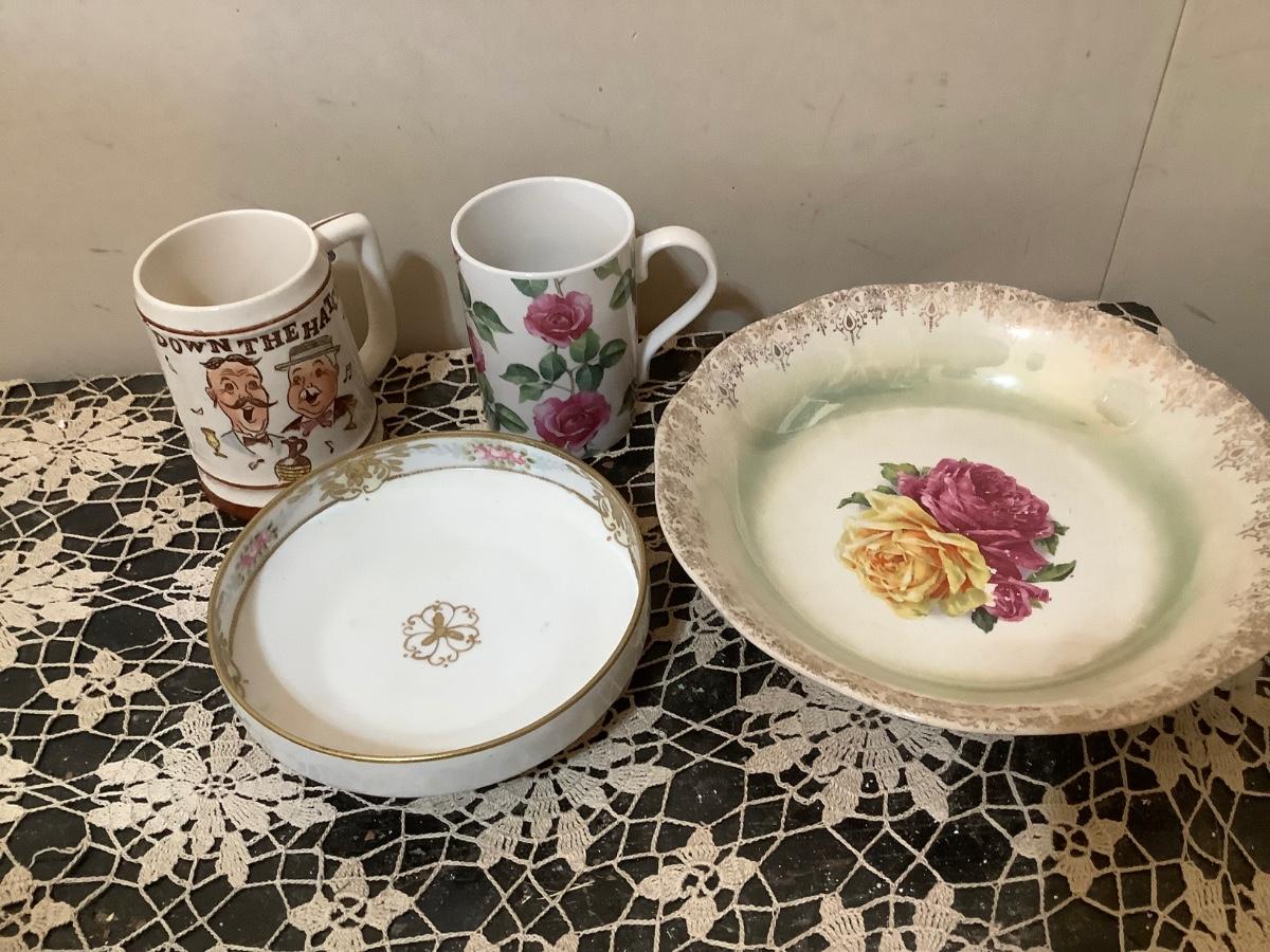 You get a very nice footed Nippon round tray, flowered bowl, and two nice mugs. One is Japan the other is Kent Pottery.