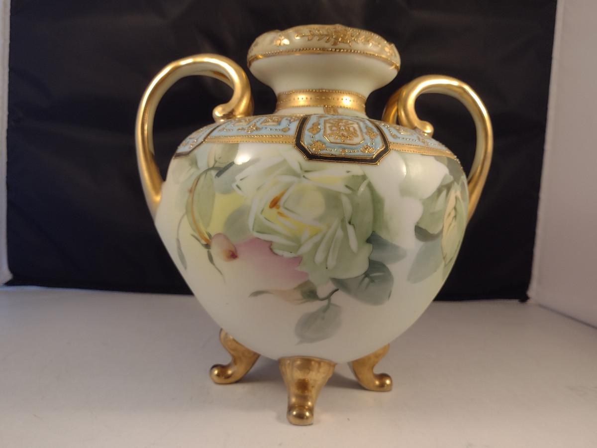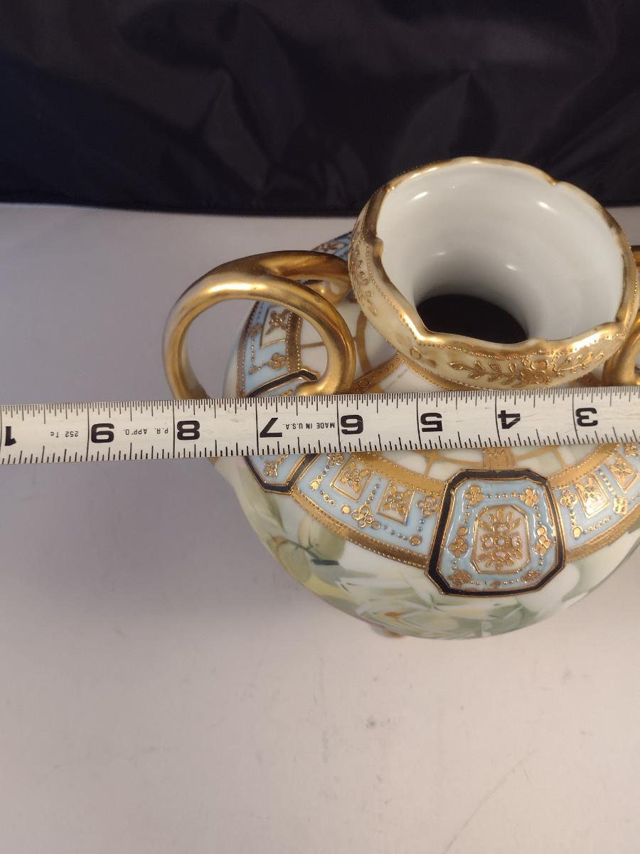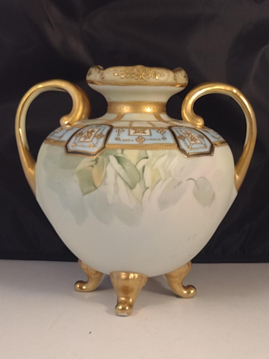 Nippon Hand Painted Footed Vase with Gilt and Floral Accents- Approx 8" Tall