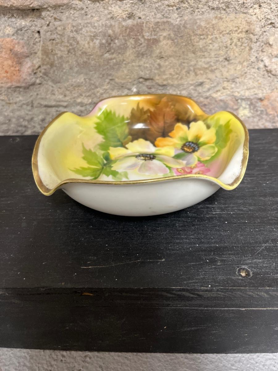 Triangulated bowl, square edged bowl and pair of signed 6 1/2” plates