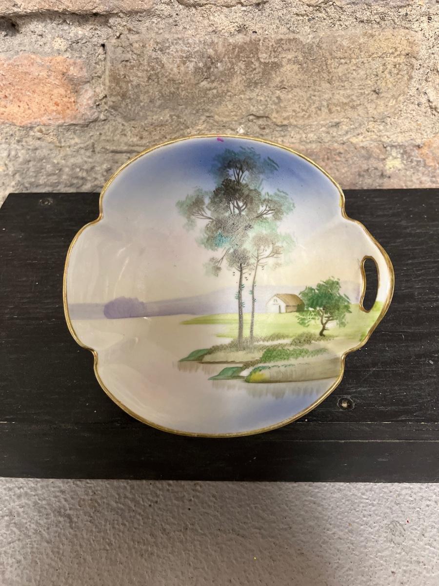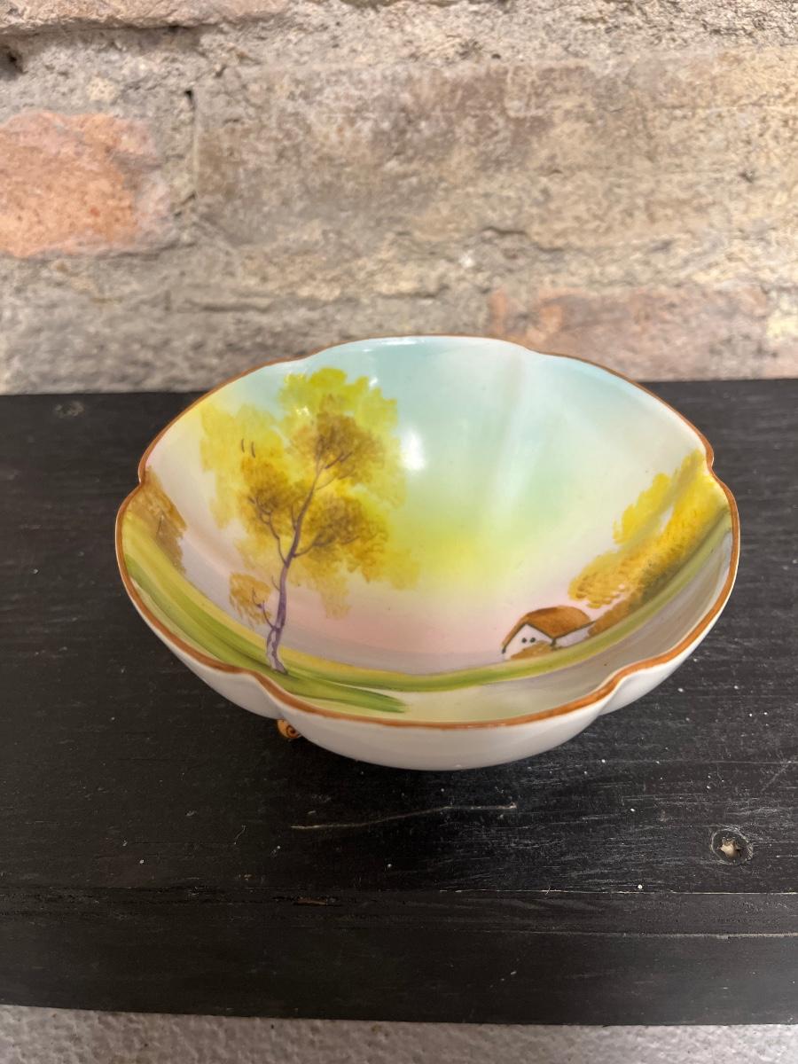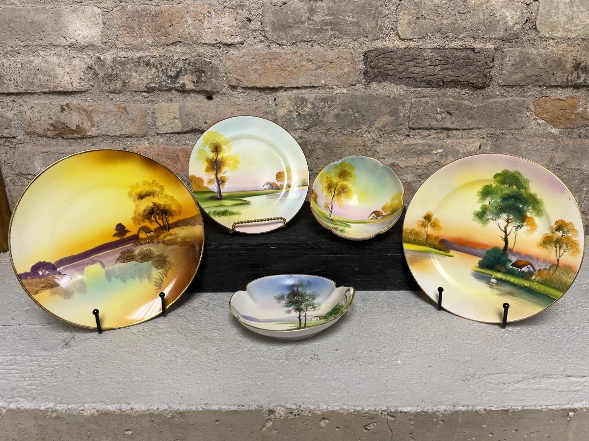 Beautiful pieces! 3 toed nut dish, single-handled tidbit, two 7 3/4” plates and. One 6 1/2” plate, all hand painted