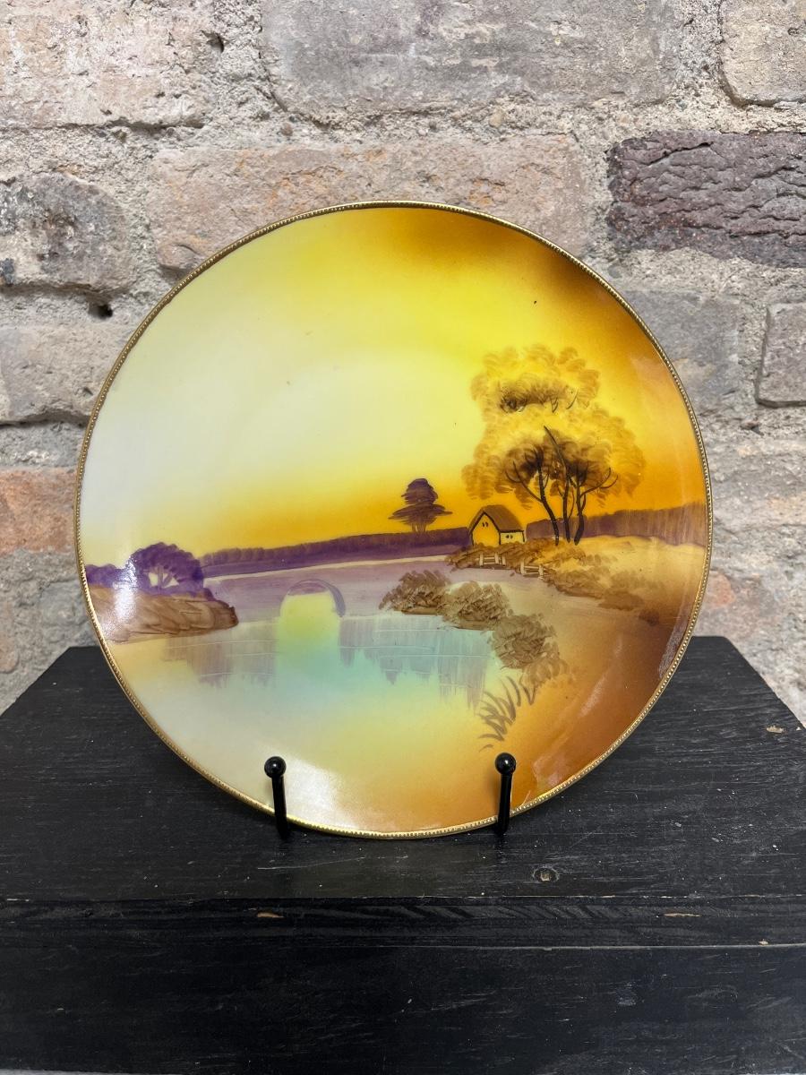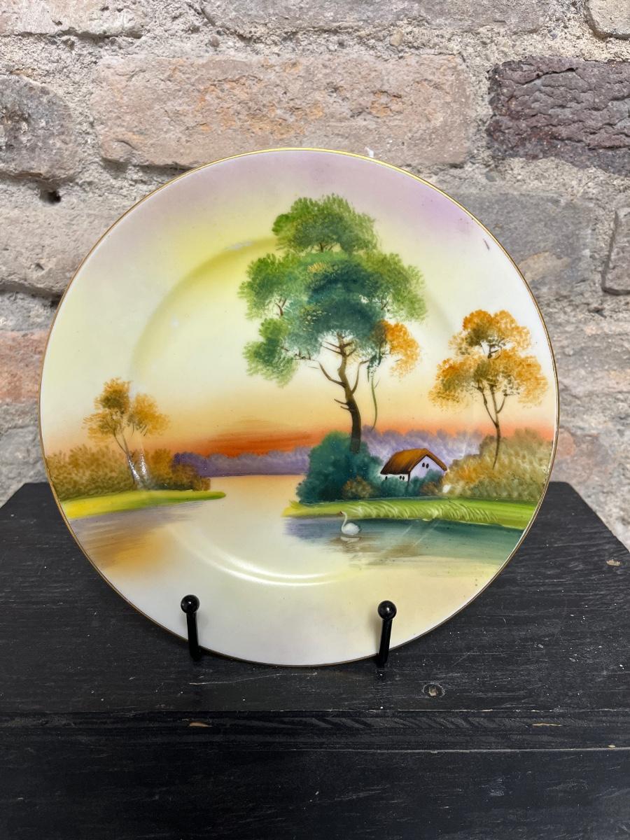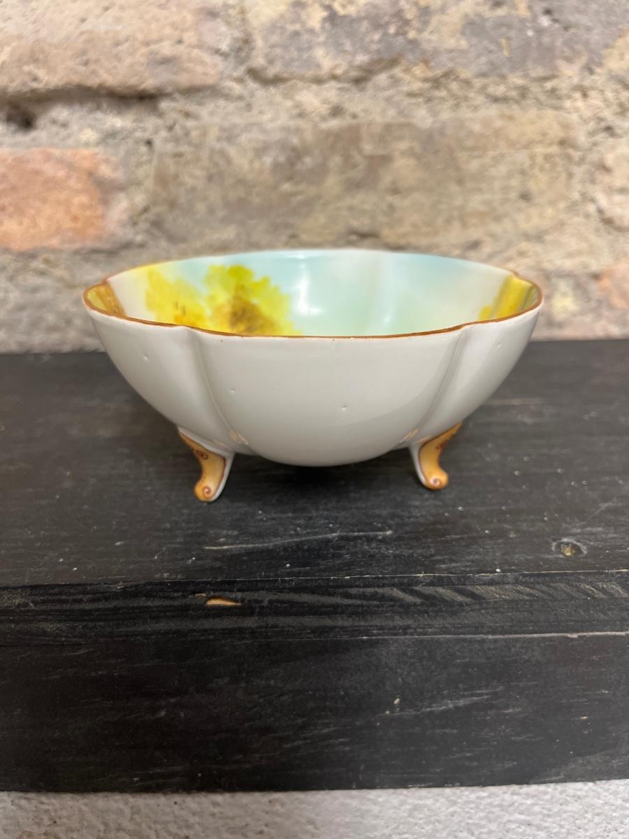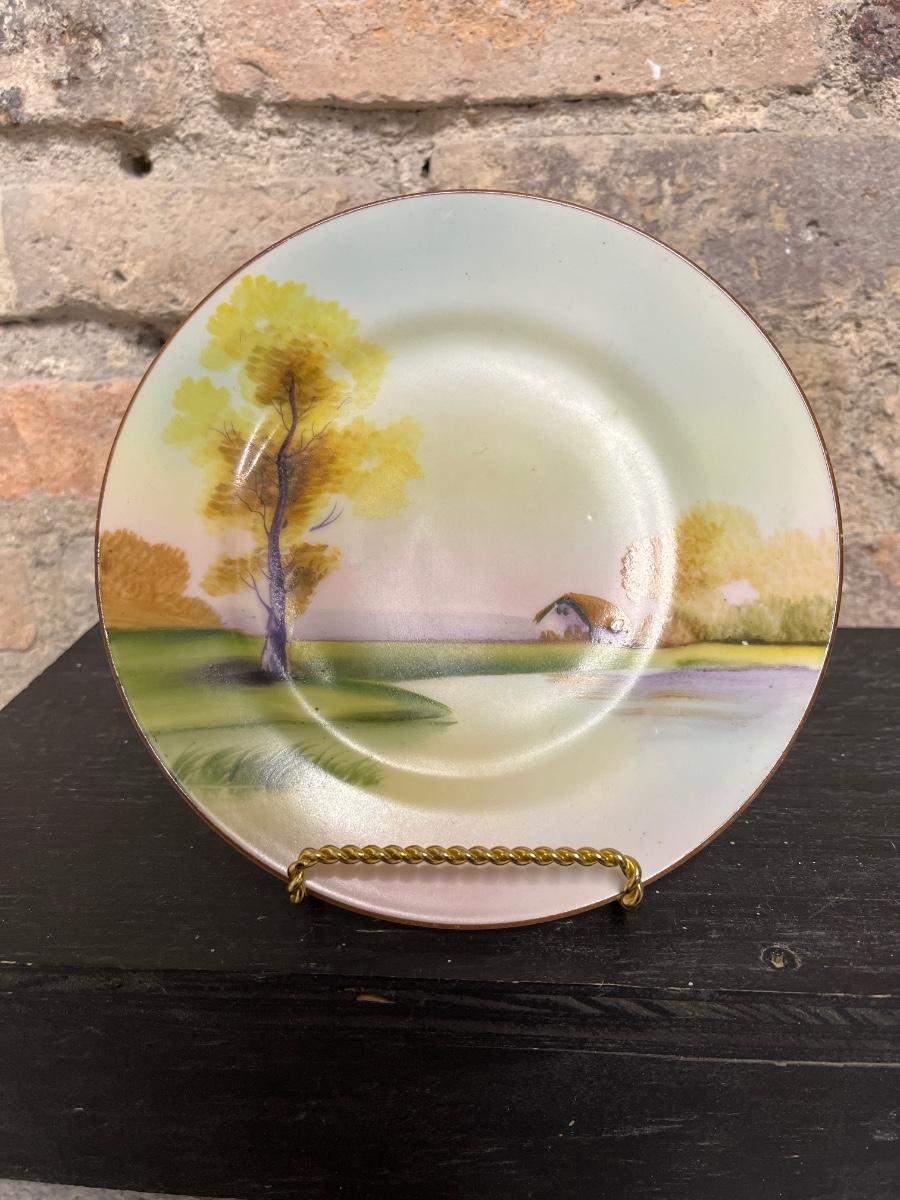 Beautiful pieces! 3 toed nut dish, single-handled tidbit, two 7 3/4” plates and. One 6 1/2” plate, all hand painted