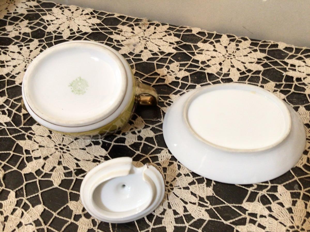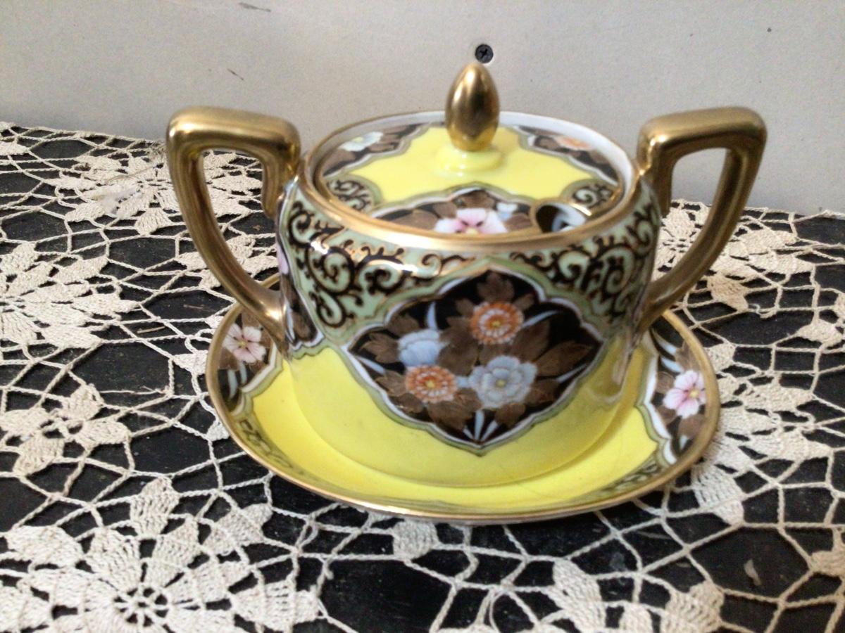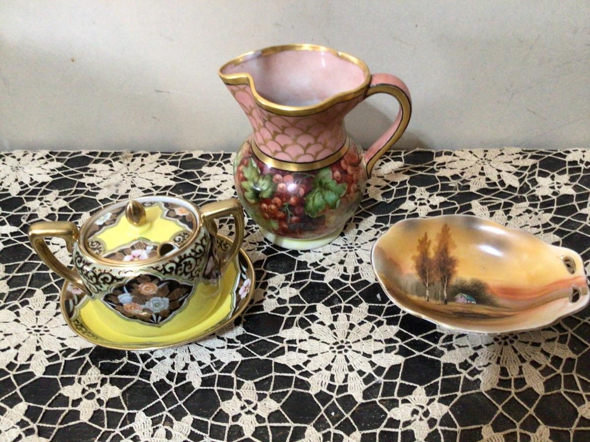You get a great Nippon sugar bowl with cover and tray, Noritake small tray, and a nice pitcher with fruit design. They are all in great condition.