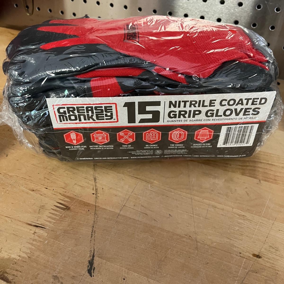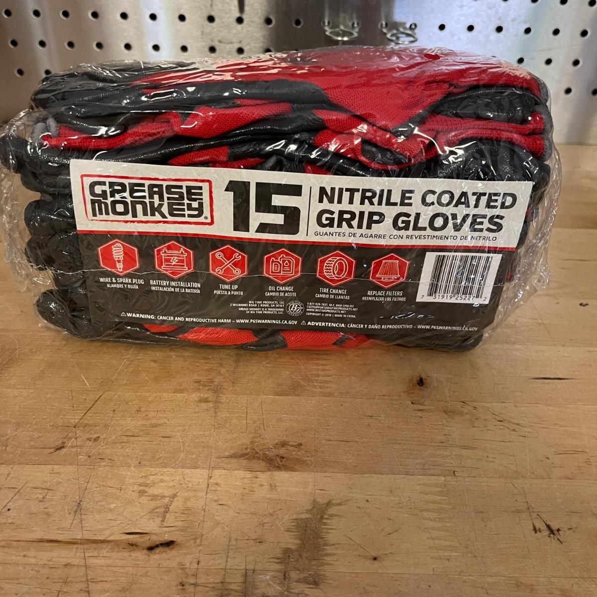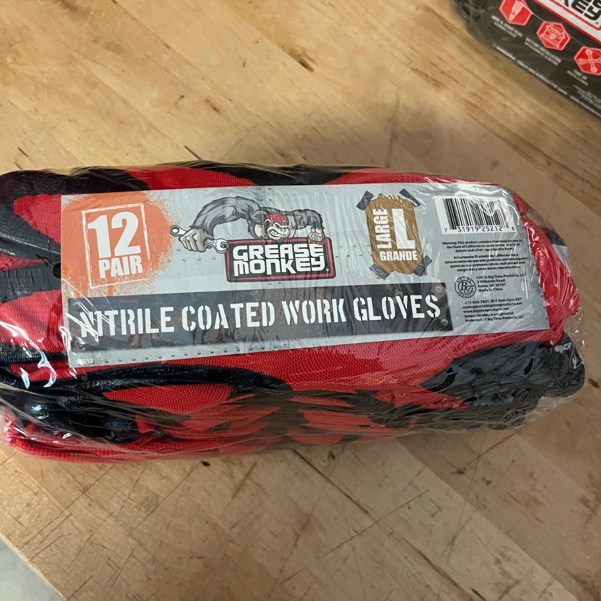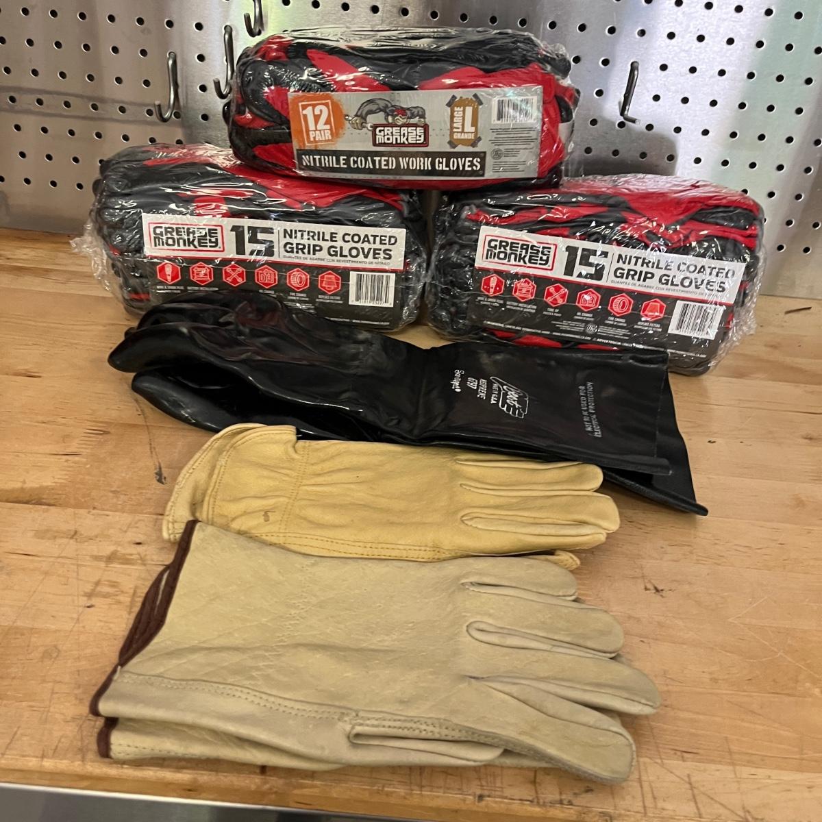 Lot includes 42 NIB nitrile coated gloves, two pair of used leather work gloves and a pair of plastic coated used gloves.
