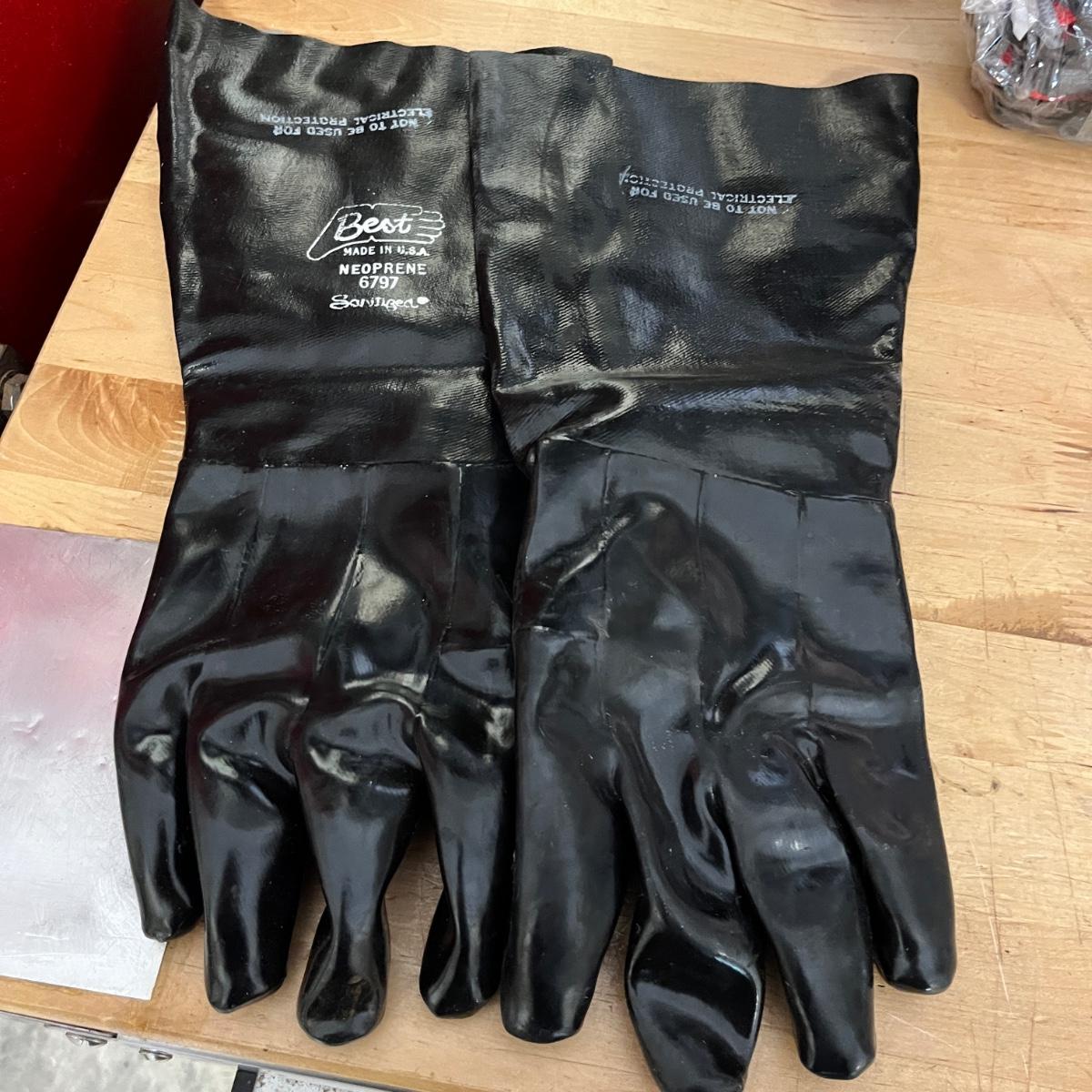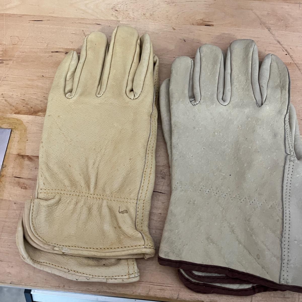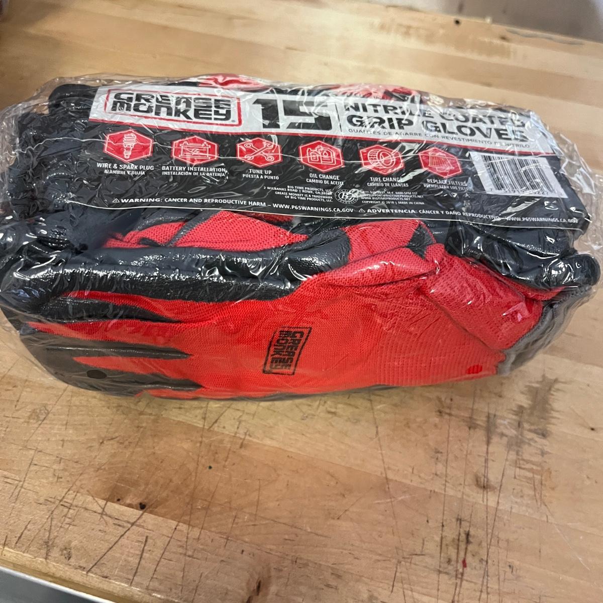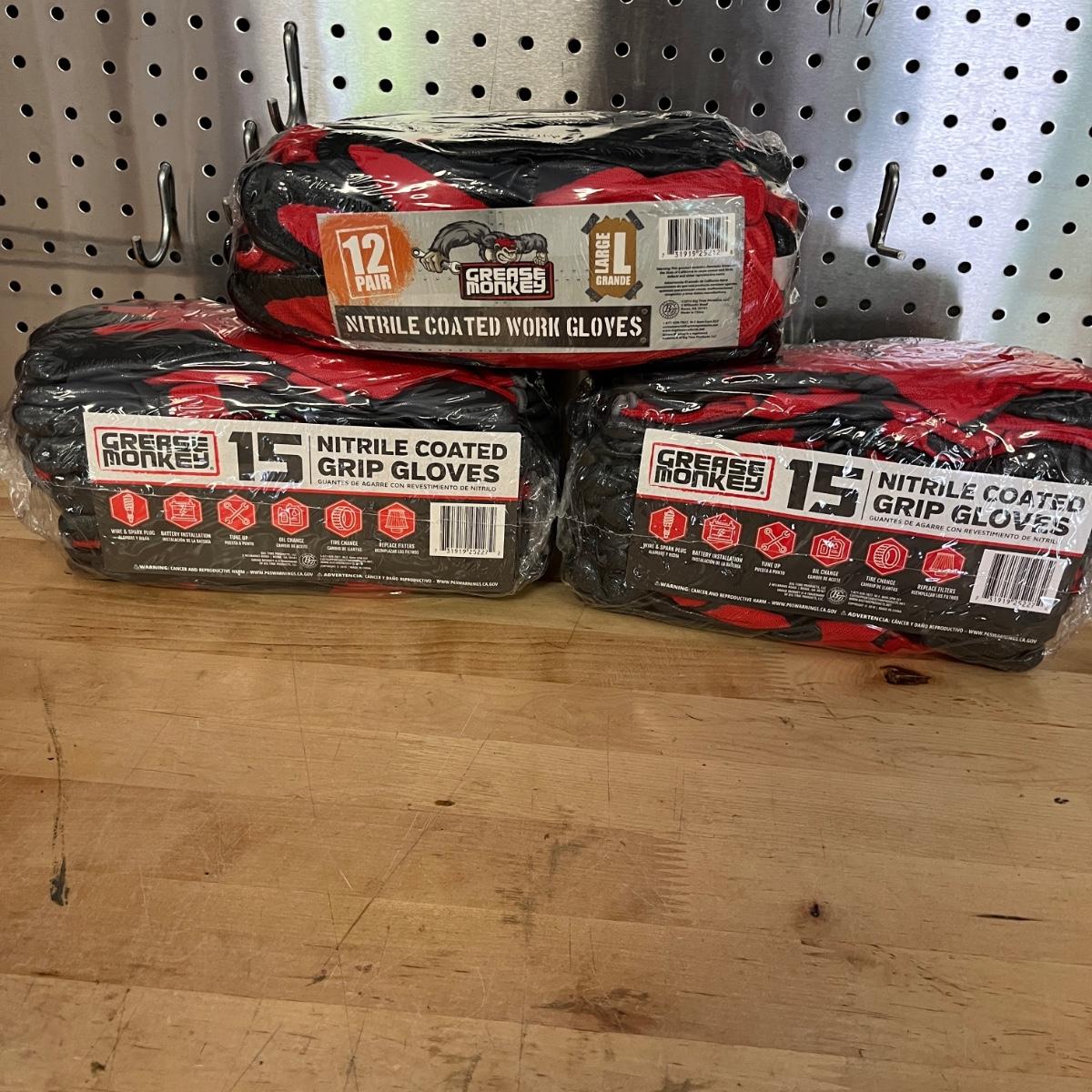 Lot includes 42 NIB nitrile coated gloves, two pair of used leather work gloves and a pair of plastic coated used gloves.