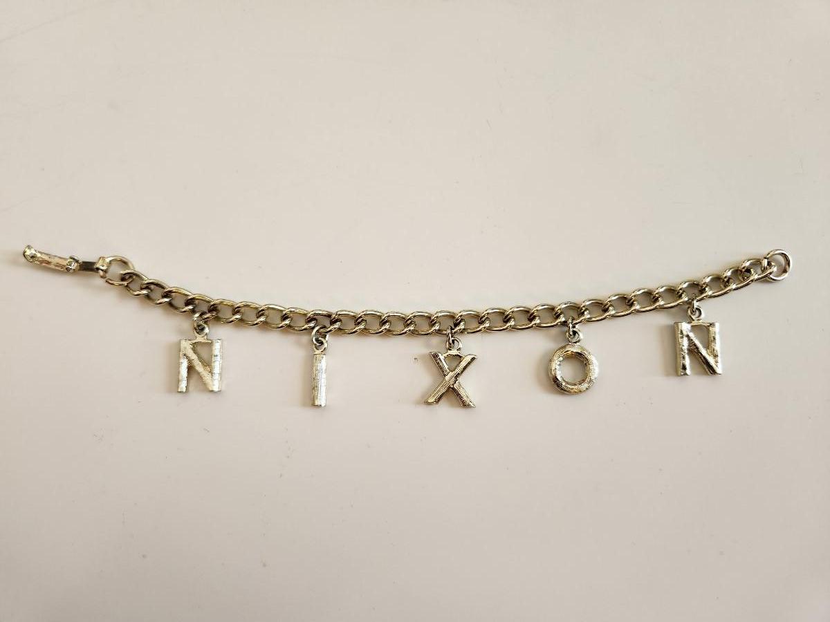 This lot is for a grouping of Nixon 1992 Campaign Items. This lot includes a nifty Nixon bracelet in a goldtoned metal and two small label pins. Very unusual.