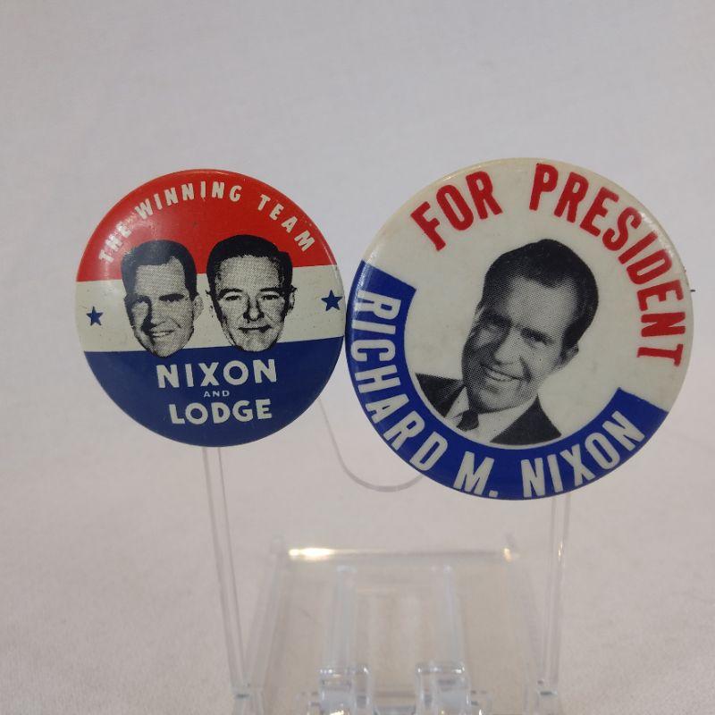 Here is one for the Nixionites. The Nixon and Lodge Button measures 1 1/2-inches in diameter, the "For President" Button measures 1 3/4-inches diameter. Both are in very good condition for their age - not reproductions.