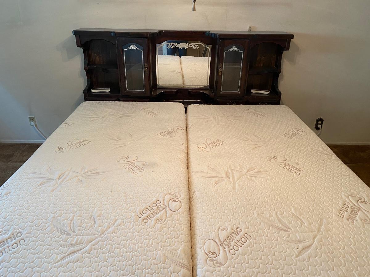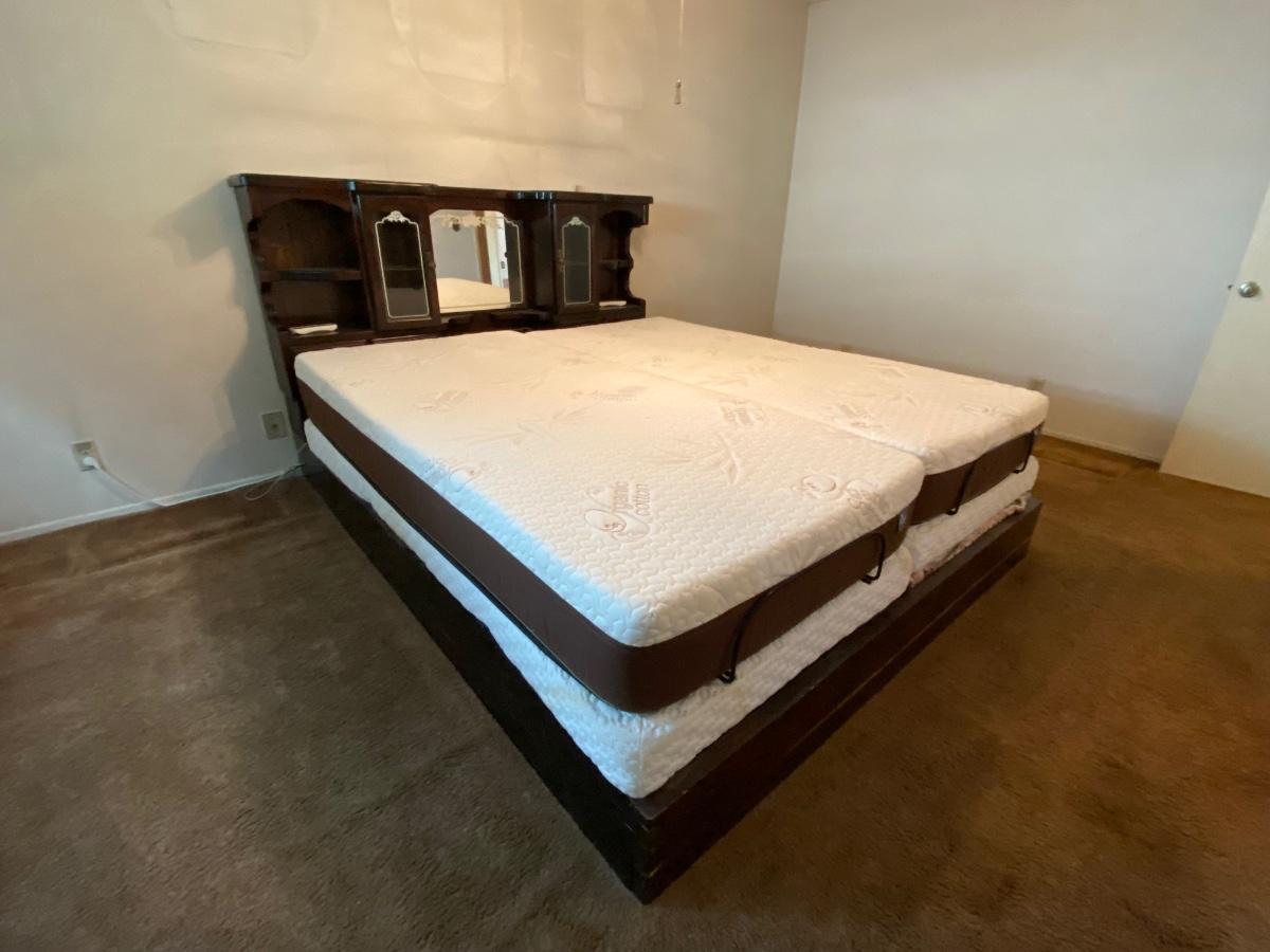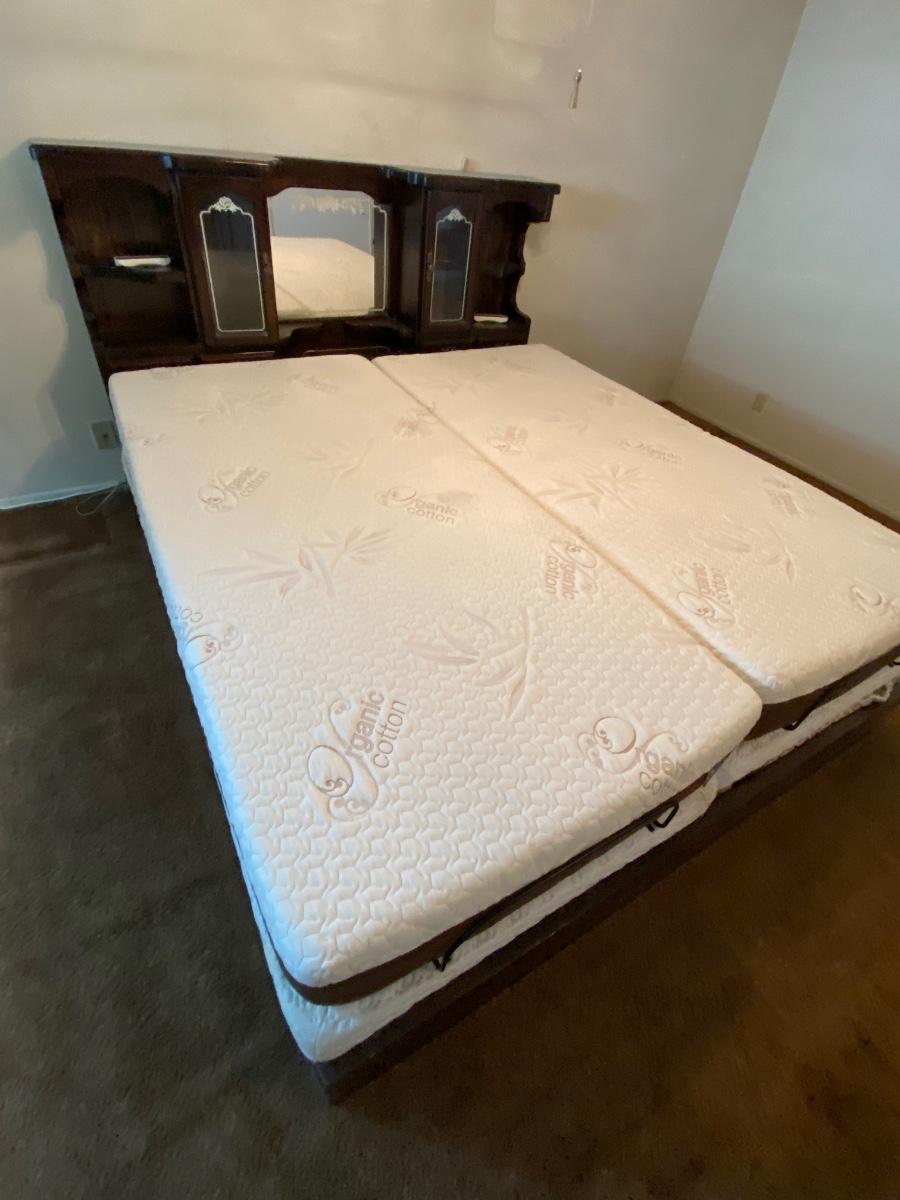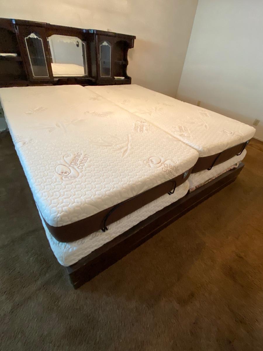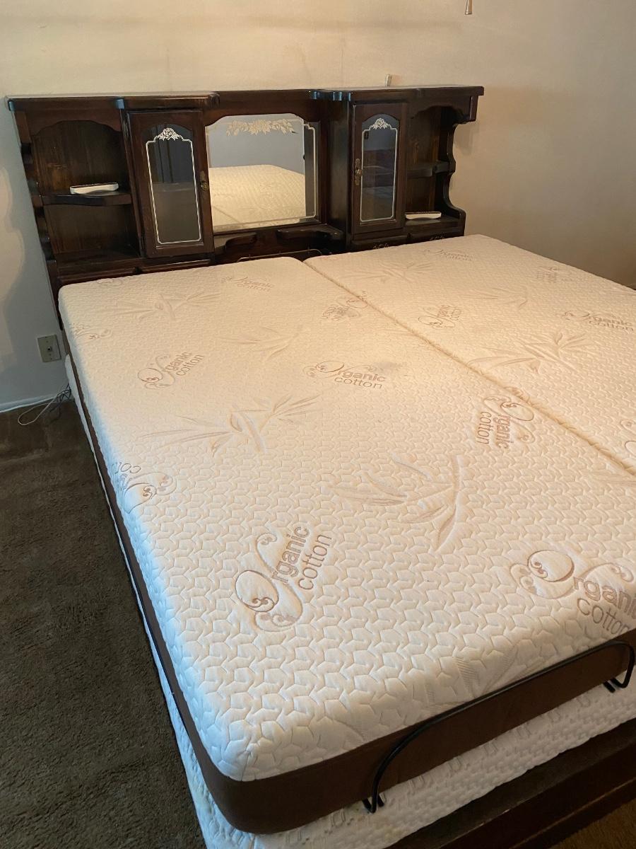 King Sized Adjustable Bed with Dark Wood Captains Headboard. Dual adjustable mattress with remote for each side. Mattresses are in good condition. Headboard has glass door cabinets, mirrored center and small drawers.