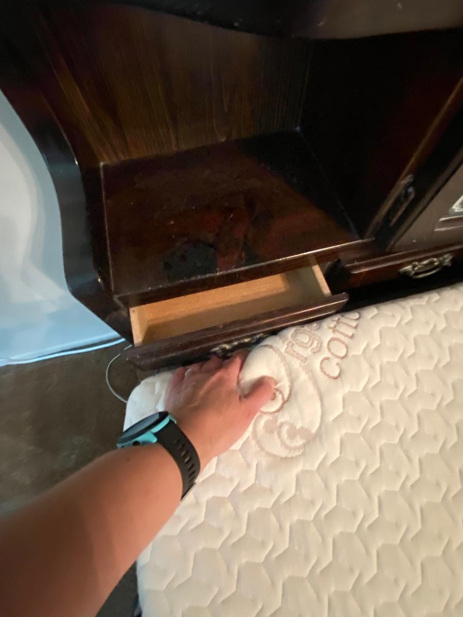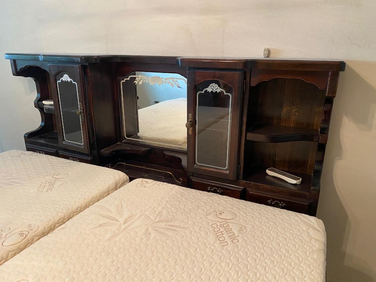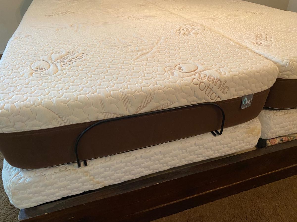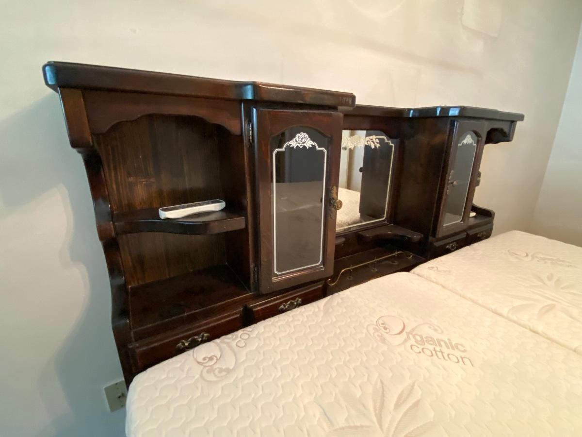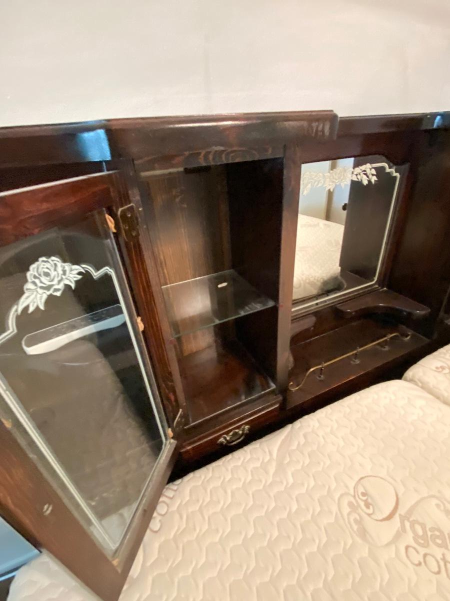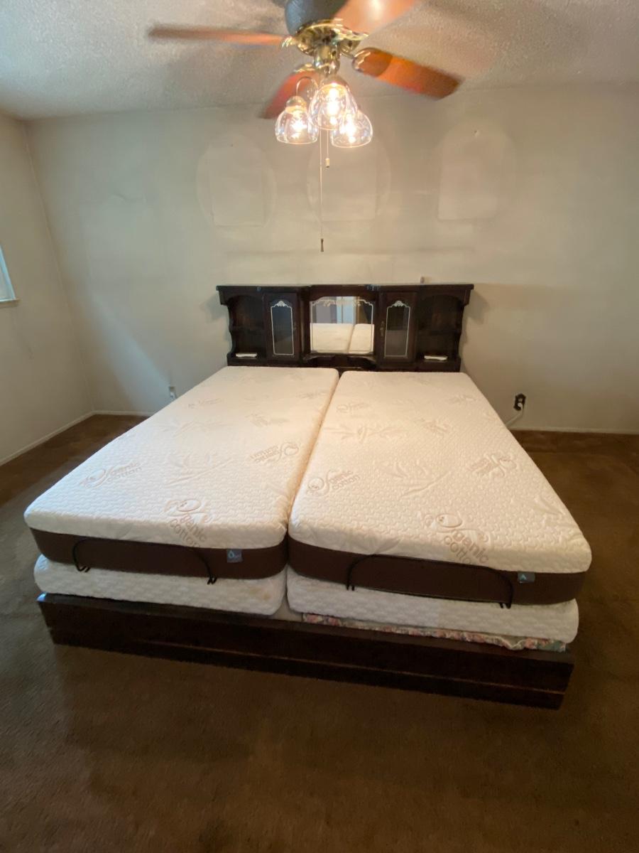 King Sized Adjustable Bed with Dark Wood Captains Headboard. Dual adjustable mattress with remote for each side. Mattresses are in good condition. Headboard has glass door cabinets, mirrored center and small drawers.