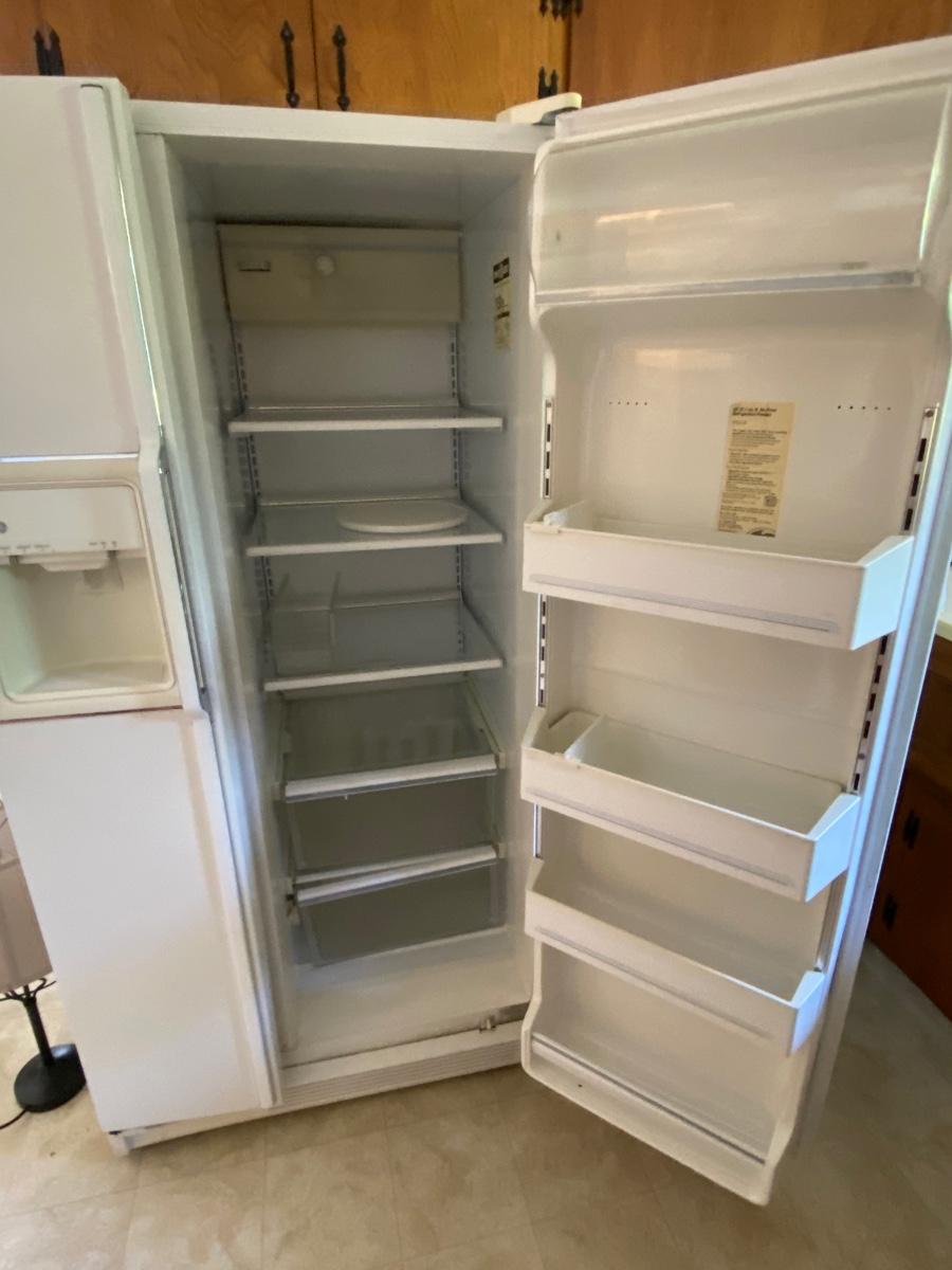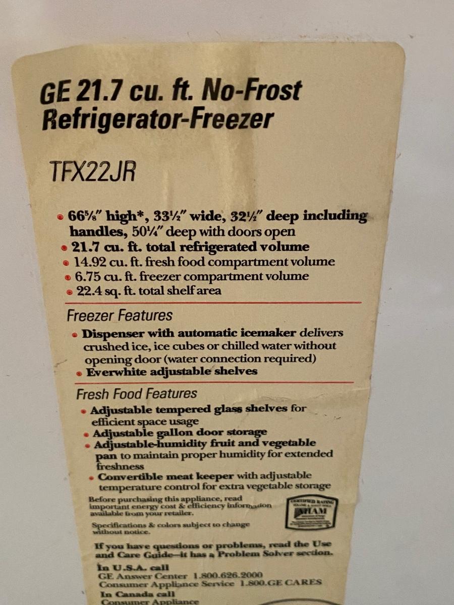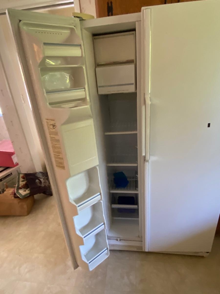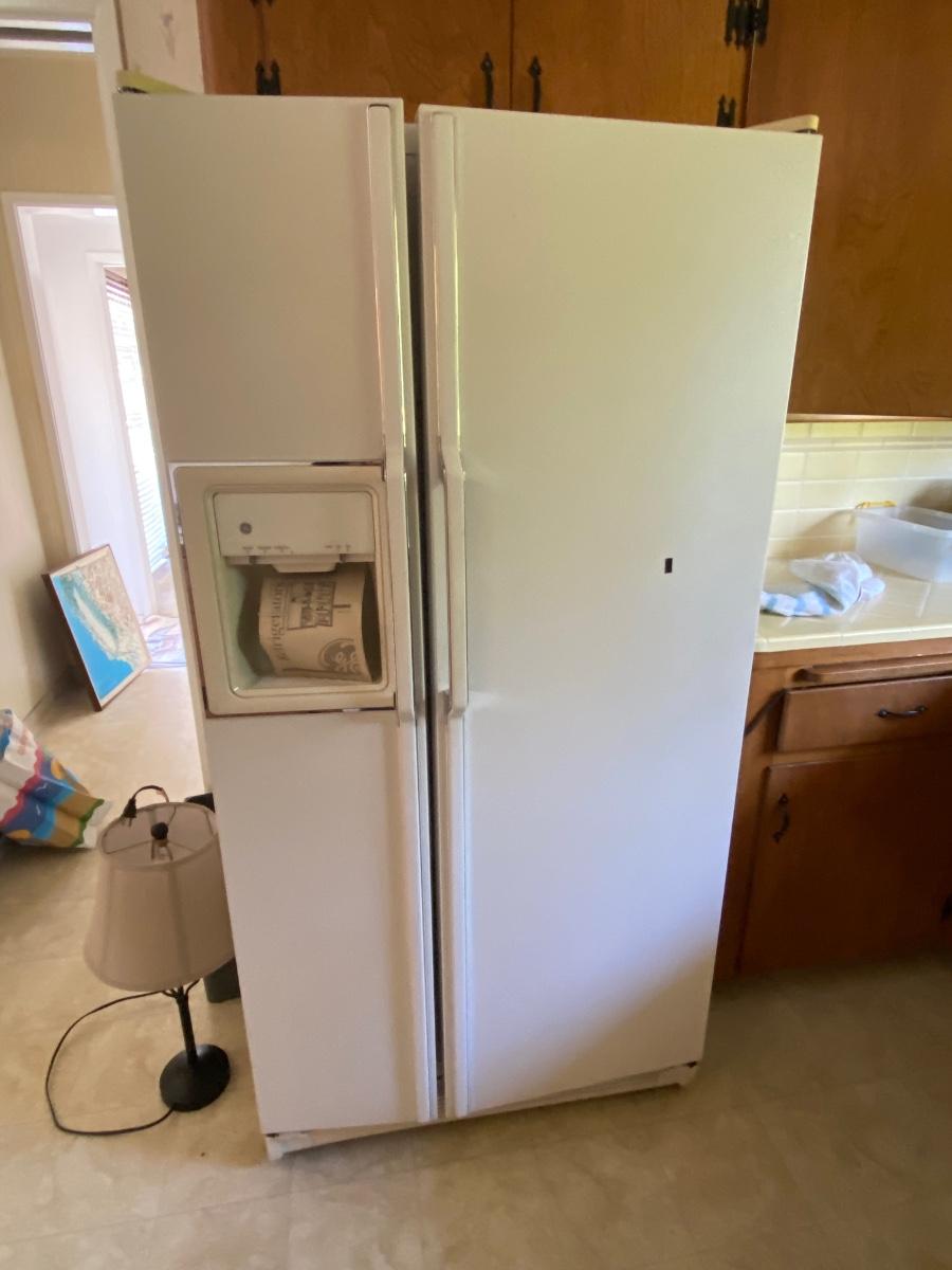 White GE 21.7 cu ft No Frost Side by Side Refrigerator Freezer. Has been unplugged. Good used condition.