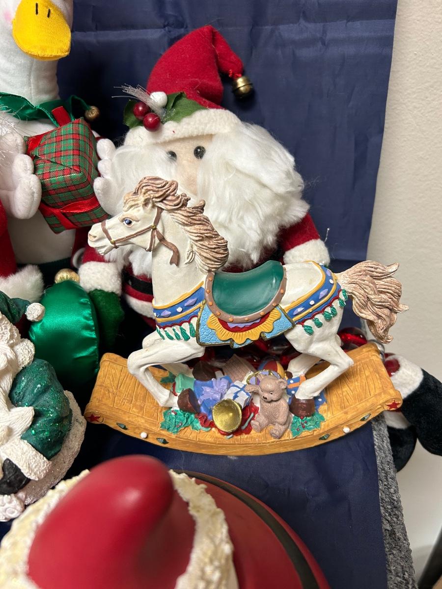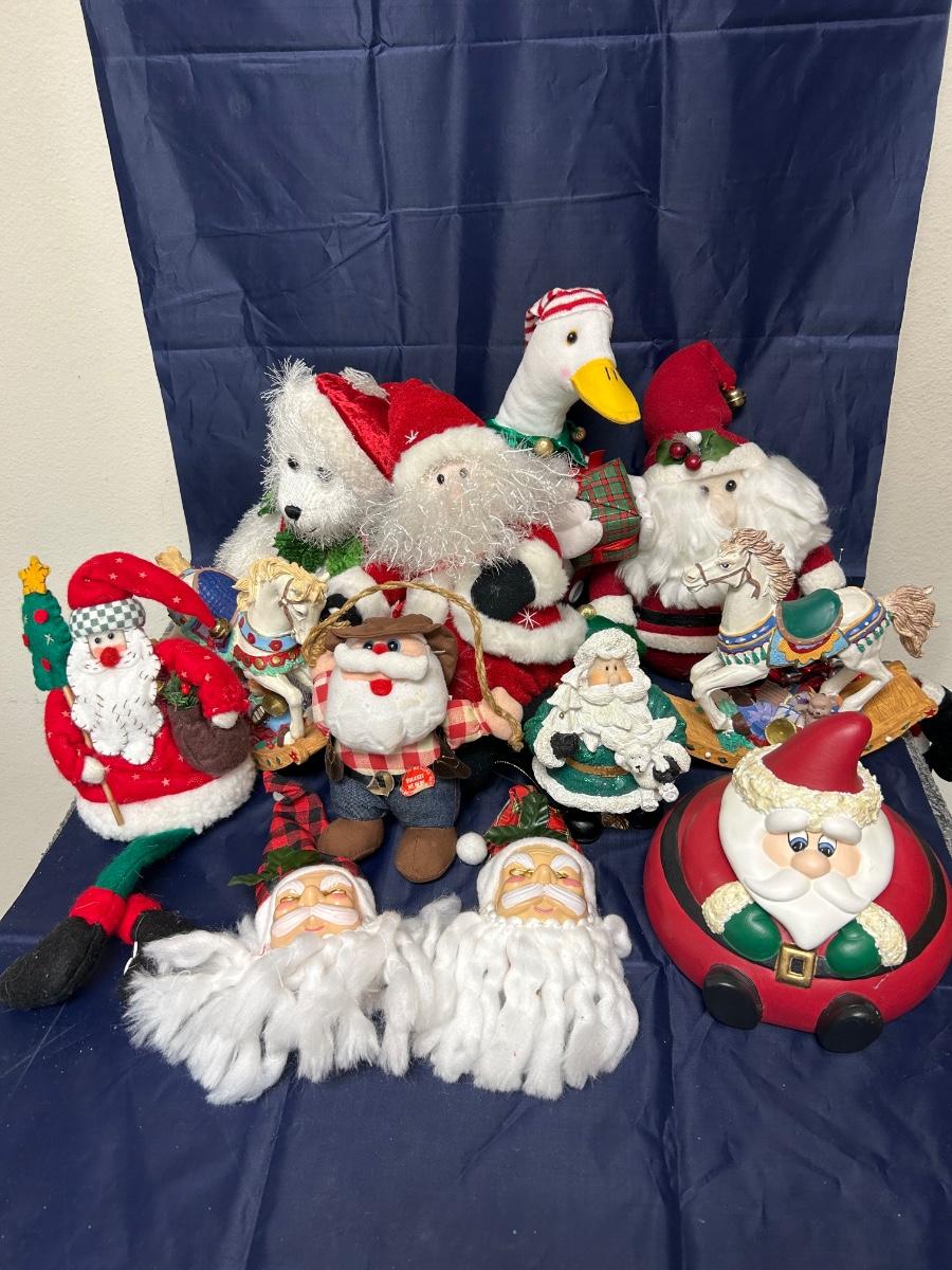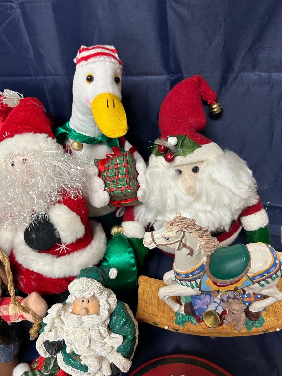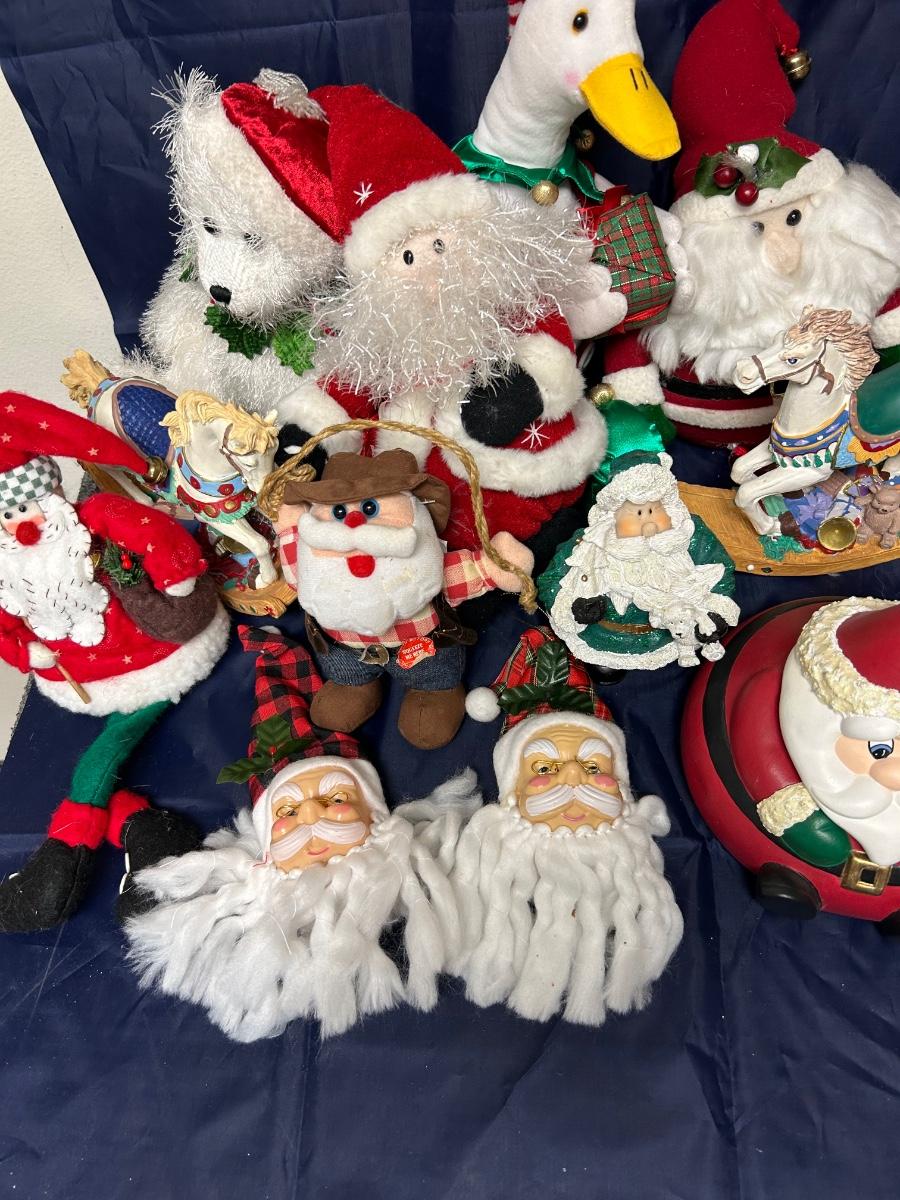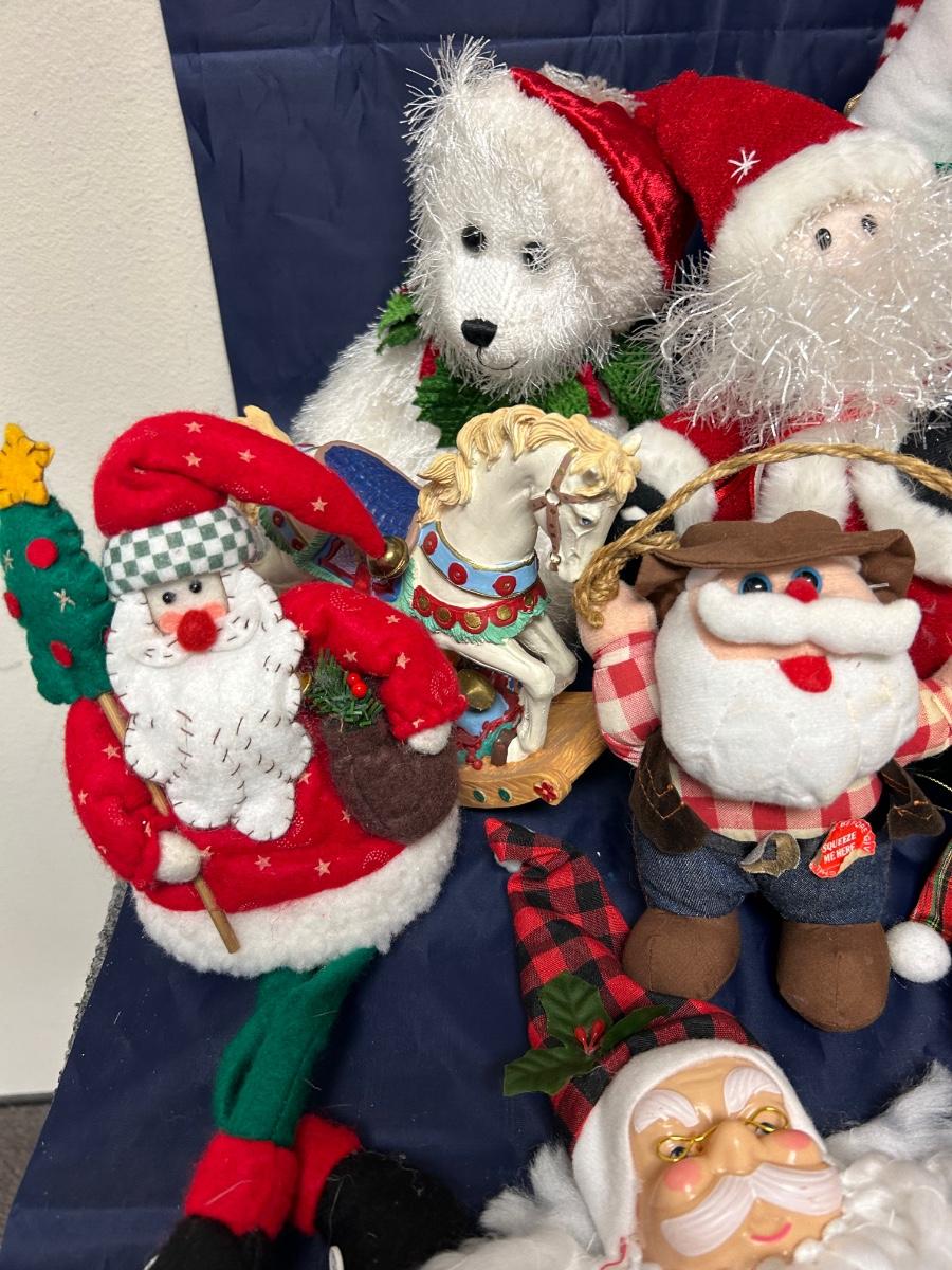 Mixed Christmas Holiday Plush and Figurine Lot. In good condition. Small rodeo Santa works when you push his hand.