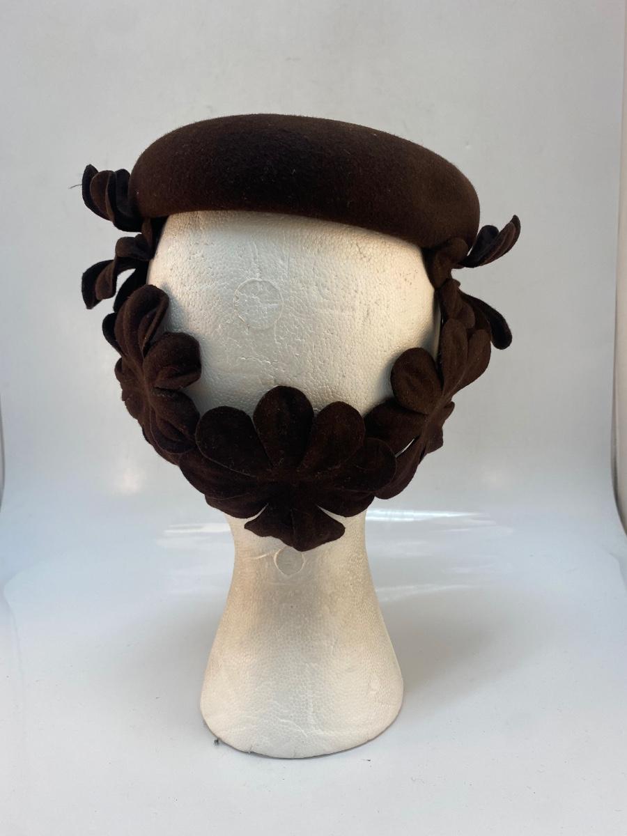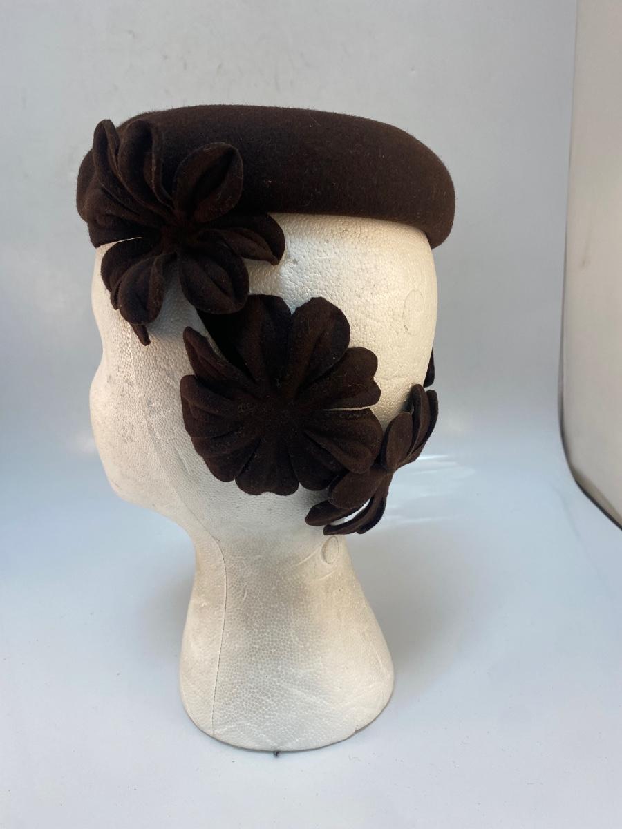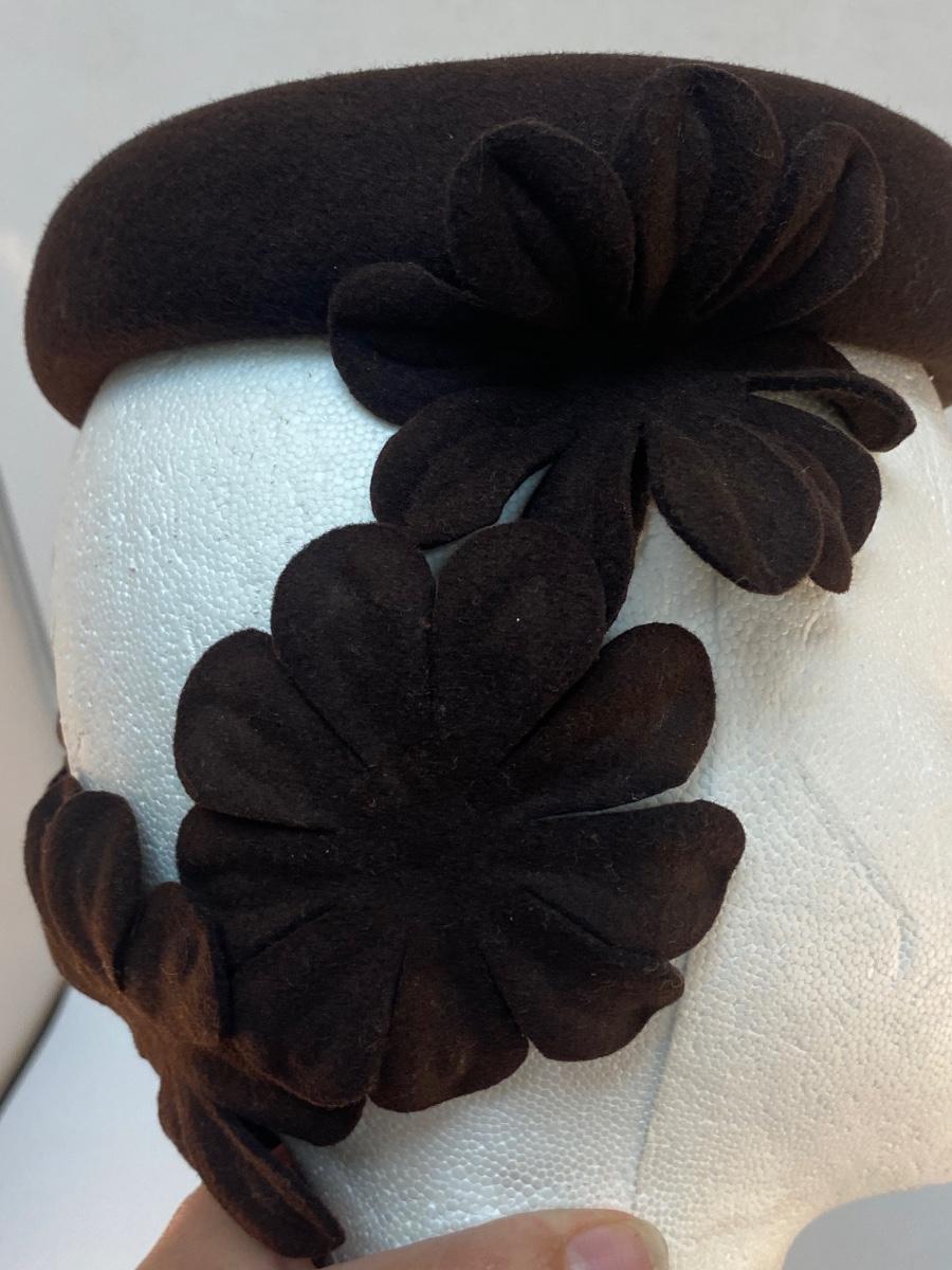 Vintage Dark Brown Wool Skullcap Fascinator with Cut Out Flowers. In good condition. There is a very light bit of makeup smudge along the inside front.