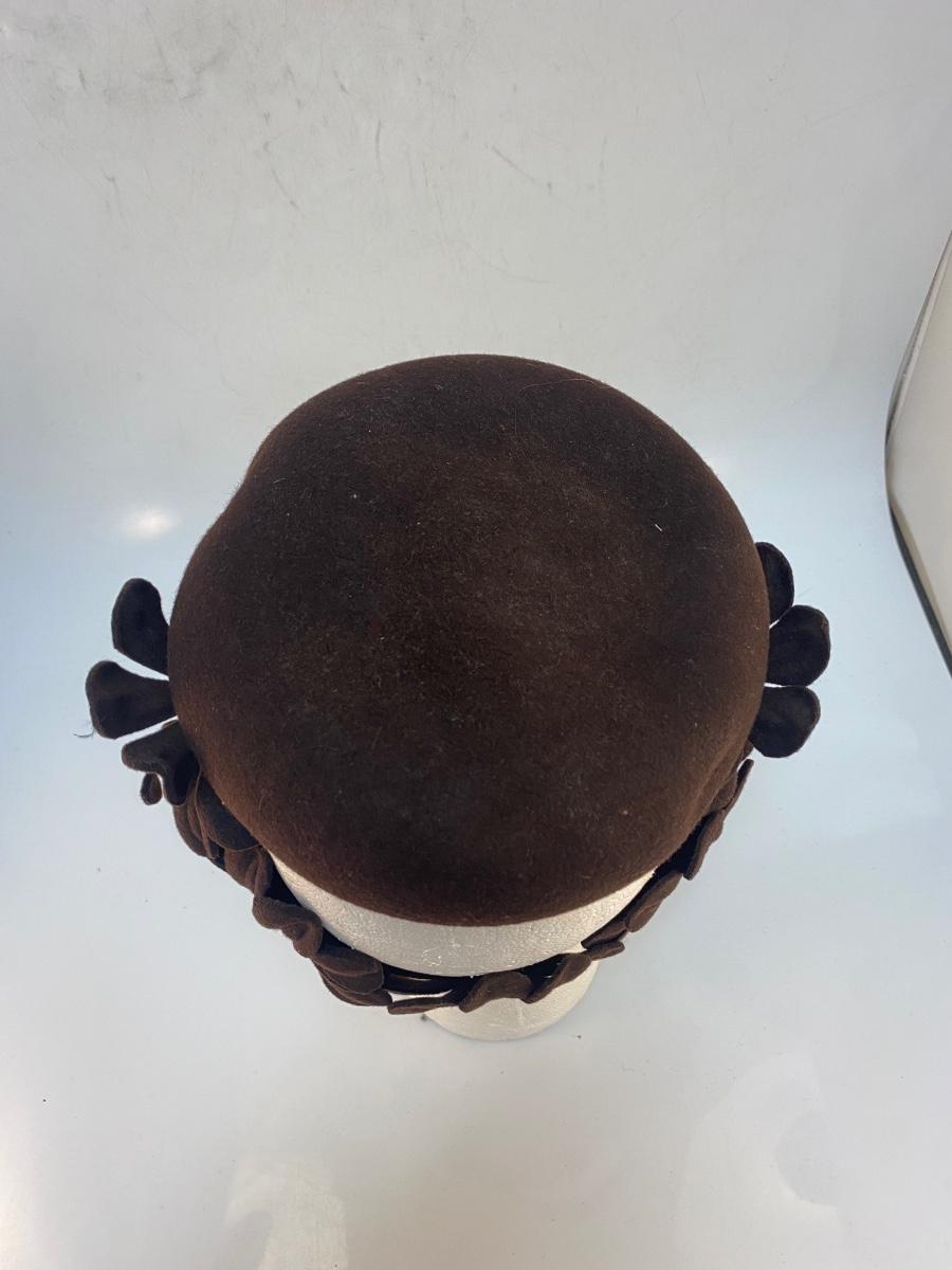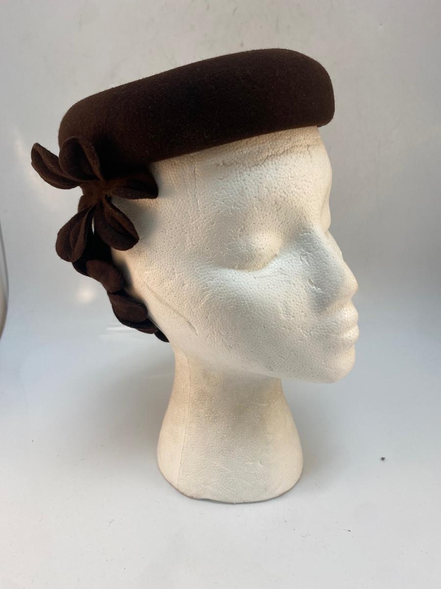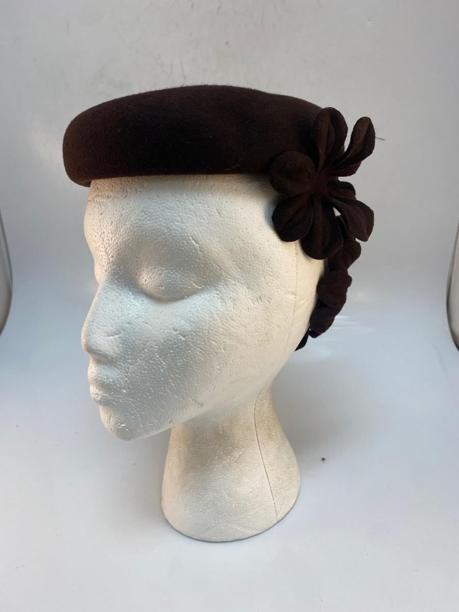Vintage Dark Brown Wool Skullcap Fascinator with Cut Out Flowers. In good condition. There is a very light bit of makeup smudge along the inside front.