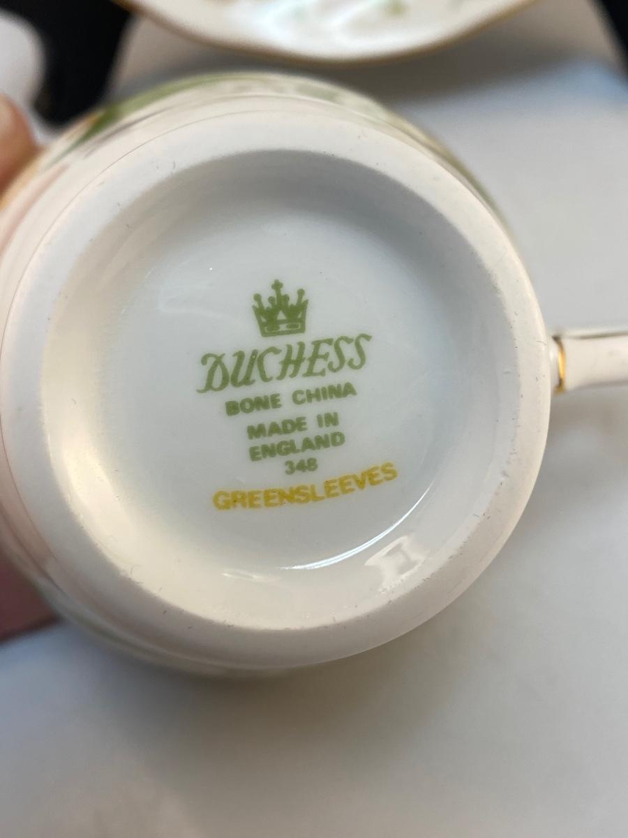 Vintage Duchess Bone China England Greensleeves Floral Pattern Teacup & Saucer. Gold gilt edge. In good condition, no chips or crazing.