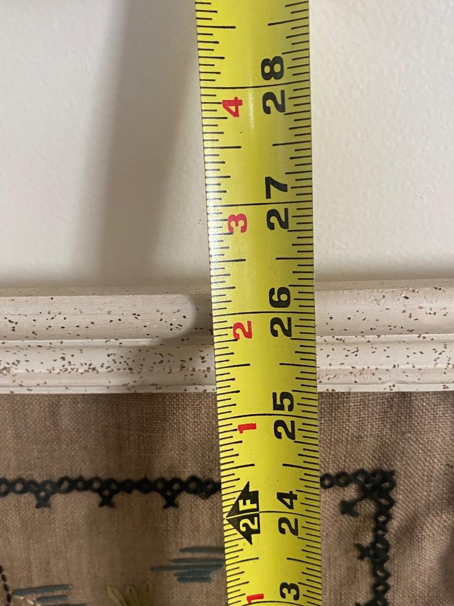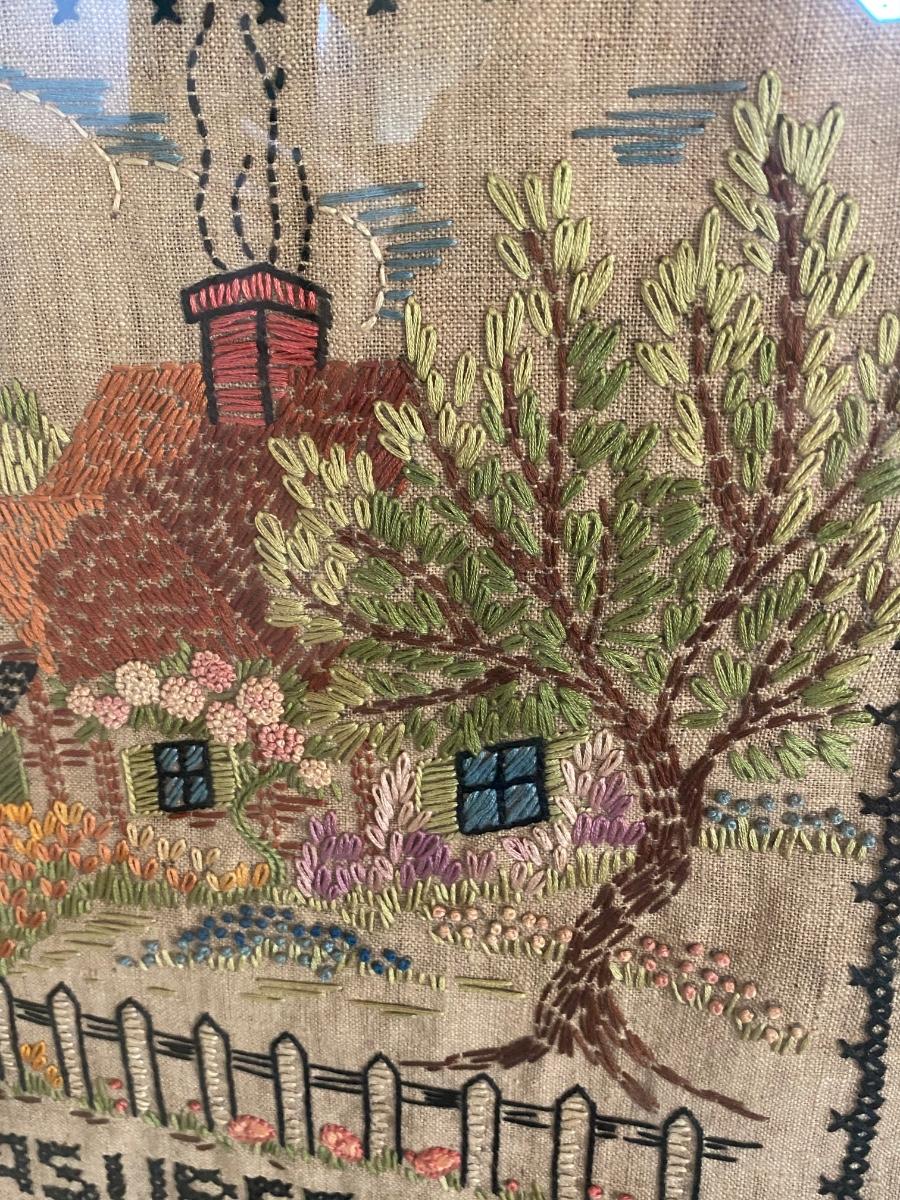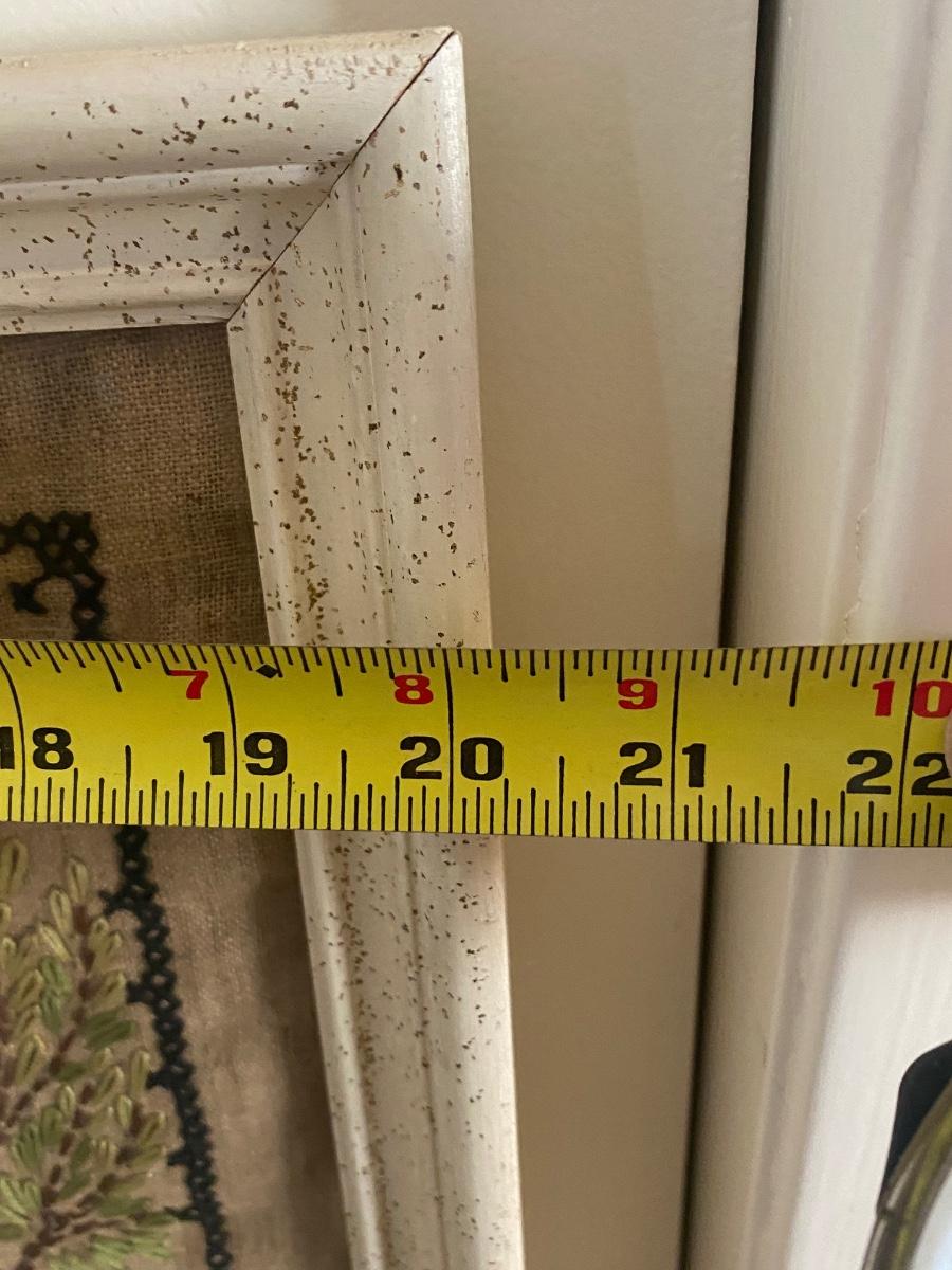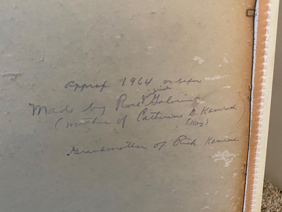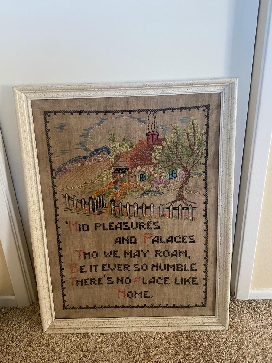 Vintage 1964 Handmade Cross Stitch Needle Point Tea Towel Framed Family Heirloom. Some discoloration from age. Note on who made it and date on the back. Nicely done needlecraft. About 20"x26".