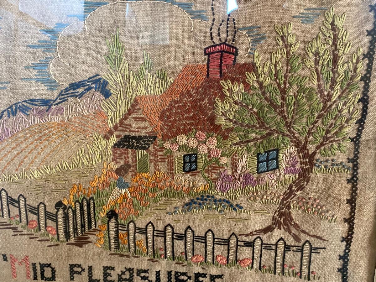 Vintage 1964 Handmade Cross Stitch Needle Point Tea Towel Framed Family Heirloom