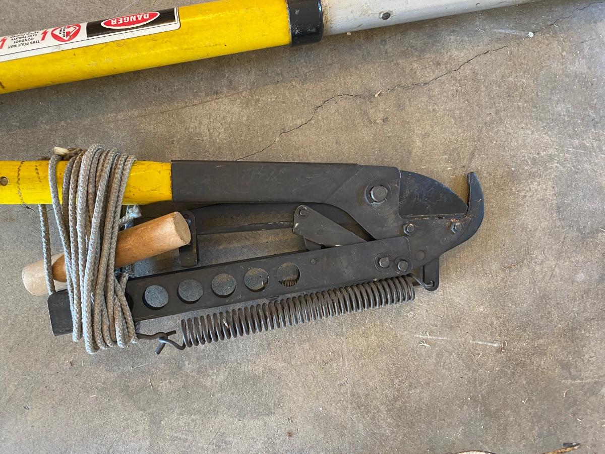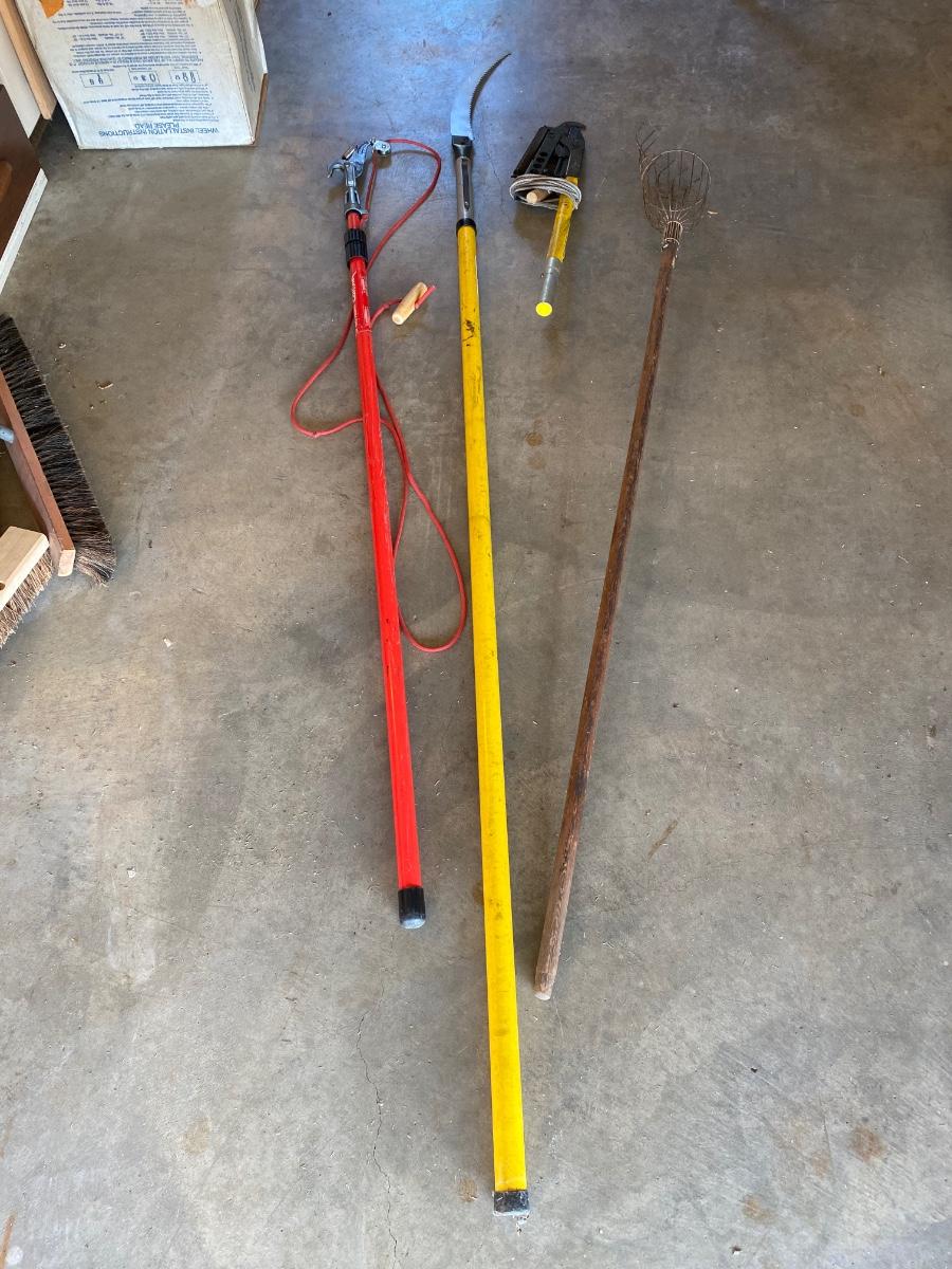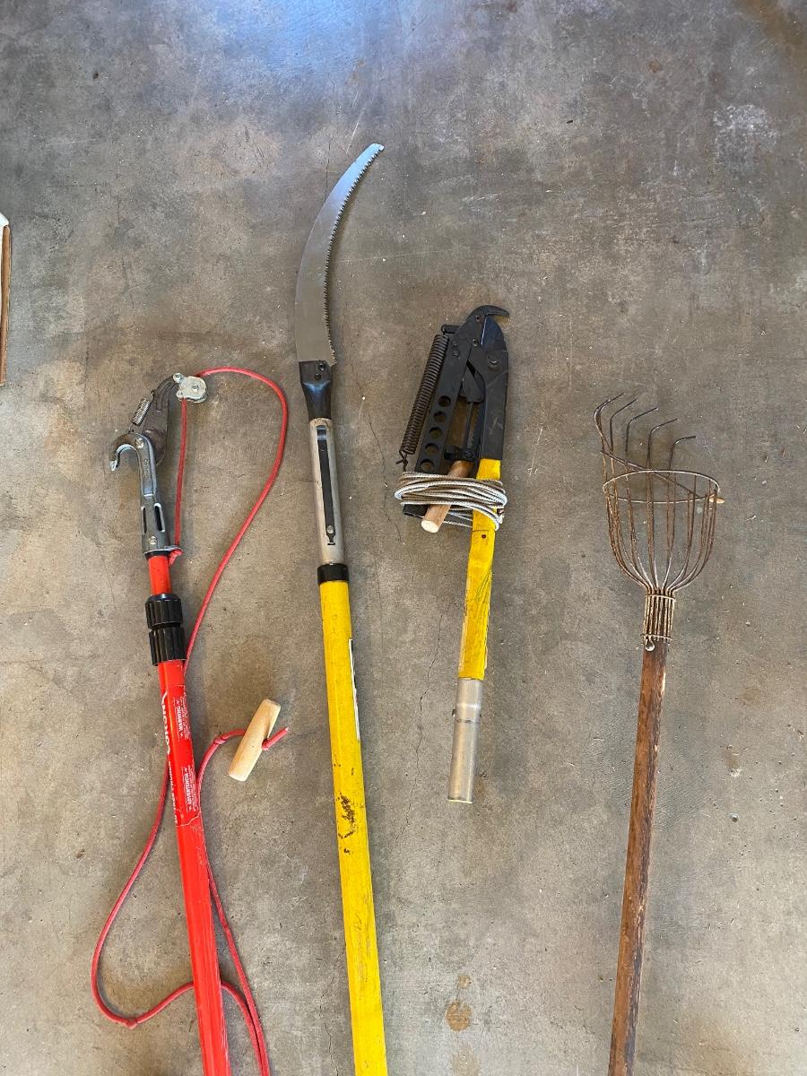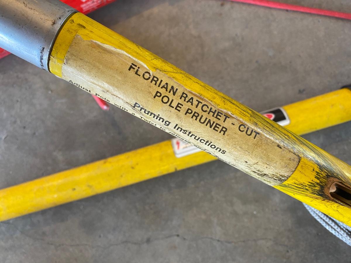 Tree Pruning Lot - Extension Loppers Branch Cutter Saw Fruit Gathering Basket Florian Rachet Cut Pole Pruner. 4 piece lot. The Florian ratchet cut pole pruner looks like it can be swapped out on the pole with the saw blade attached. All are in good maintained condition.