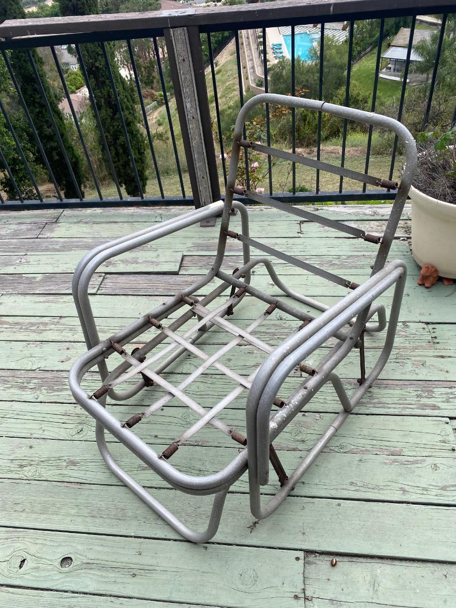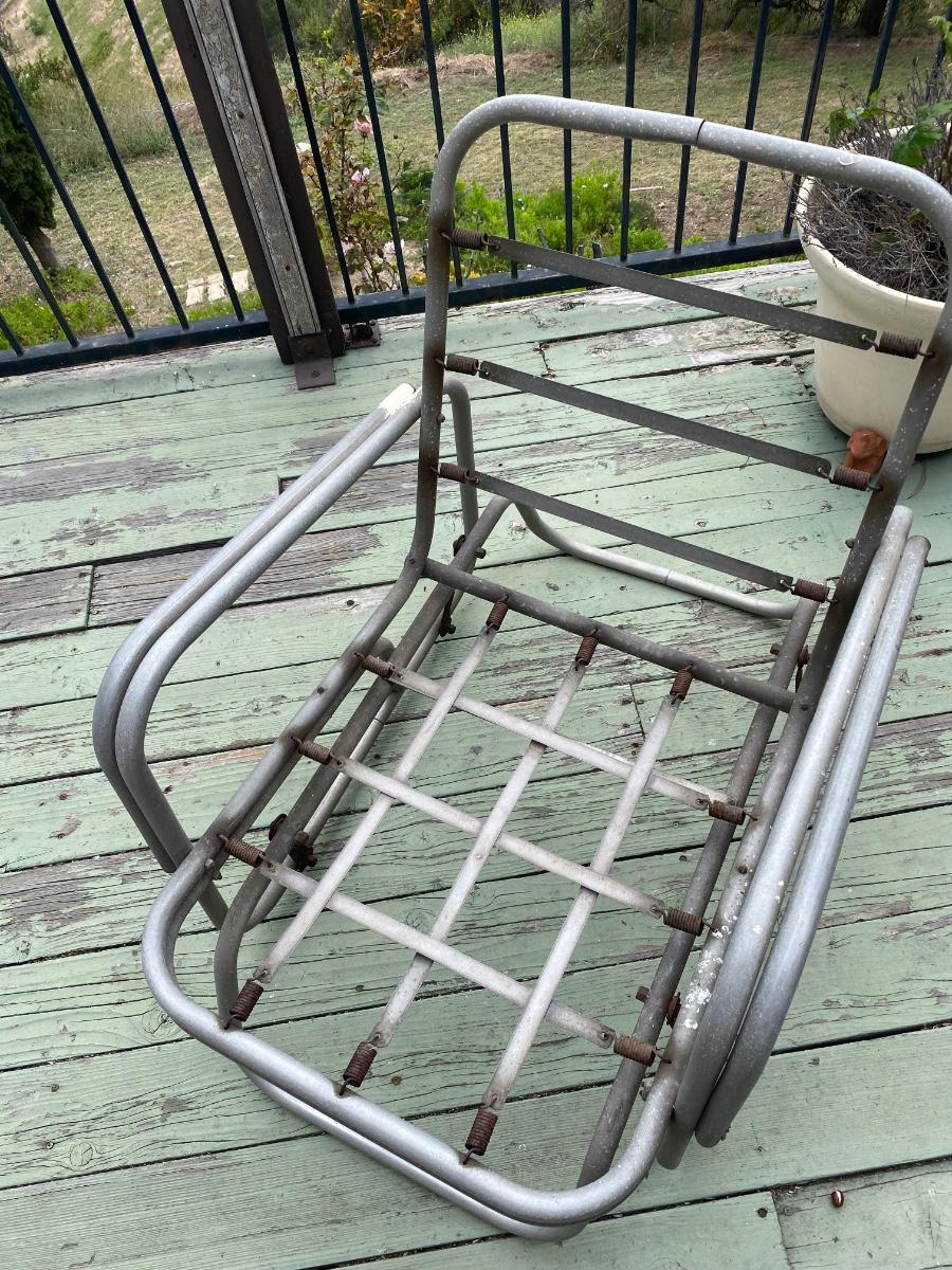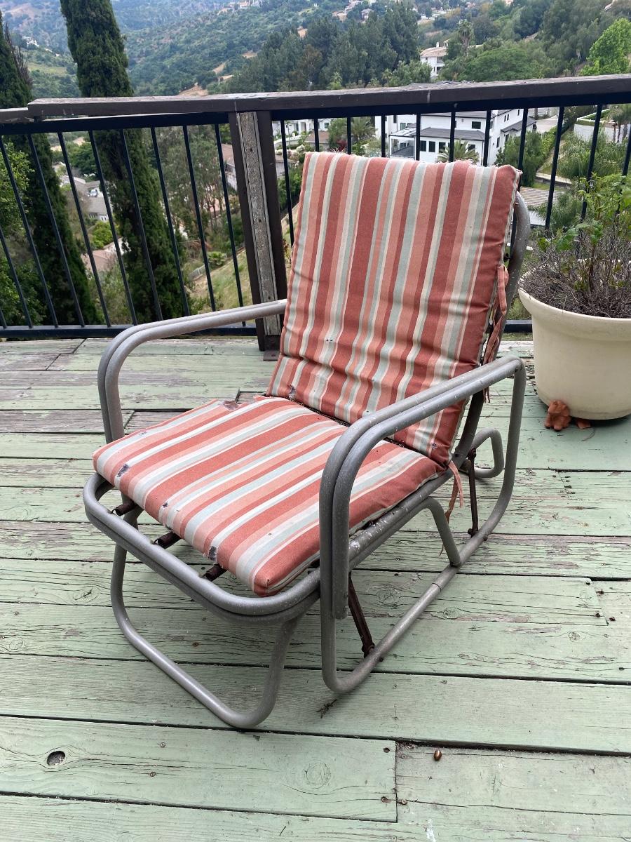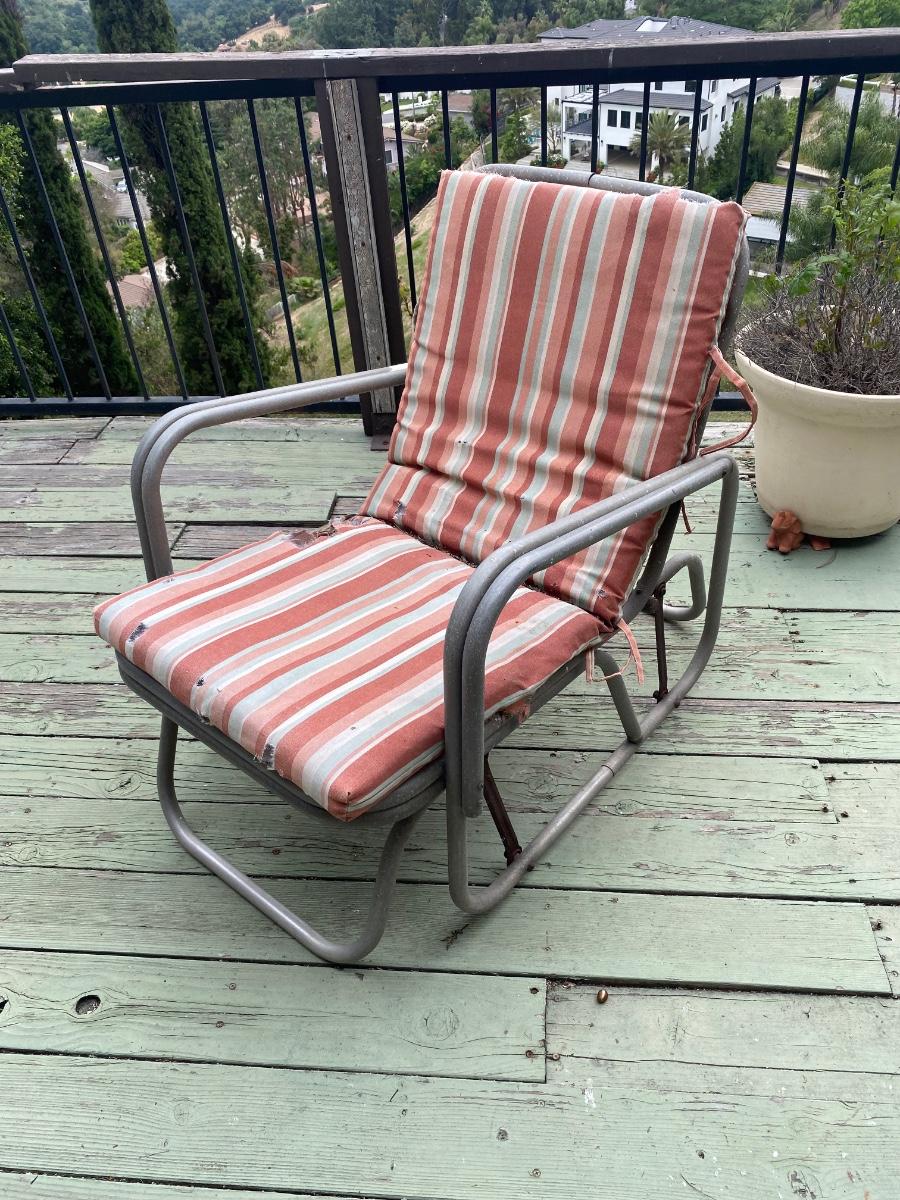 Vintage Metal Glider Patio Sun Chair. Chair glides back and forth smoothly. Current cushion needs to be replaced. Great with a fresh coat of paint and new cushion.