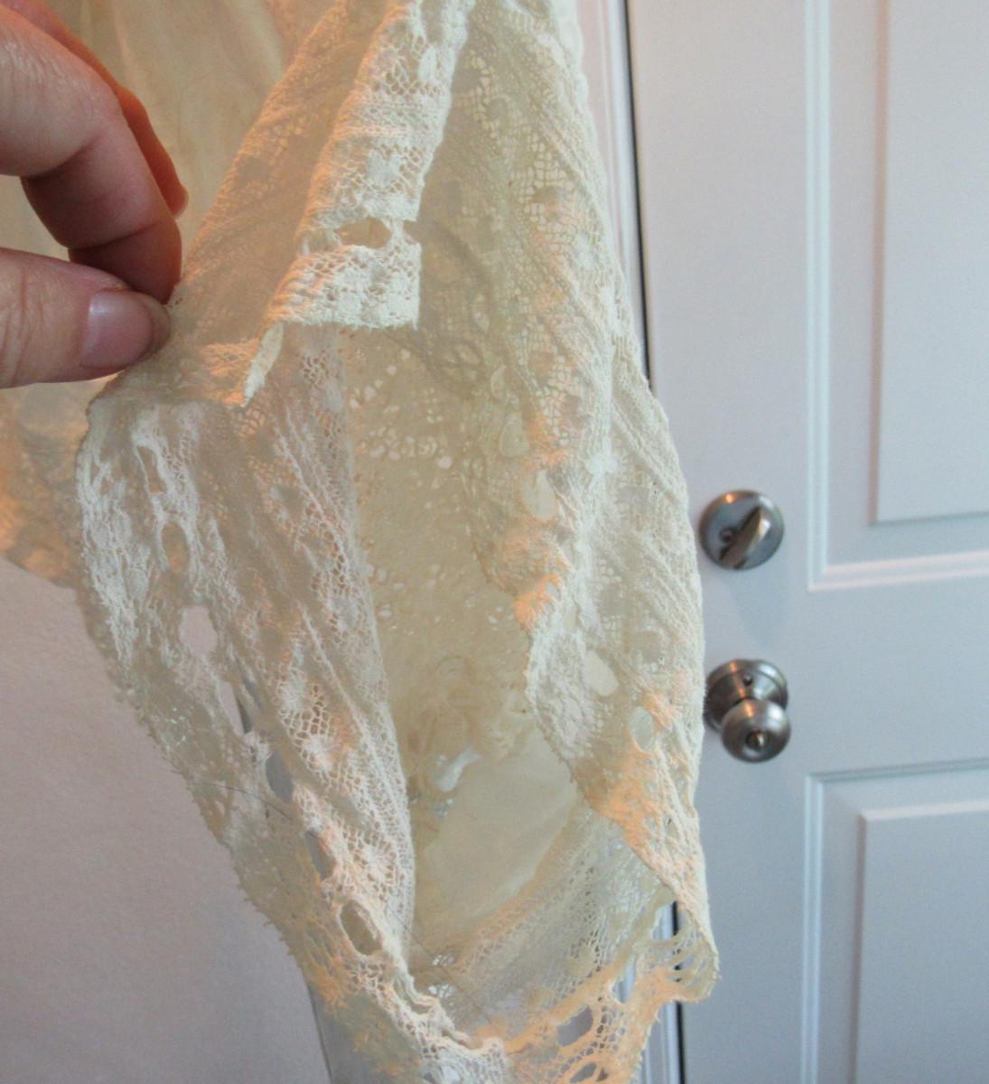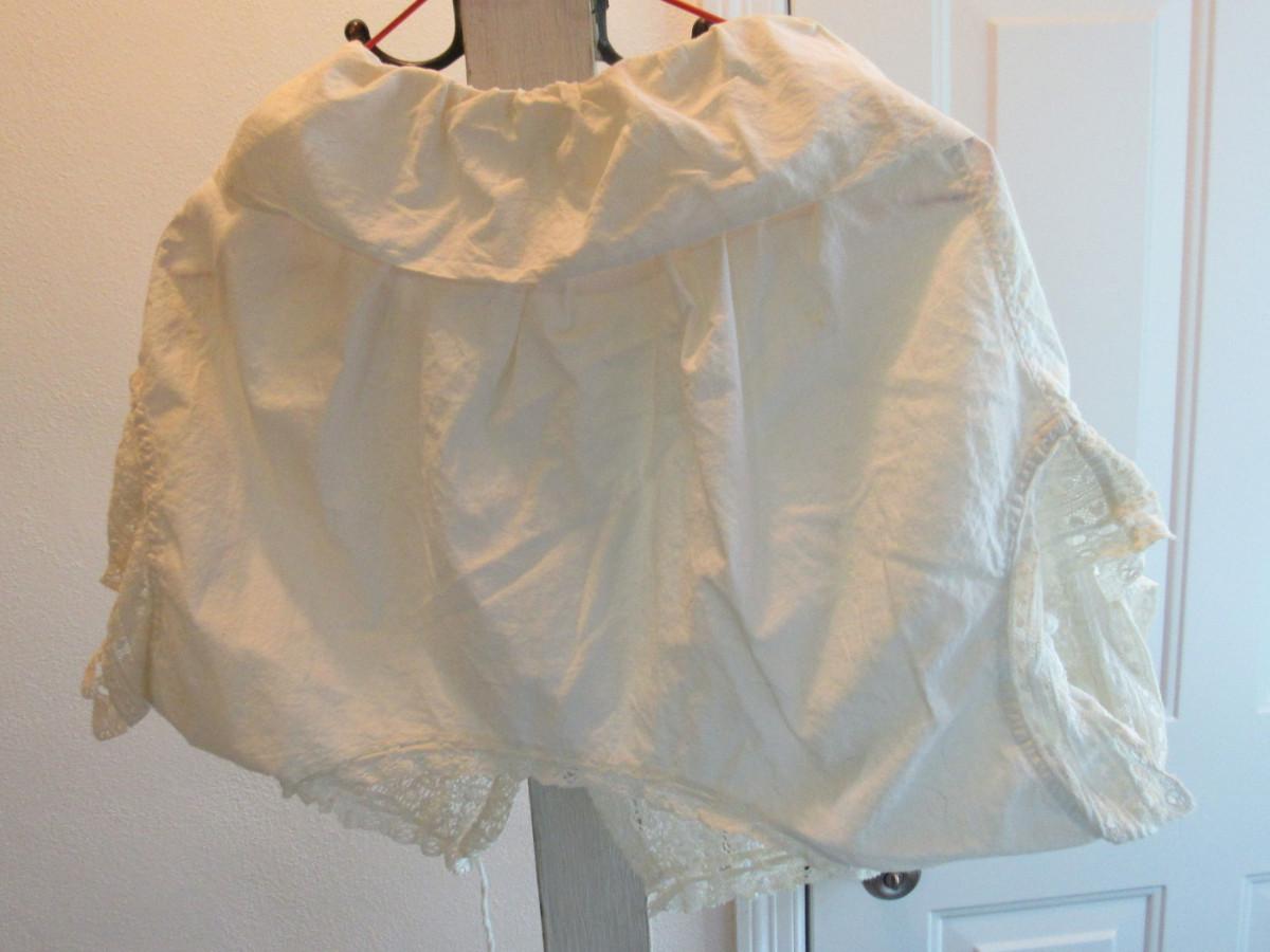 This is a very short cape but it does have armholes. Button down front, lace trim. Appears to be in good shape. No labels, size unknown. Measures 16" across at the shoulders, 14 1/2" long. Shipping is available at actual shipping cost plus $5.00 handling fee per box for supplies/labor. See our terms for details. All sales are final. Condition notes may not be all inclusive, we may miss some issues as most vintage items are not in mint condition and have some degree of wear, paint loss, etc, but we always try to note obvious damage.