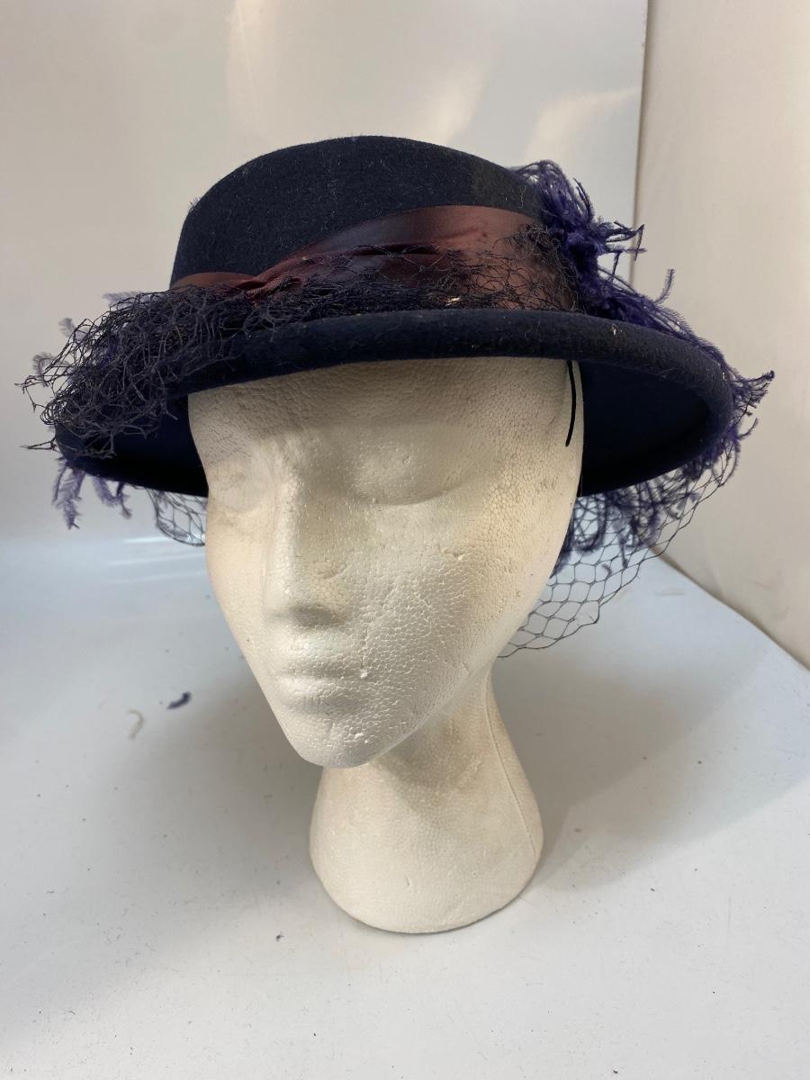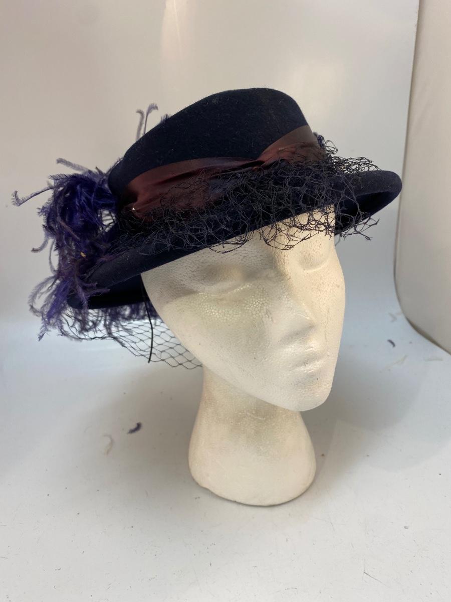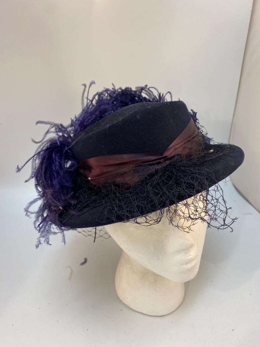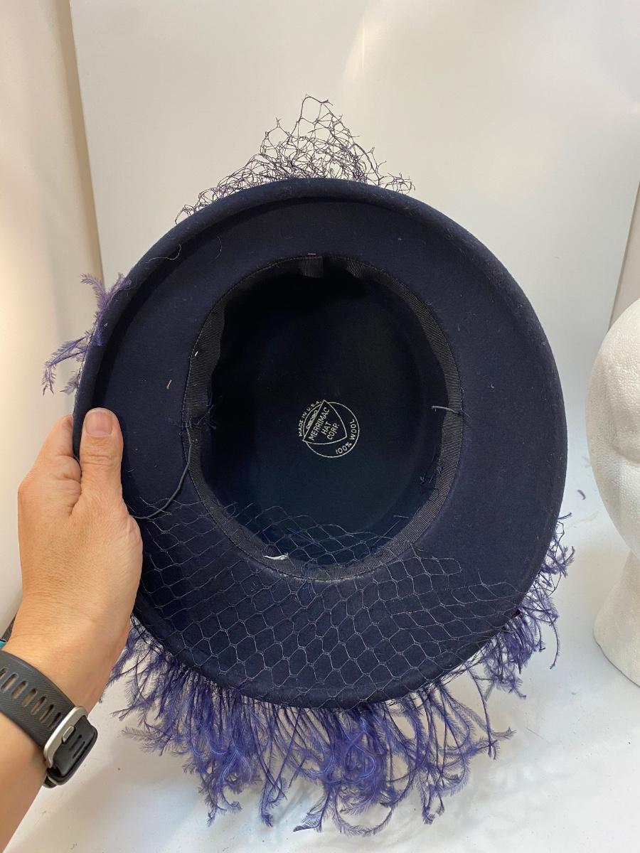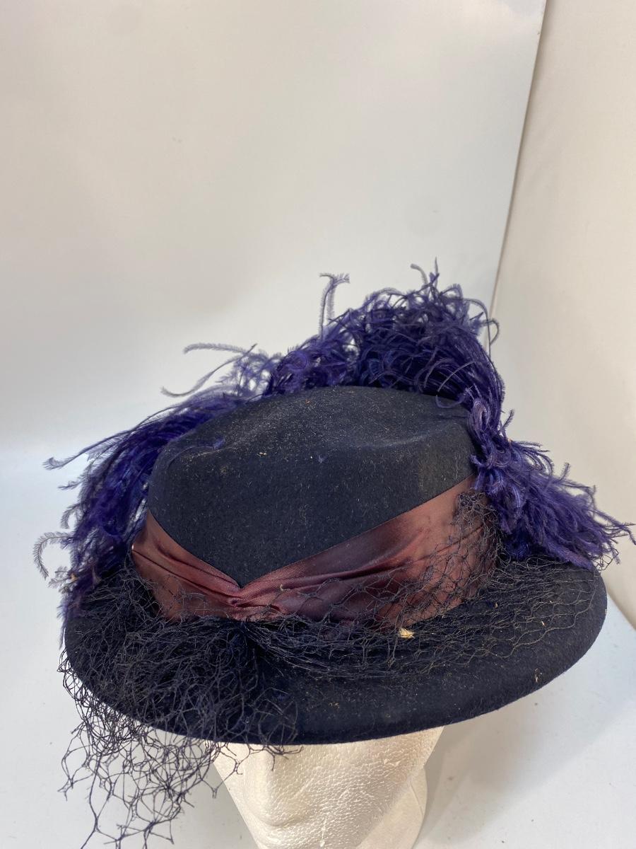 Vintage Merrimac Hat Corp 100% Wool Navy Blue Boater with Netting and Feather. in good vintage condition. Hat looks like it could be worn either direction. Some light wear and discolor from age.
