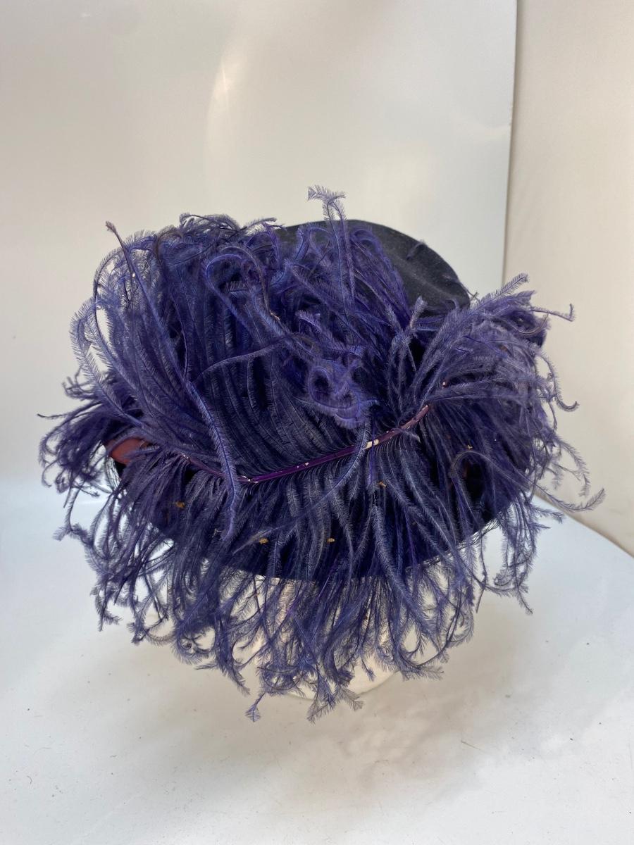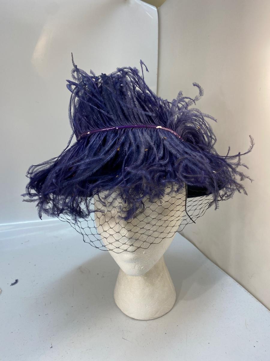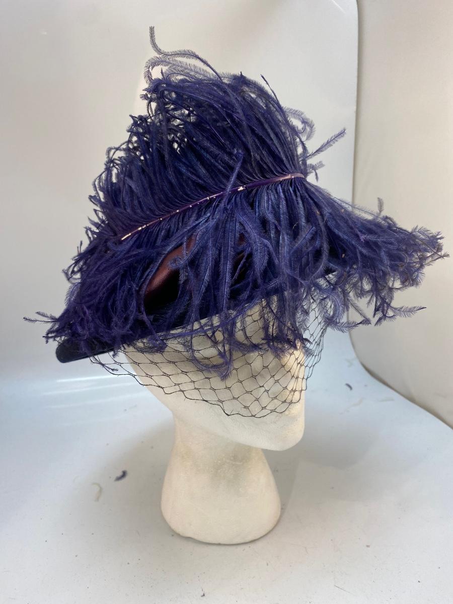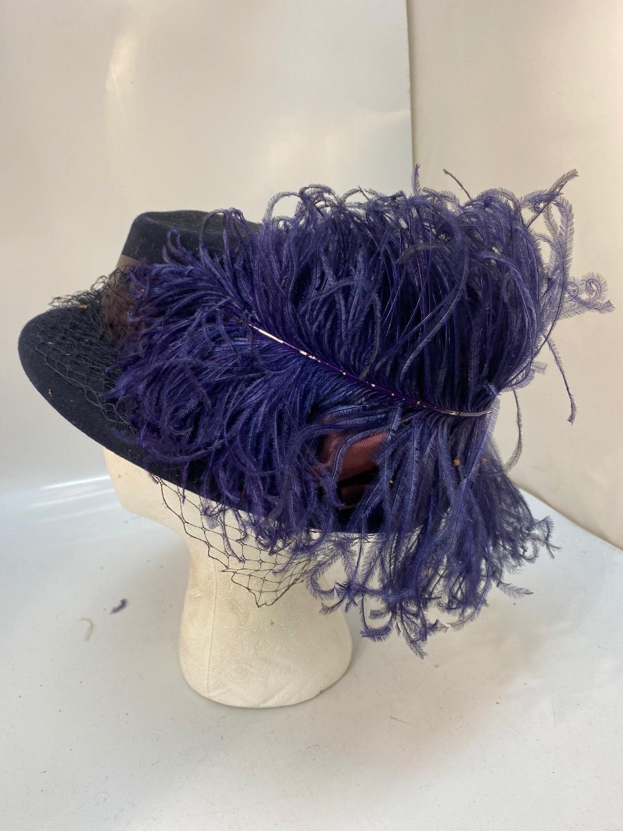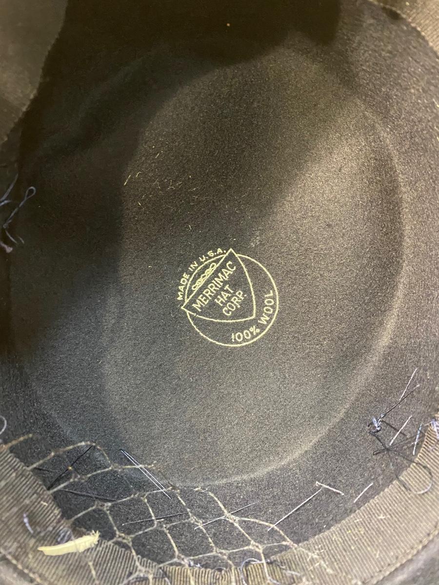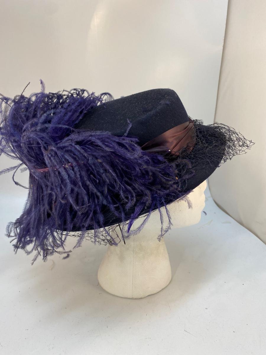 Vintage Merrimac Hat Corp 100% Wool Navy Blue Boater with Netting and Feather. in good vintage condition. Hat looks like it could be worn either direction. Some light wear and discolor from age.