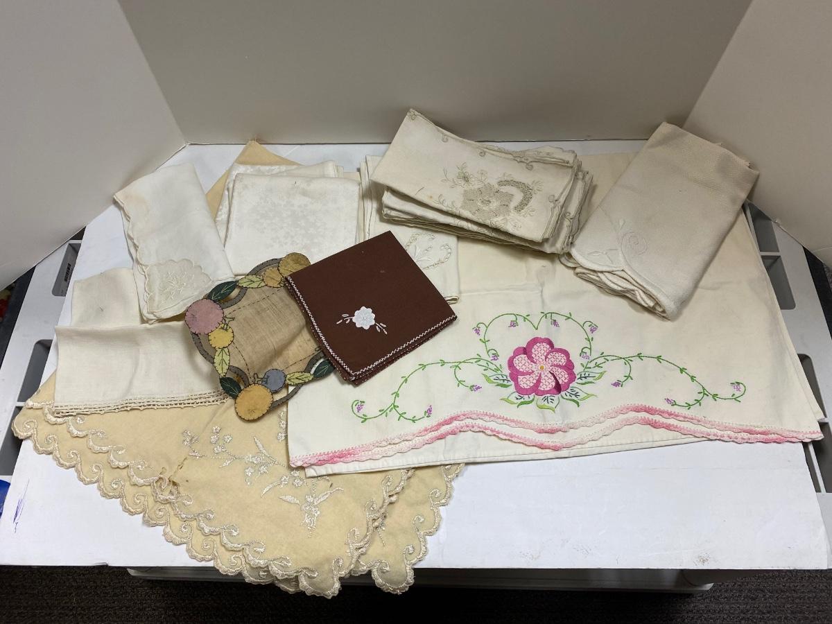 Mixed Lot of Vintage Antique Linens Napkins Hankies. May have spots and stains.