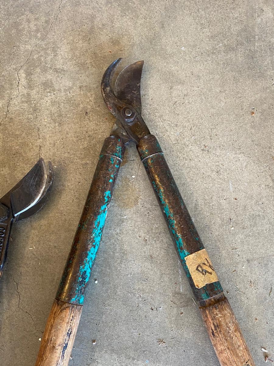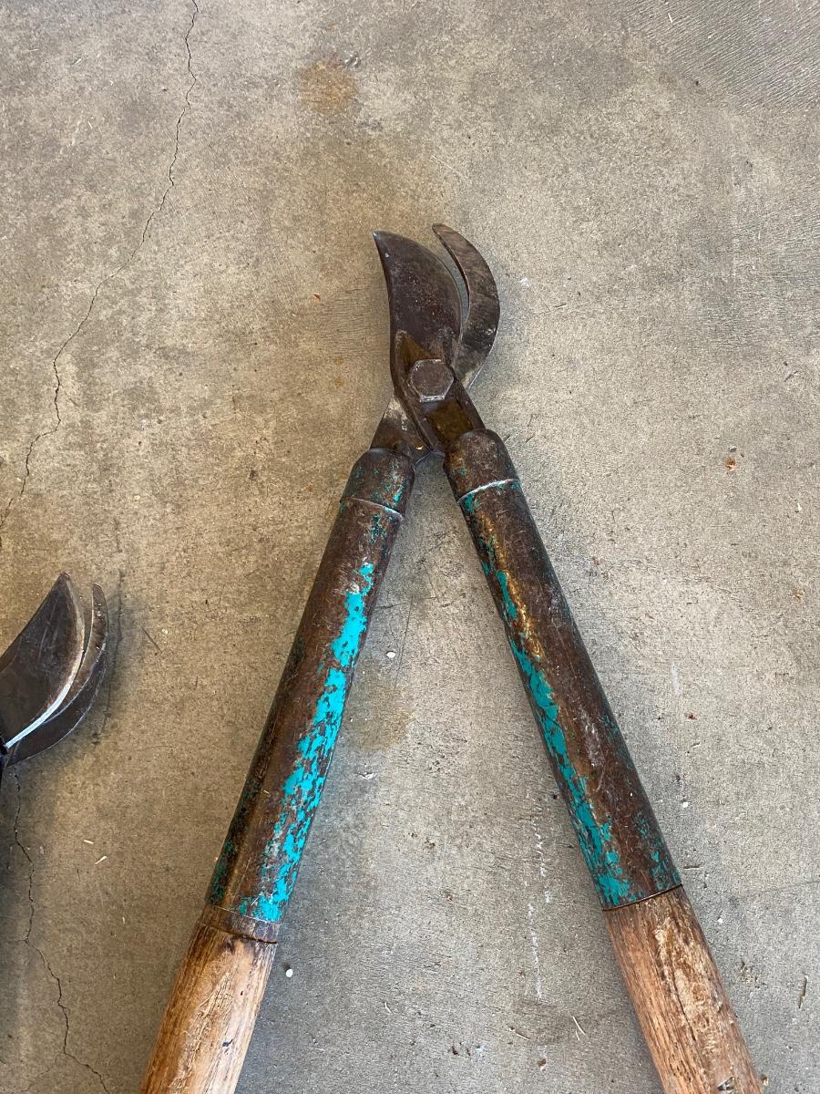 Set of Three Garden Yard Tree Branch Loppers Cutters Hedge Shears. In good used condition. Blades appear to be well maintained. Two pairs of branch loppers and a pair of hedge shears.