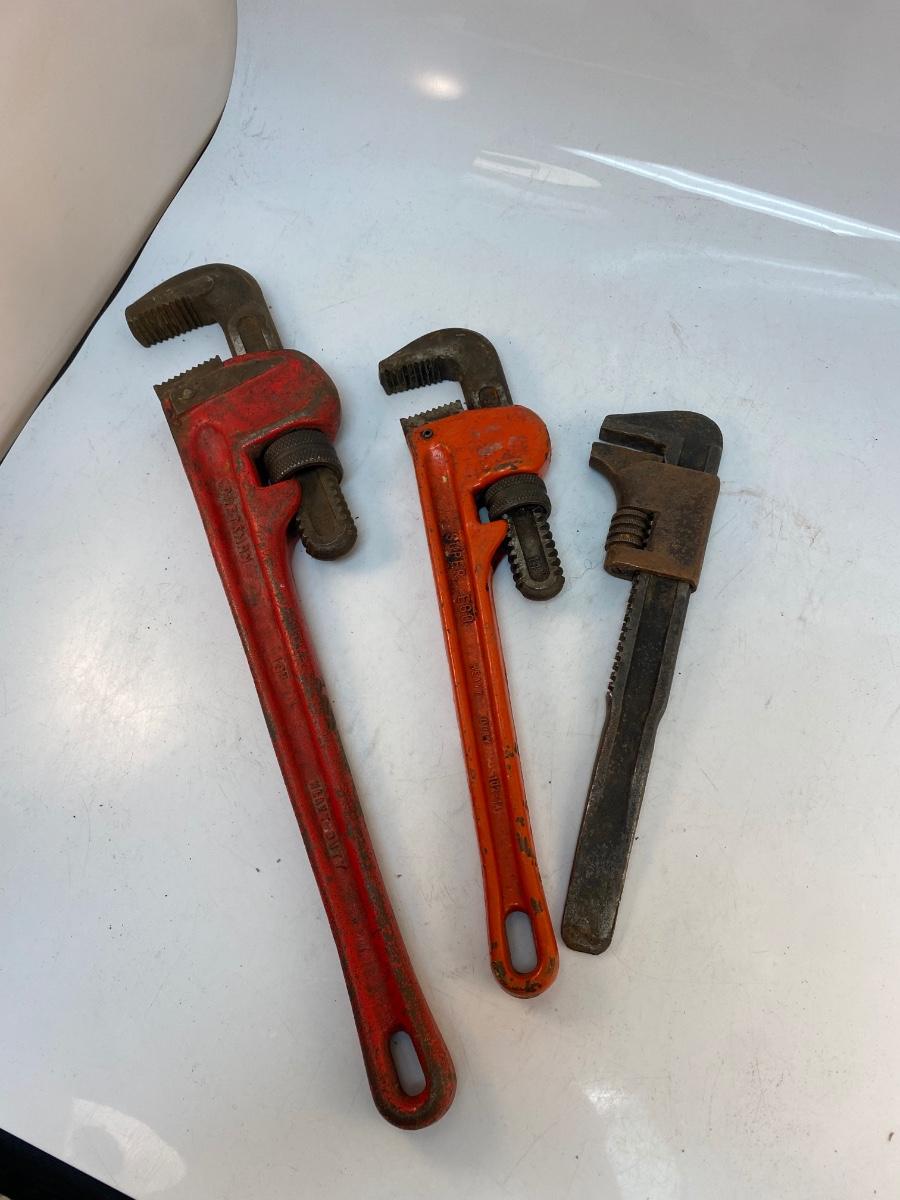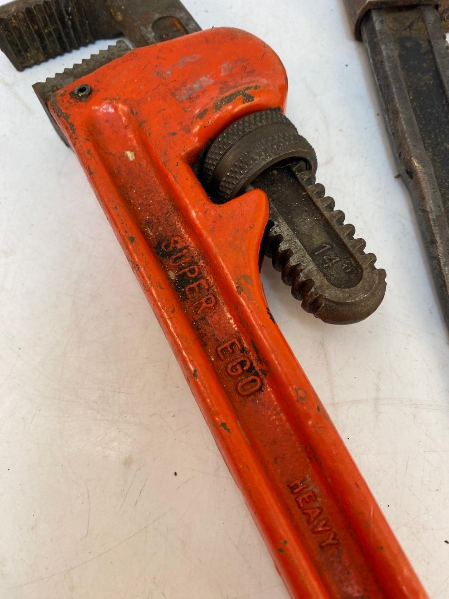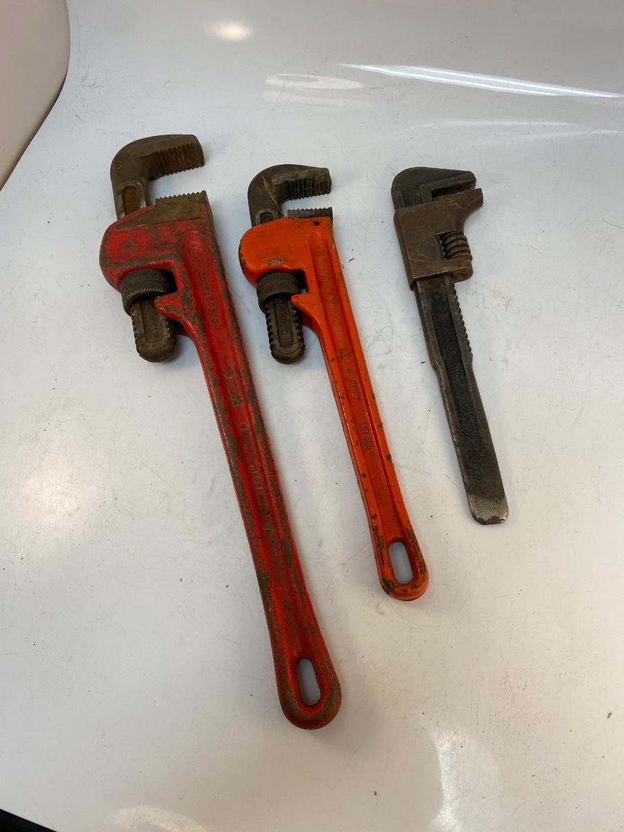 Lot of 3 Pipe Adjustable Wrenches 18" Craftsman 14" Super Ego. In good used condition, no problem adjusting the size.
