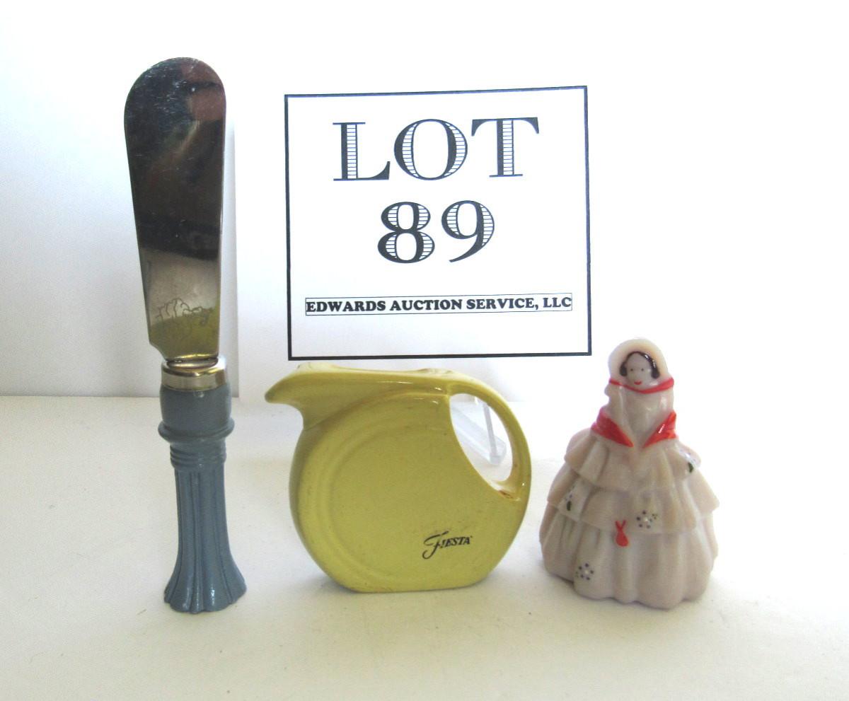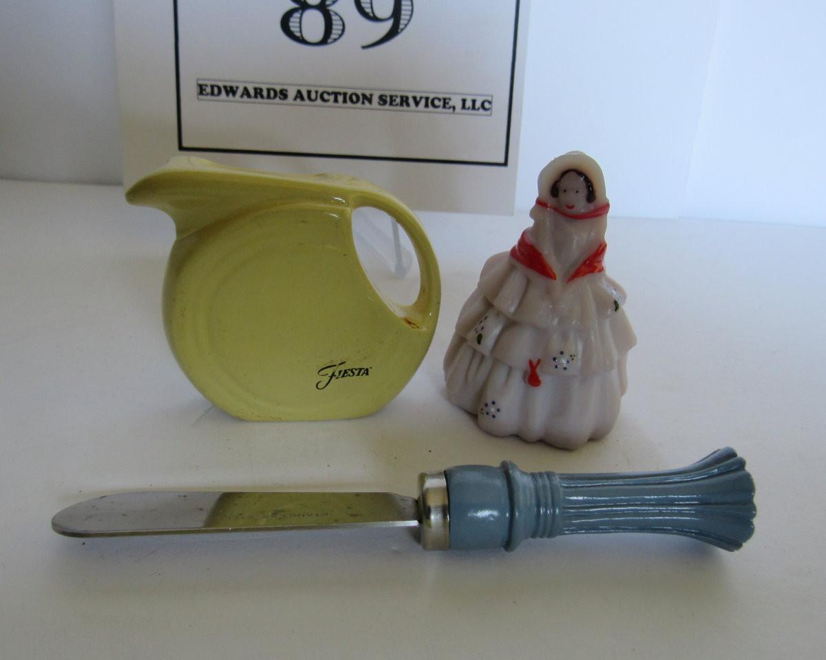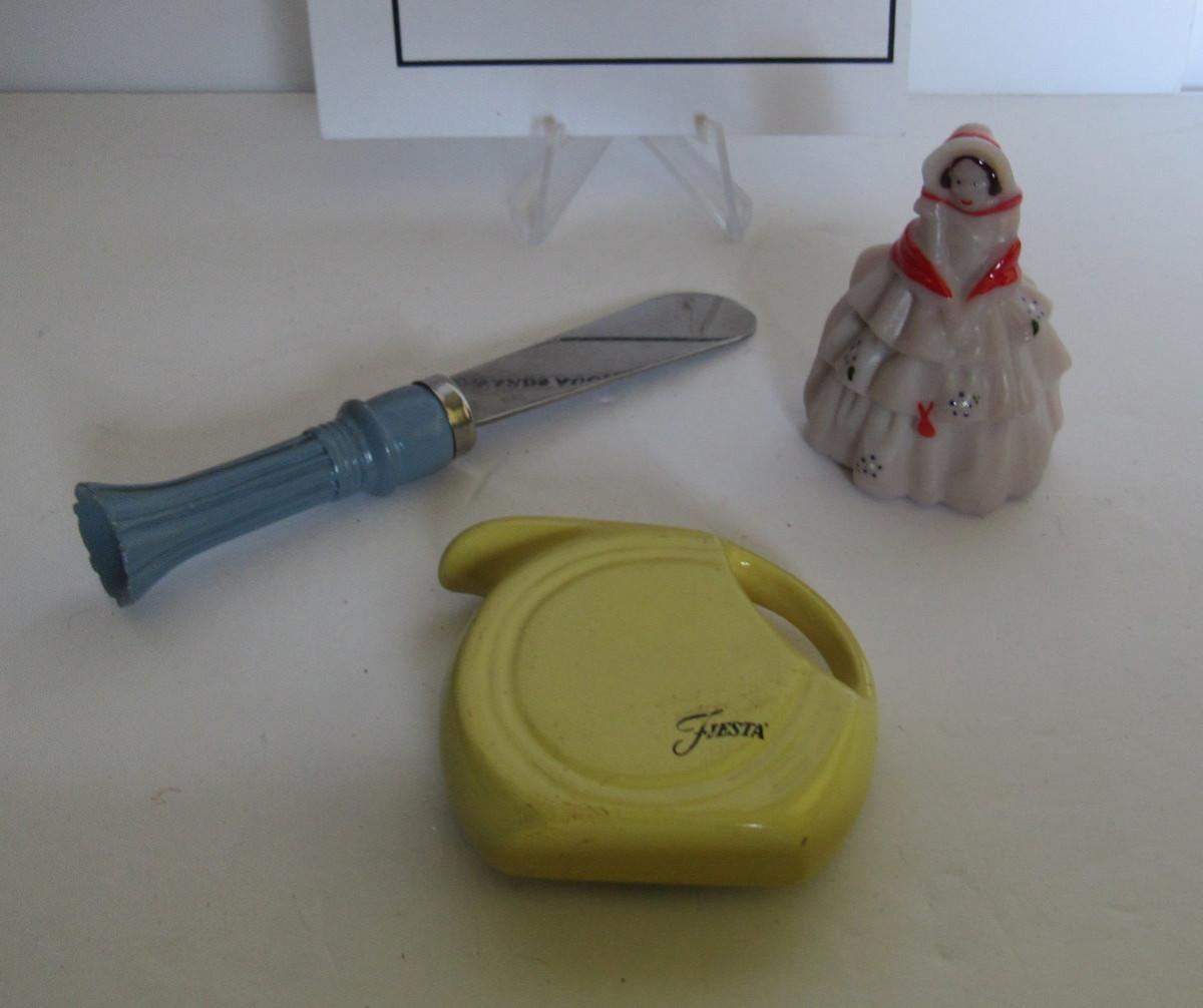Fiesta Refrigerator Magnet and Tiny Knife Spreader and Boyd Glass Hand Painted Doll