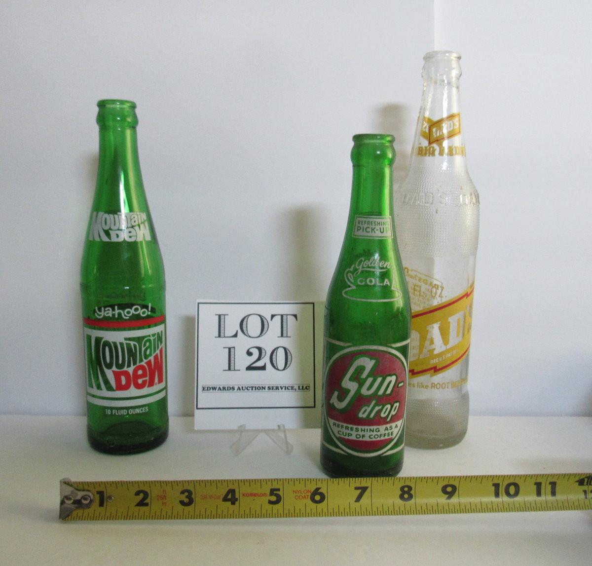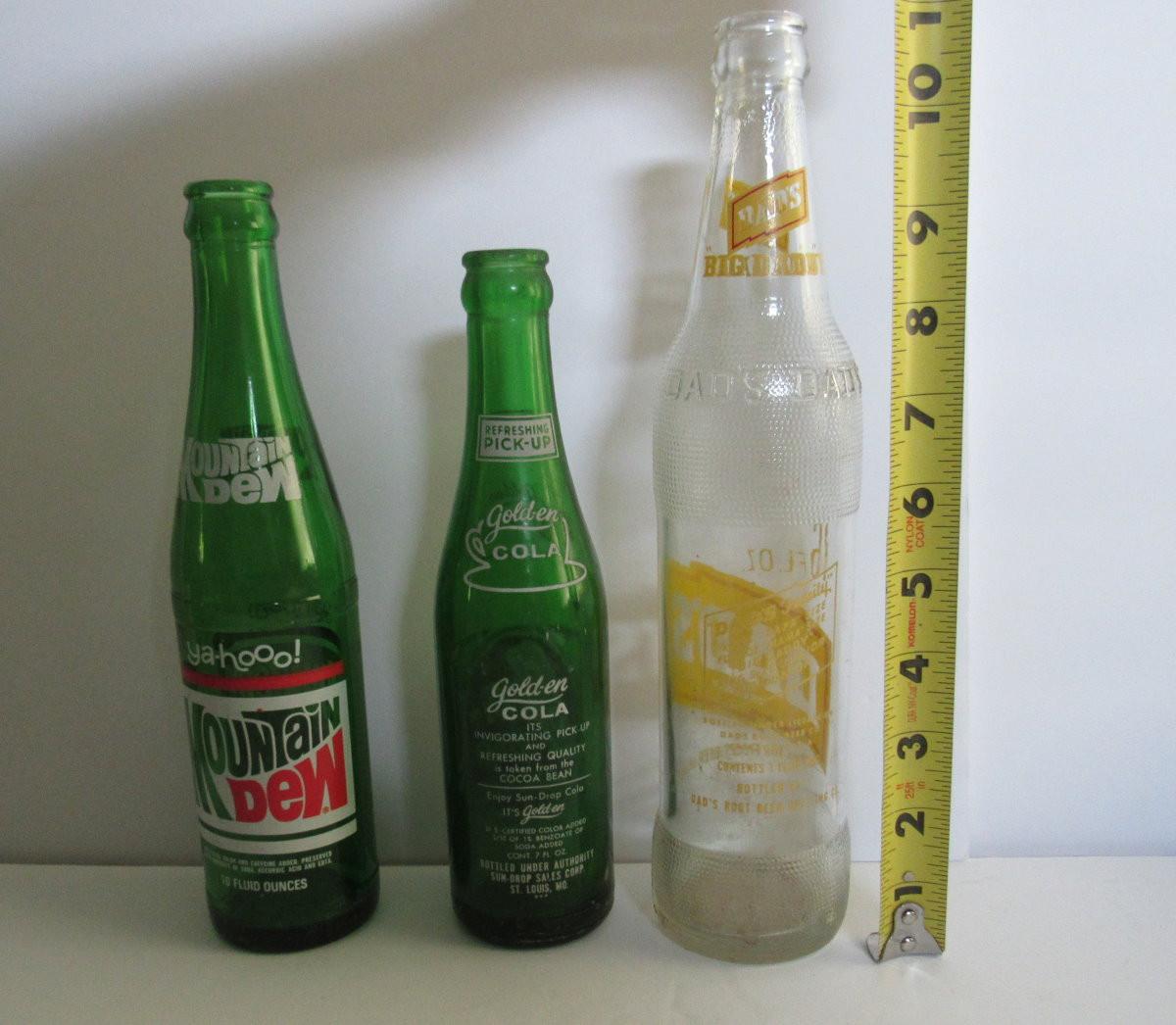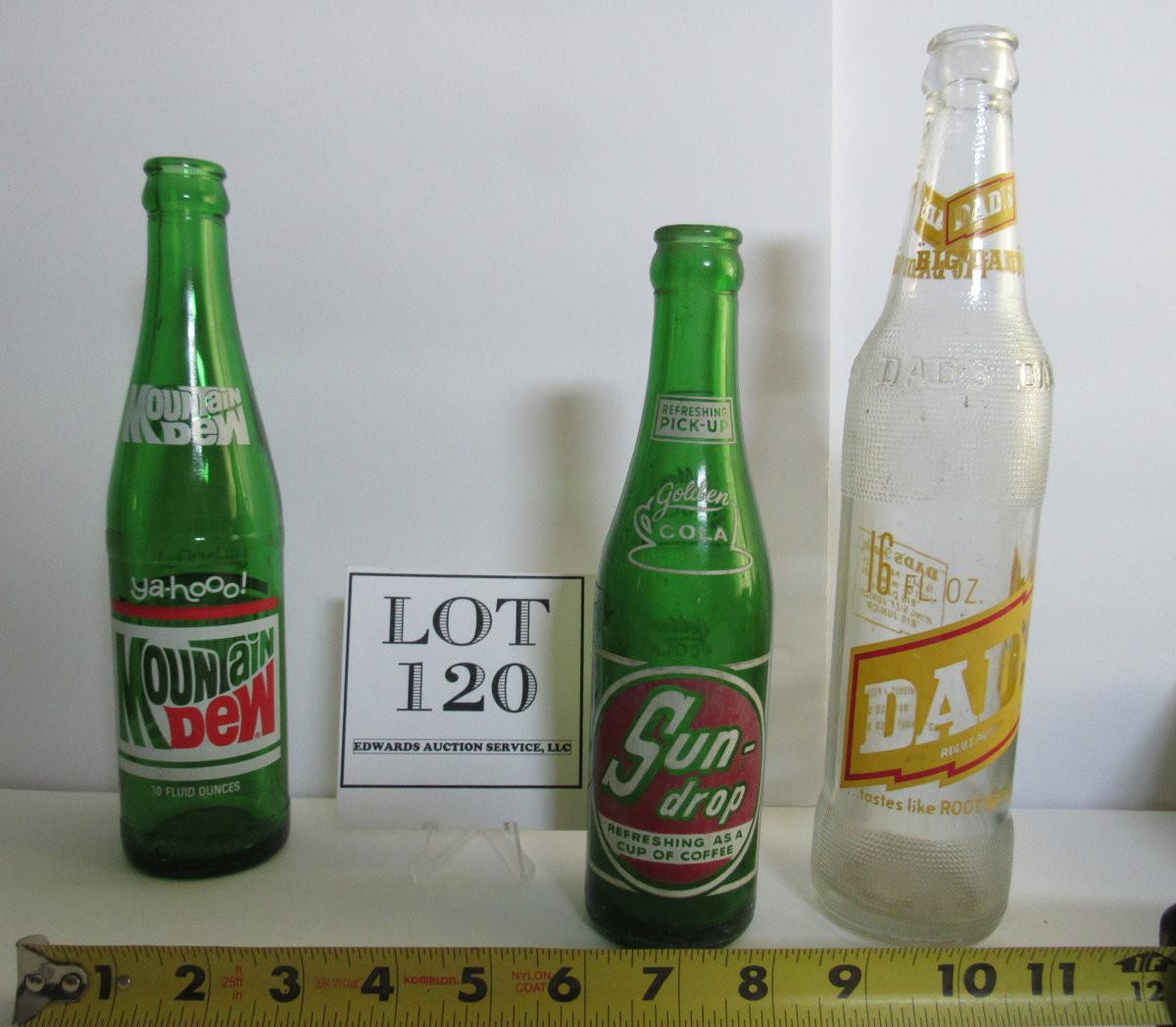 Lot of 3 Old Pop Bottles, Mountain Dew, Sun Drop, Dad's