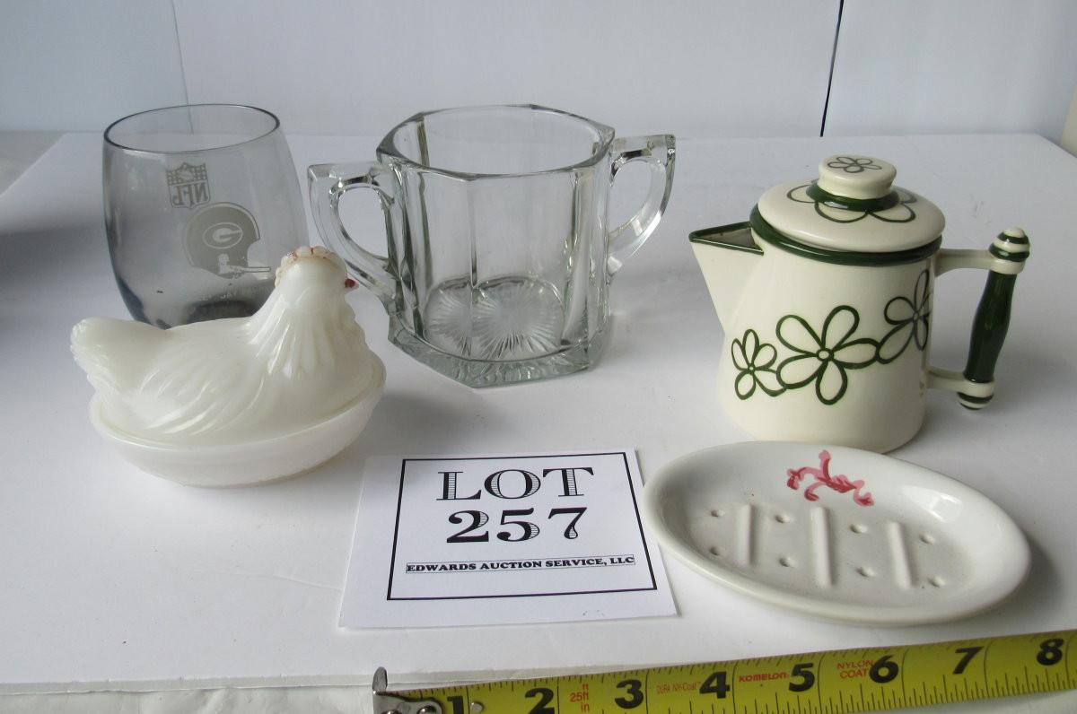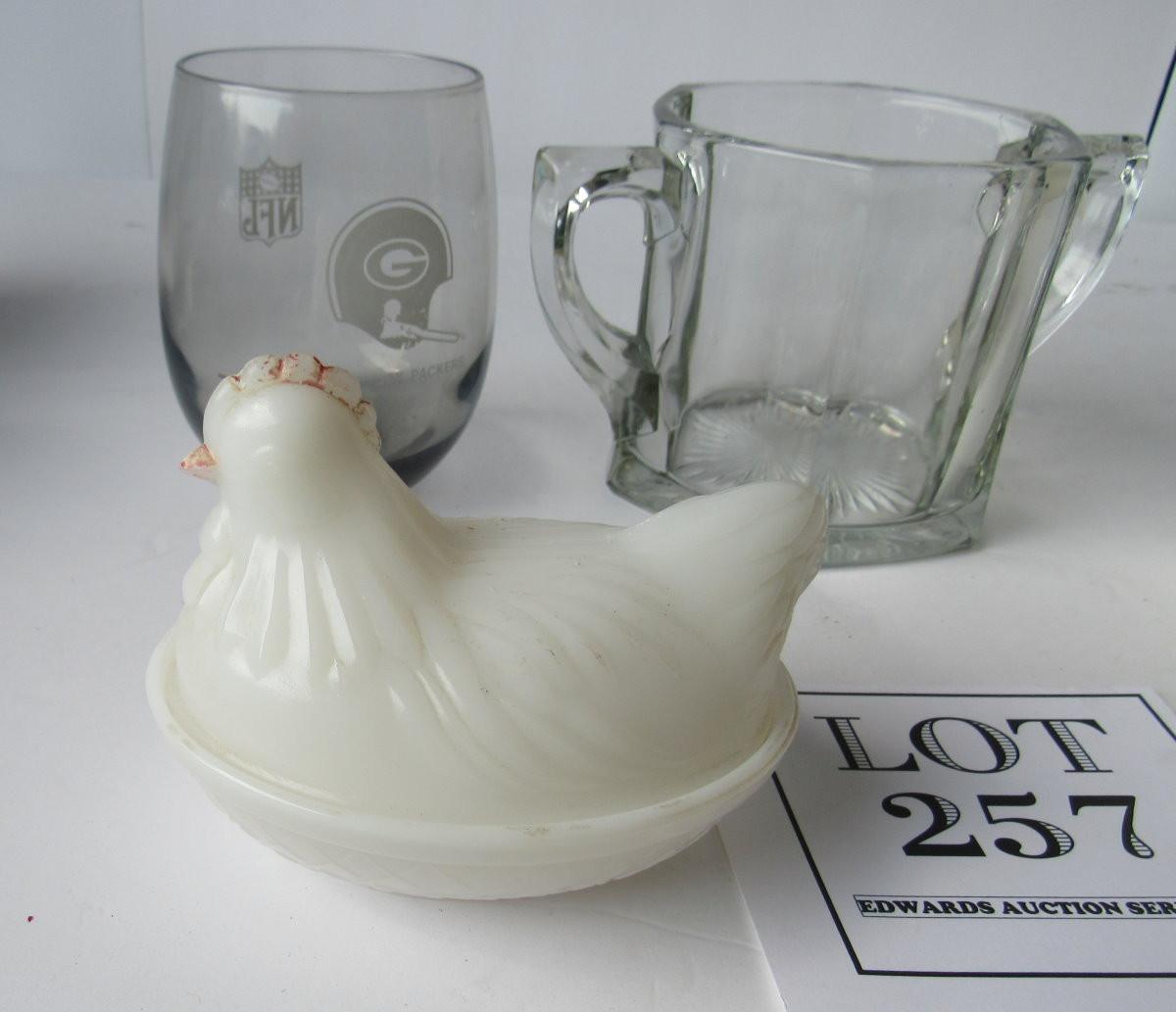 Wear to paint on covered hen dish. Wear on Packers decal on glass. Shipping is available at USPS cost plus handling fee on each box mailed out. See our terms for details.