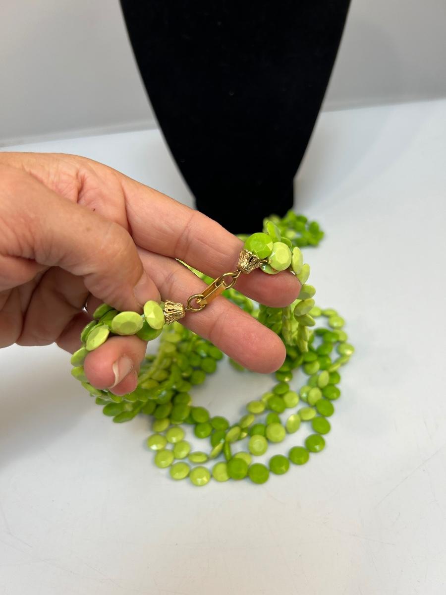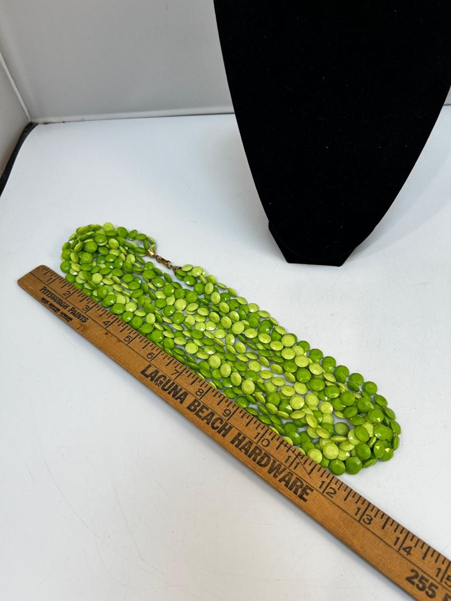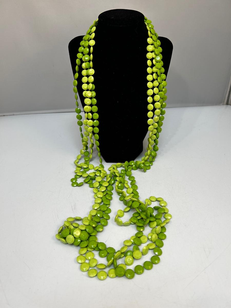 Extra Long Lime Green Plastic Flat Bead Multistrand Fashion Necklace. In good condition.