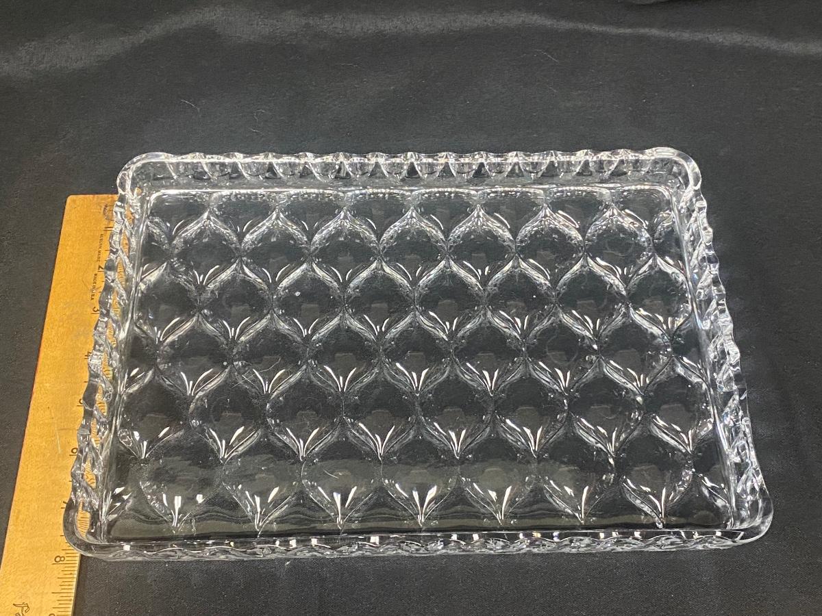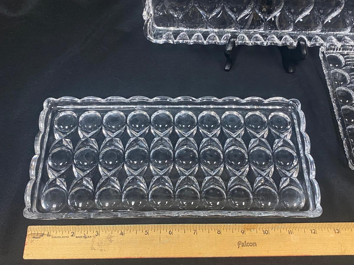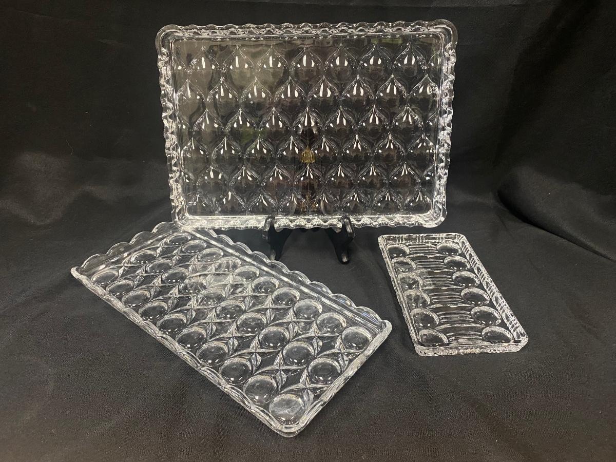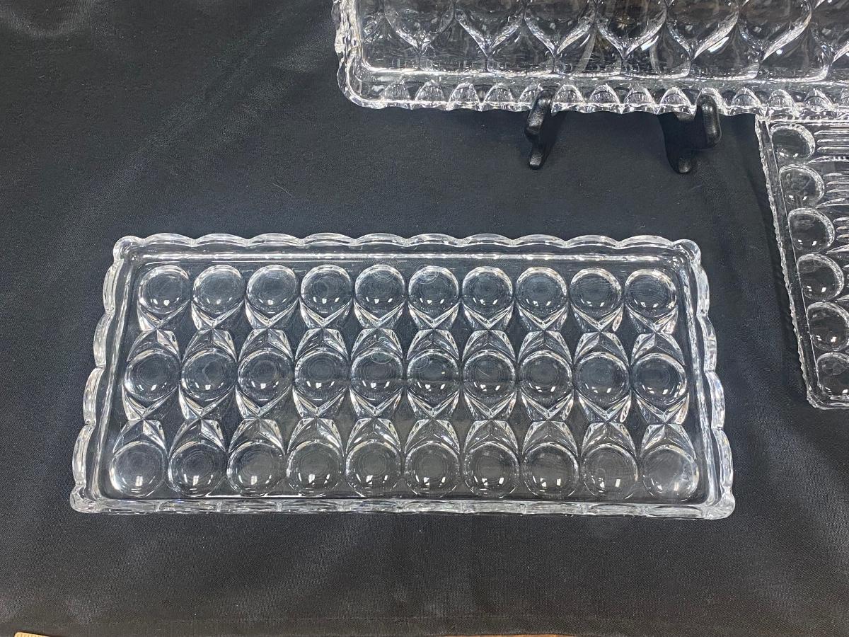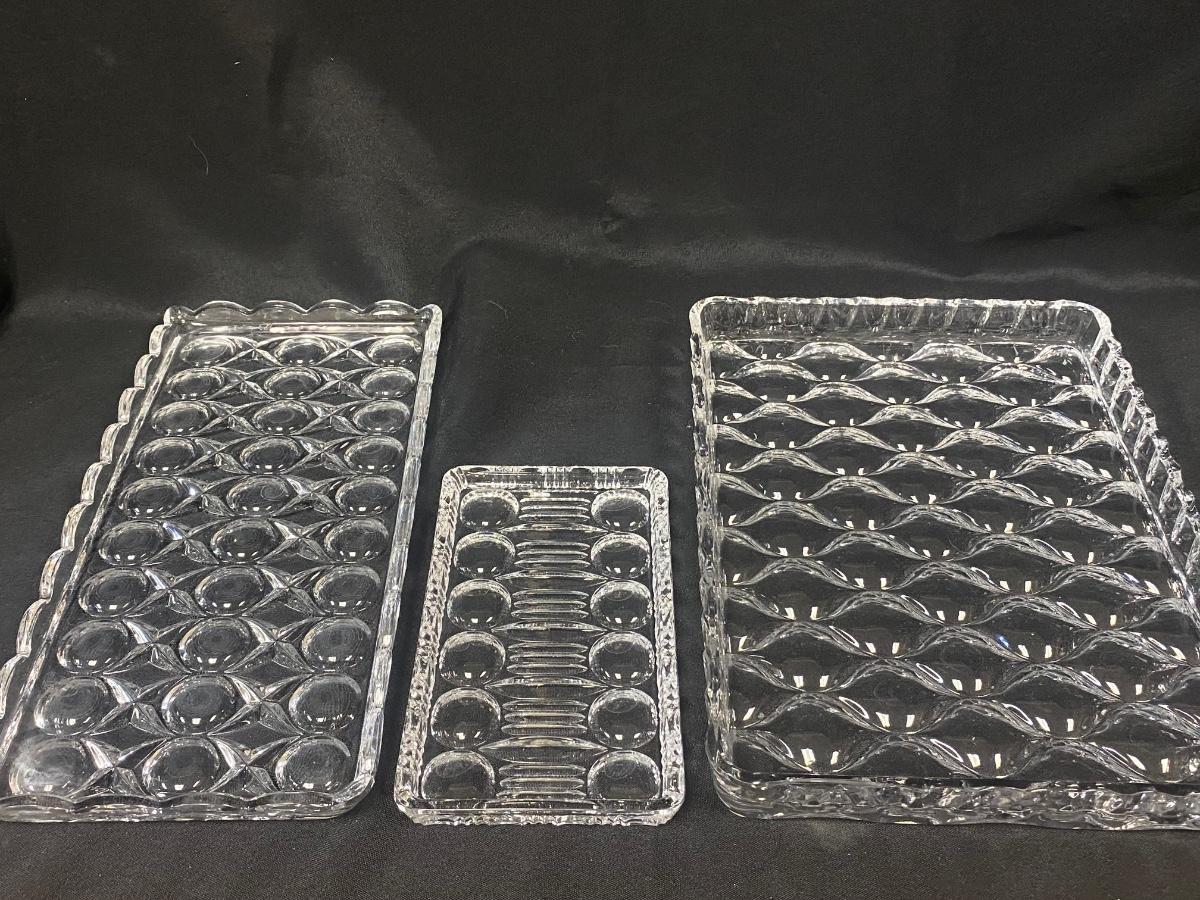 Set of 3 Geometric Design Patterned Crystal Glass Rectangle Shaped Trinket Dishes Serving Plates. Cool funky repeat patterns. In good condition, no chips.