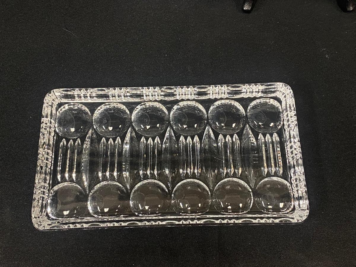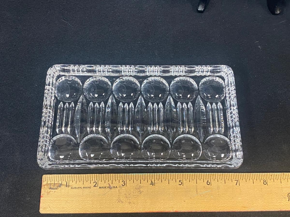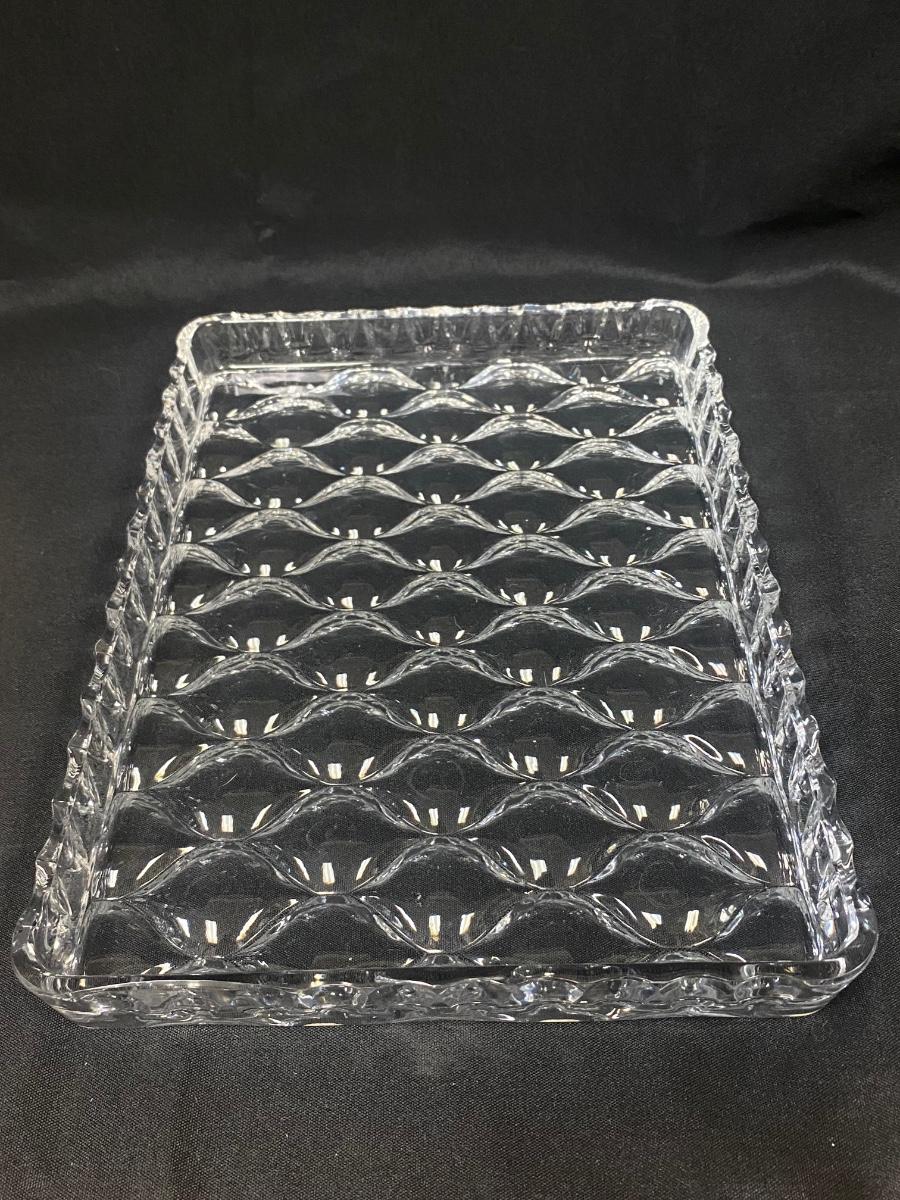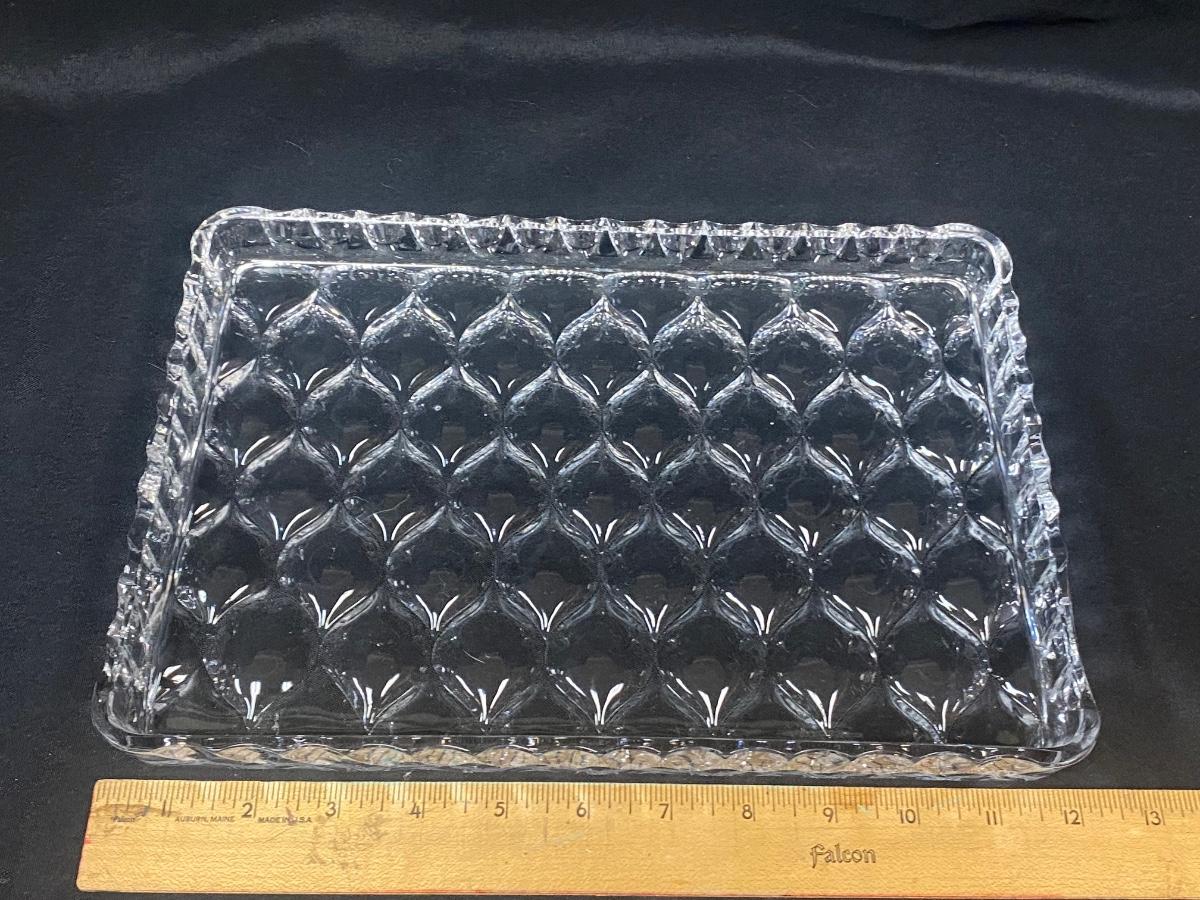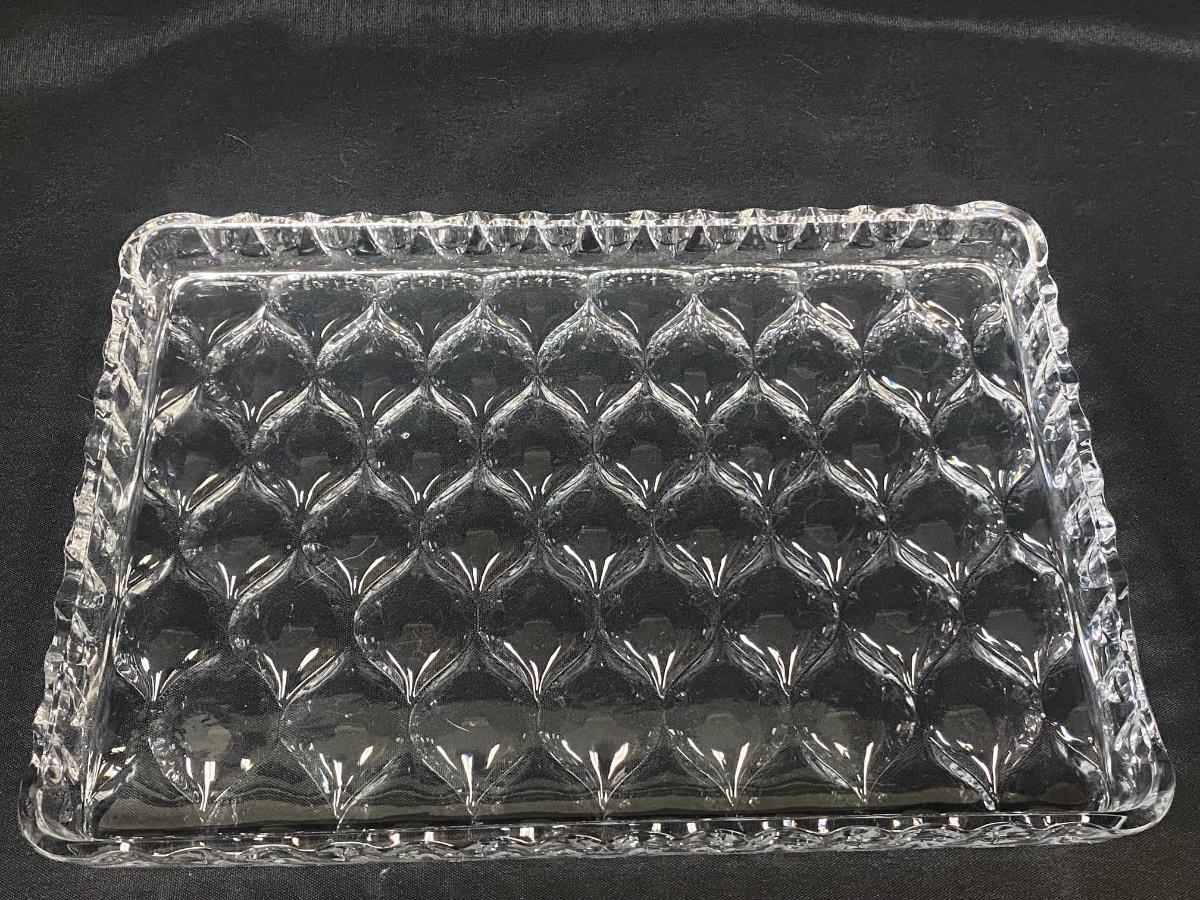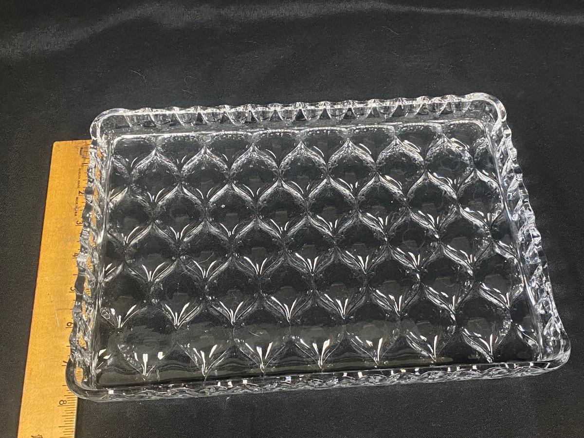 Set of 3 Geometric Design Patterned Crystal Glass Rectangle Shaped Trinket Dishes Serving Plates. Cool funky repeat patterns. In good condition, no chips.