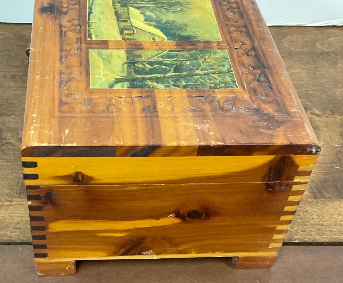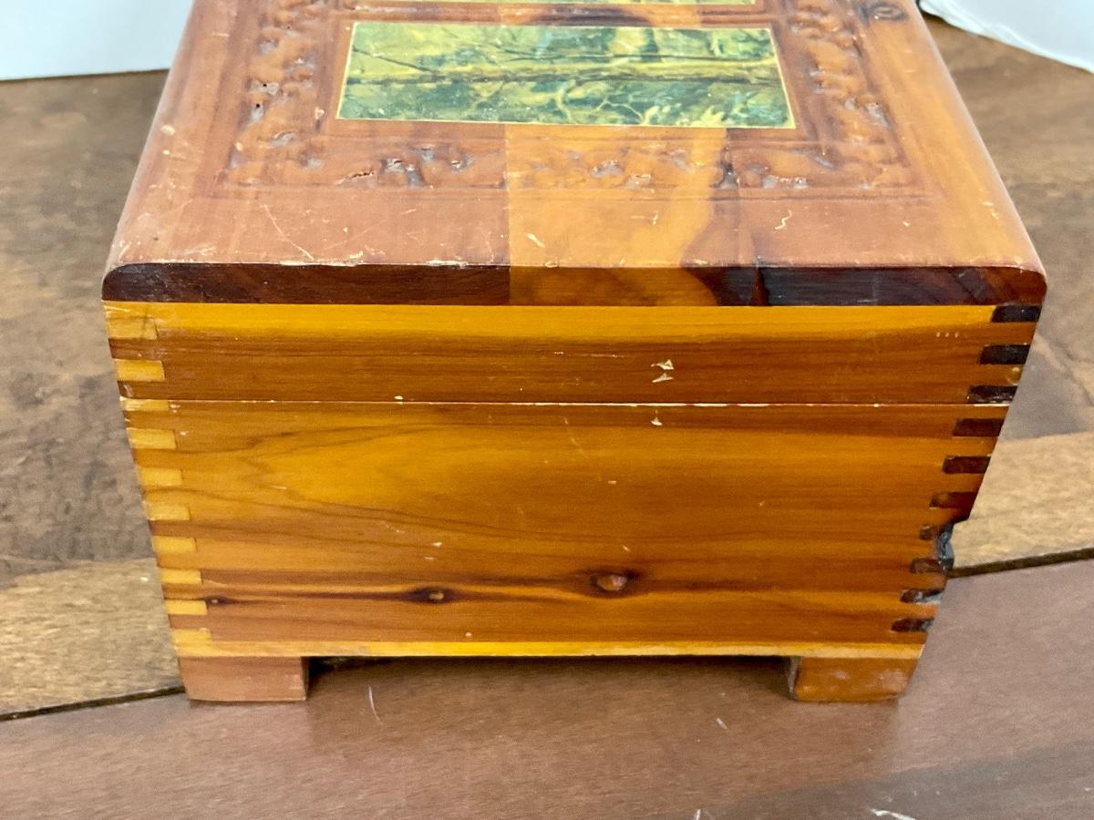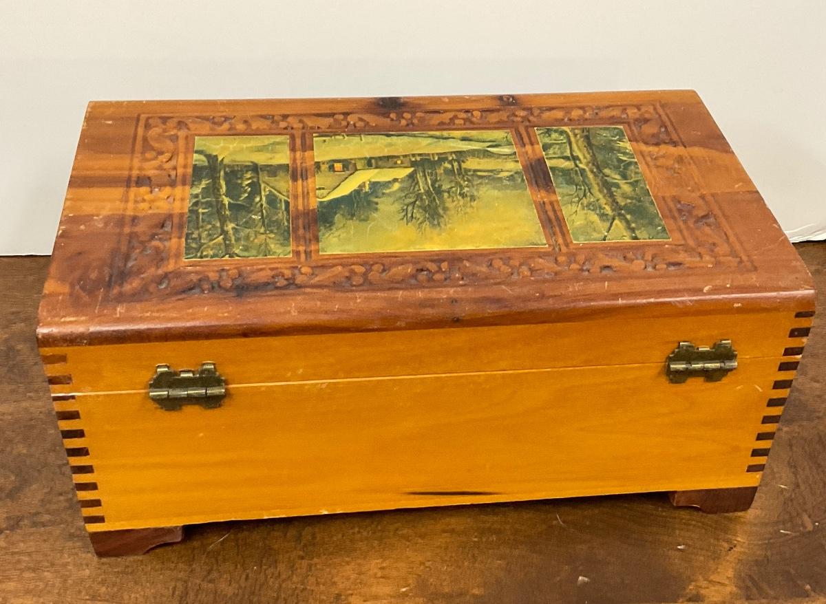 Vintage Wood Jewelry Box Cabin Scene Lid with Mirror Inside