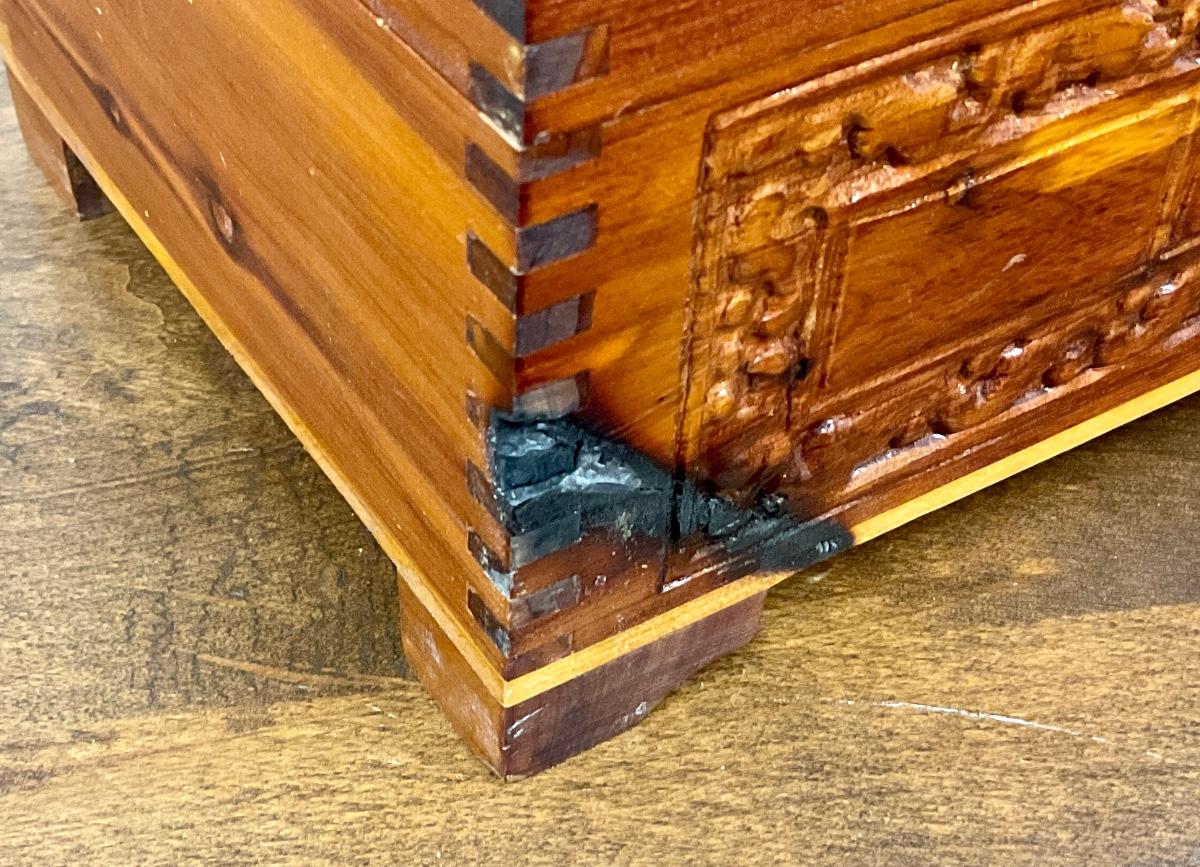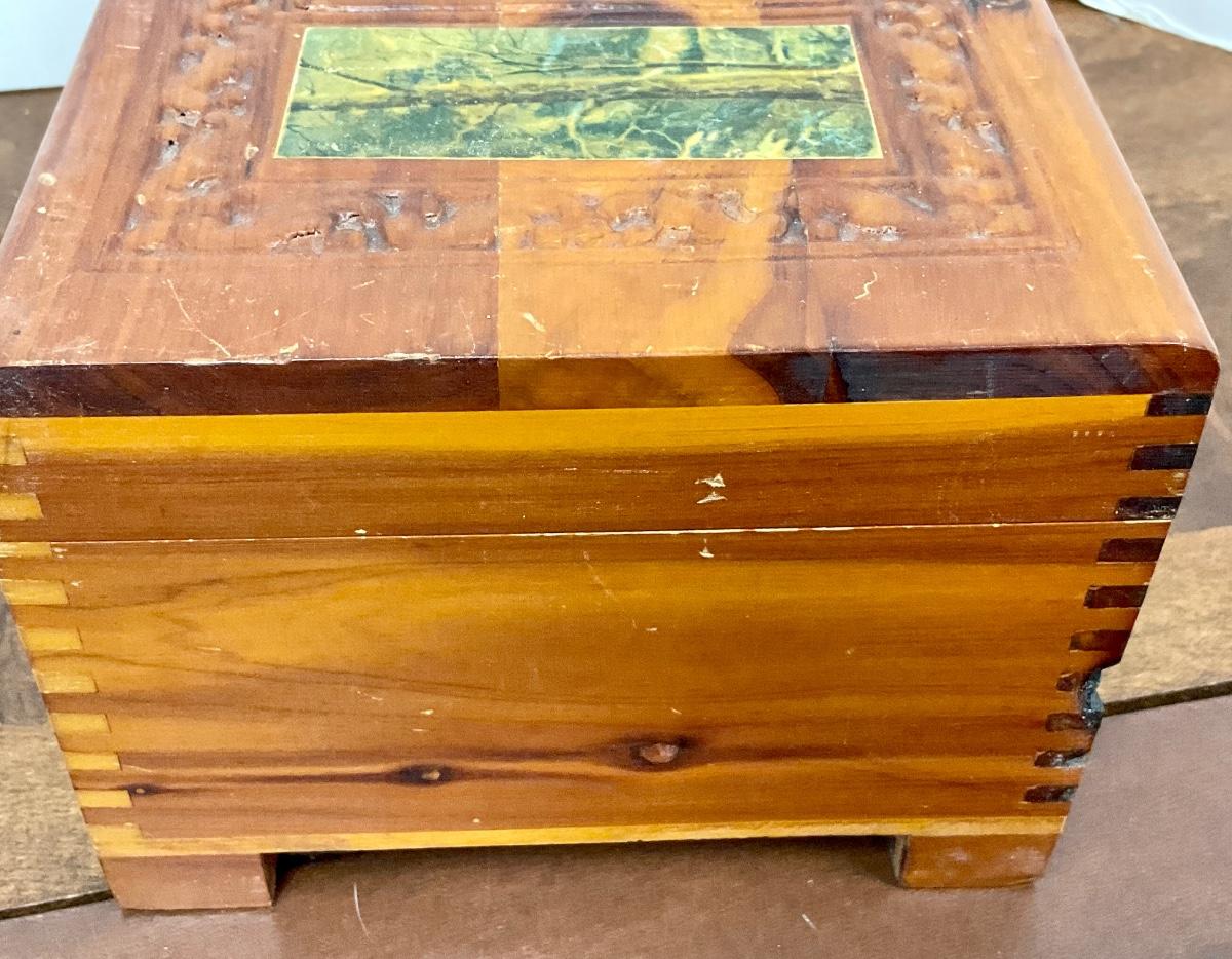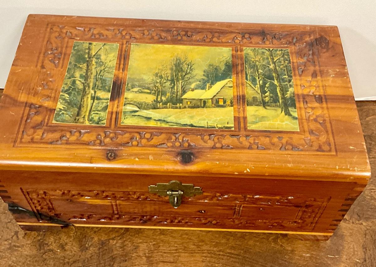Vintage Wood Jewelry Box Cabin Scene Lid with Mirror Inside