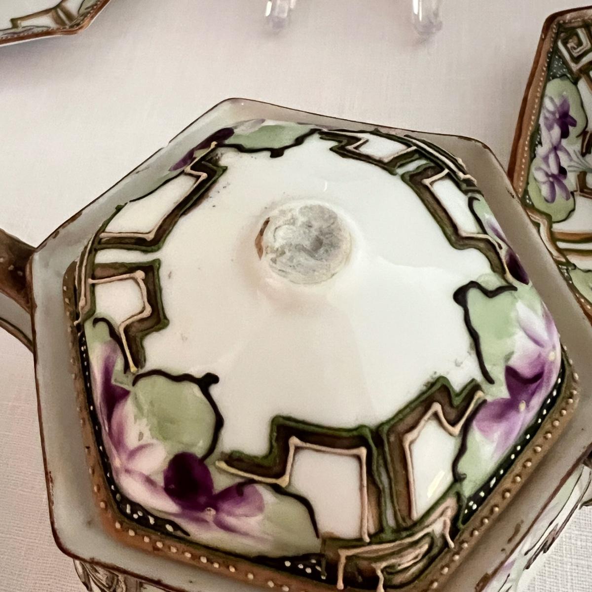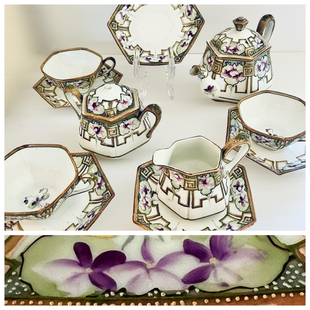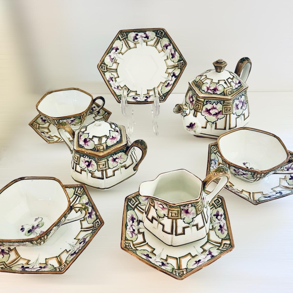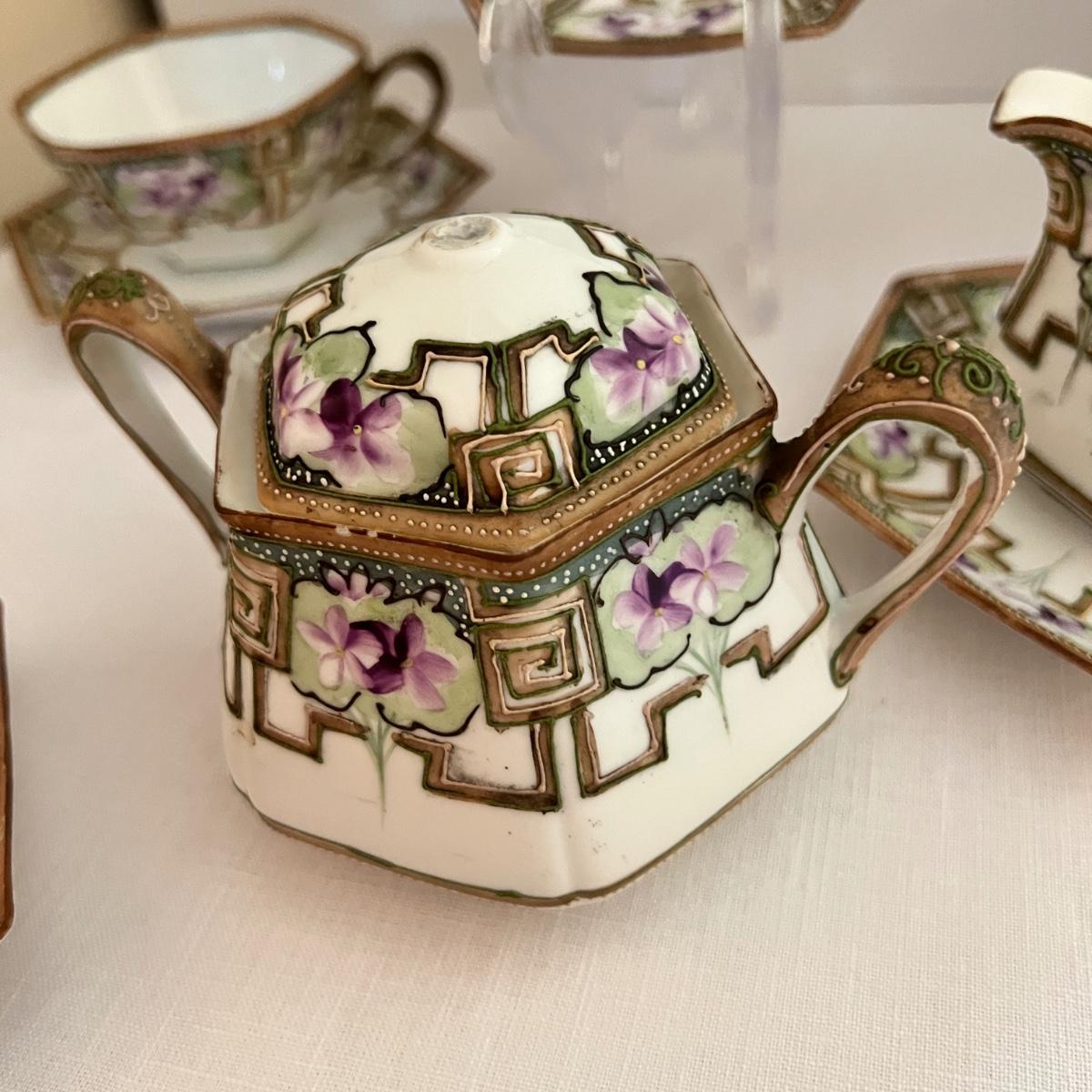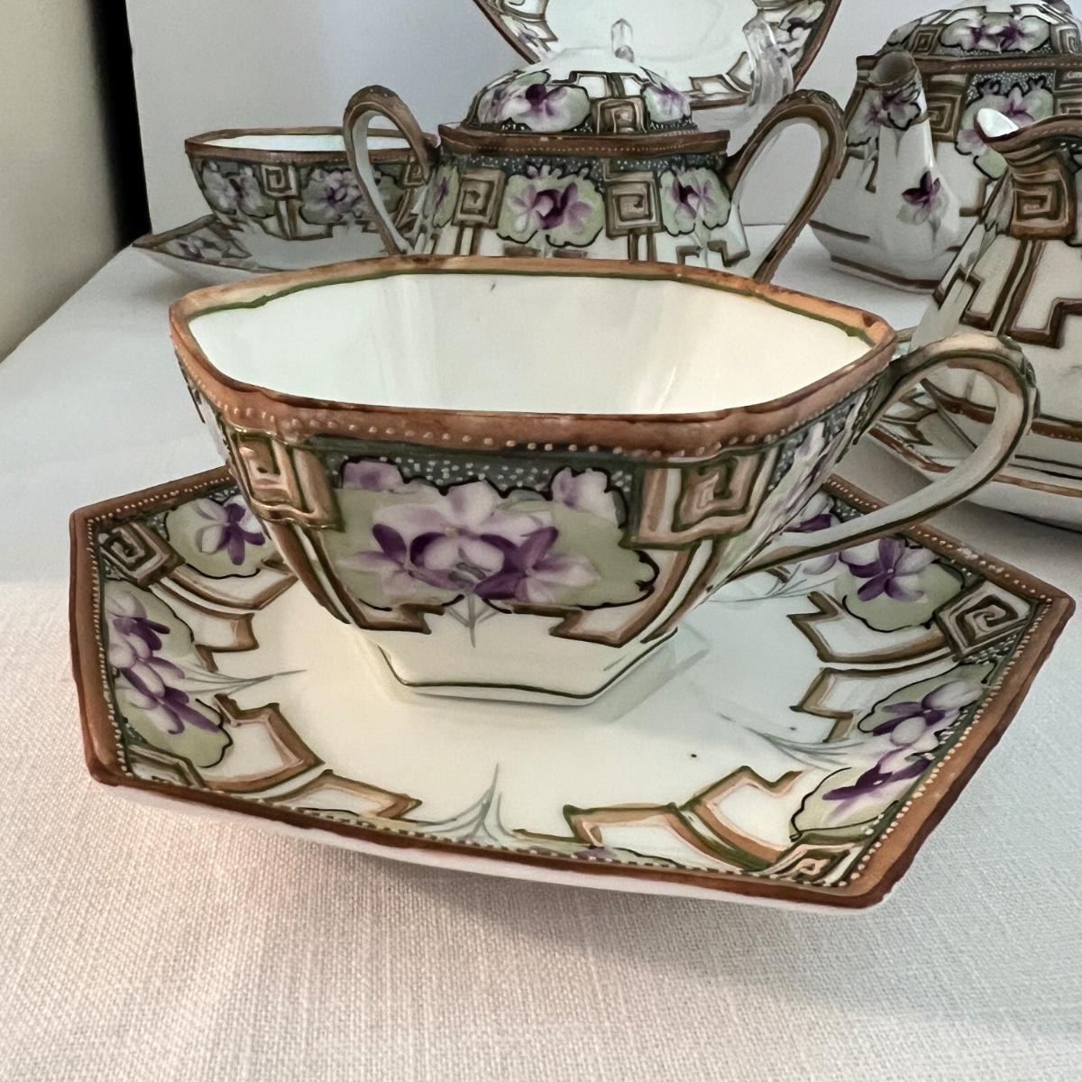 5 plates, 3 tea cups, 1 creamer, 1 tea pot and 1 sugar bowl. NOTE: sugar bowl knob is broken off as shown in pics. Still an absolutely beautiful set!