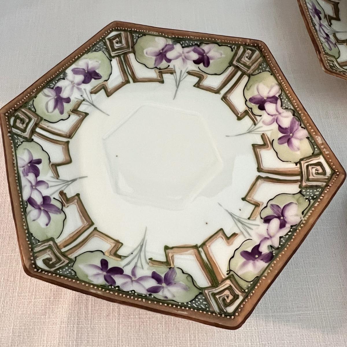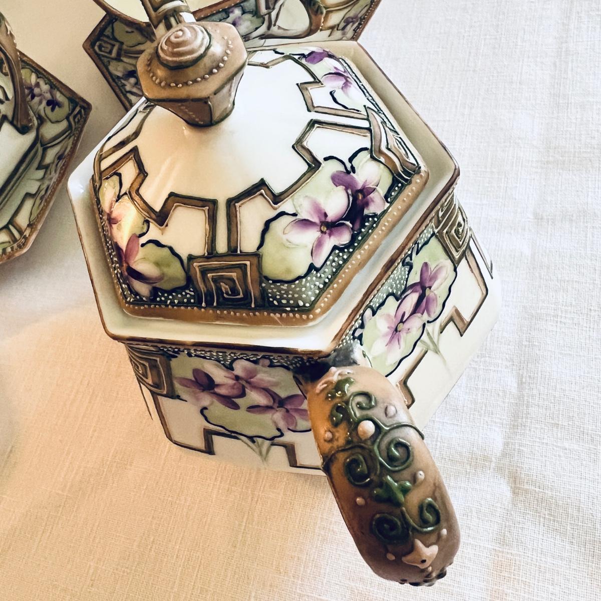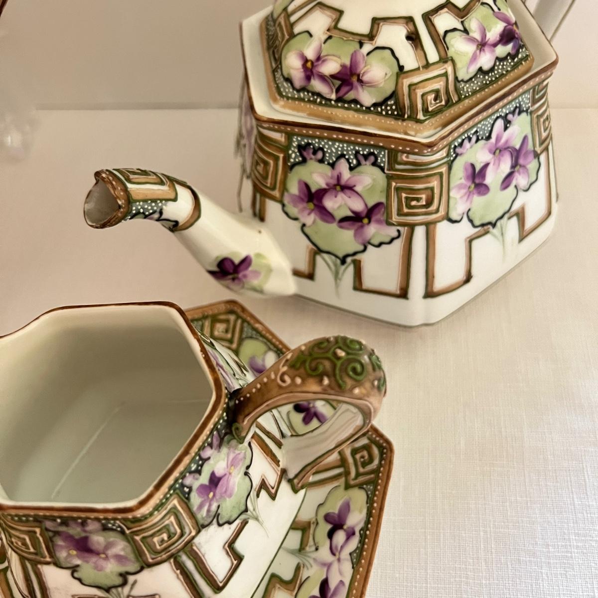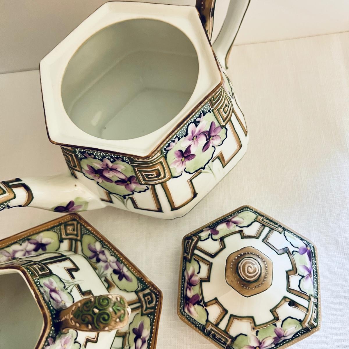 5 plates, 3 tea cups, 1 creamer, 1 tea pot and 1 sugar bowl. NOTE: sugar bowl knob is broken off as shown in pics. Still an absolutely beautiful set!