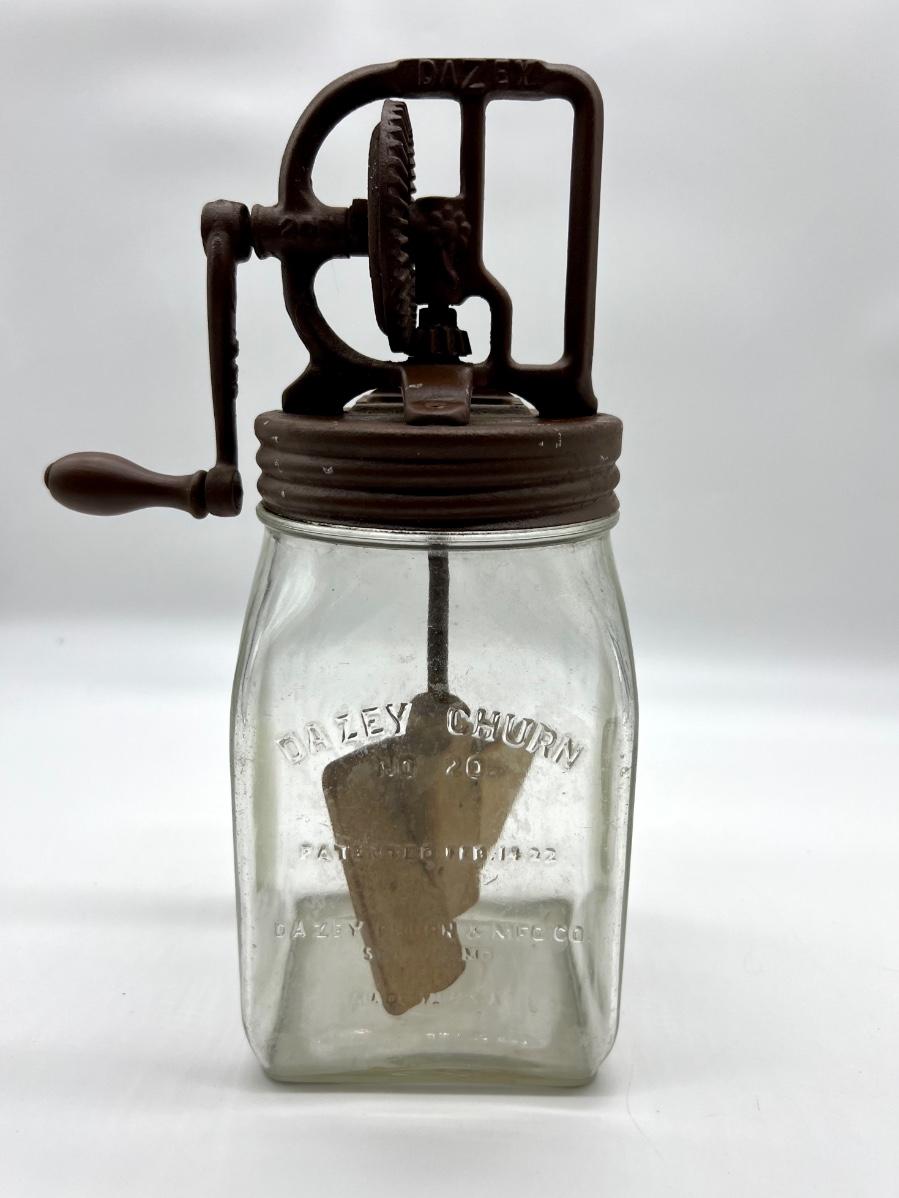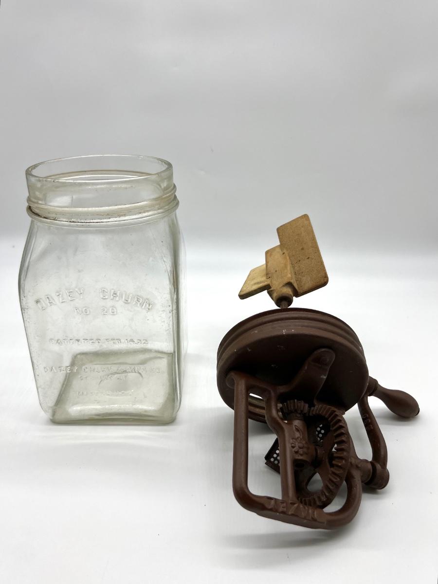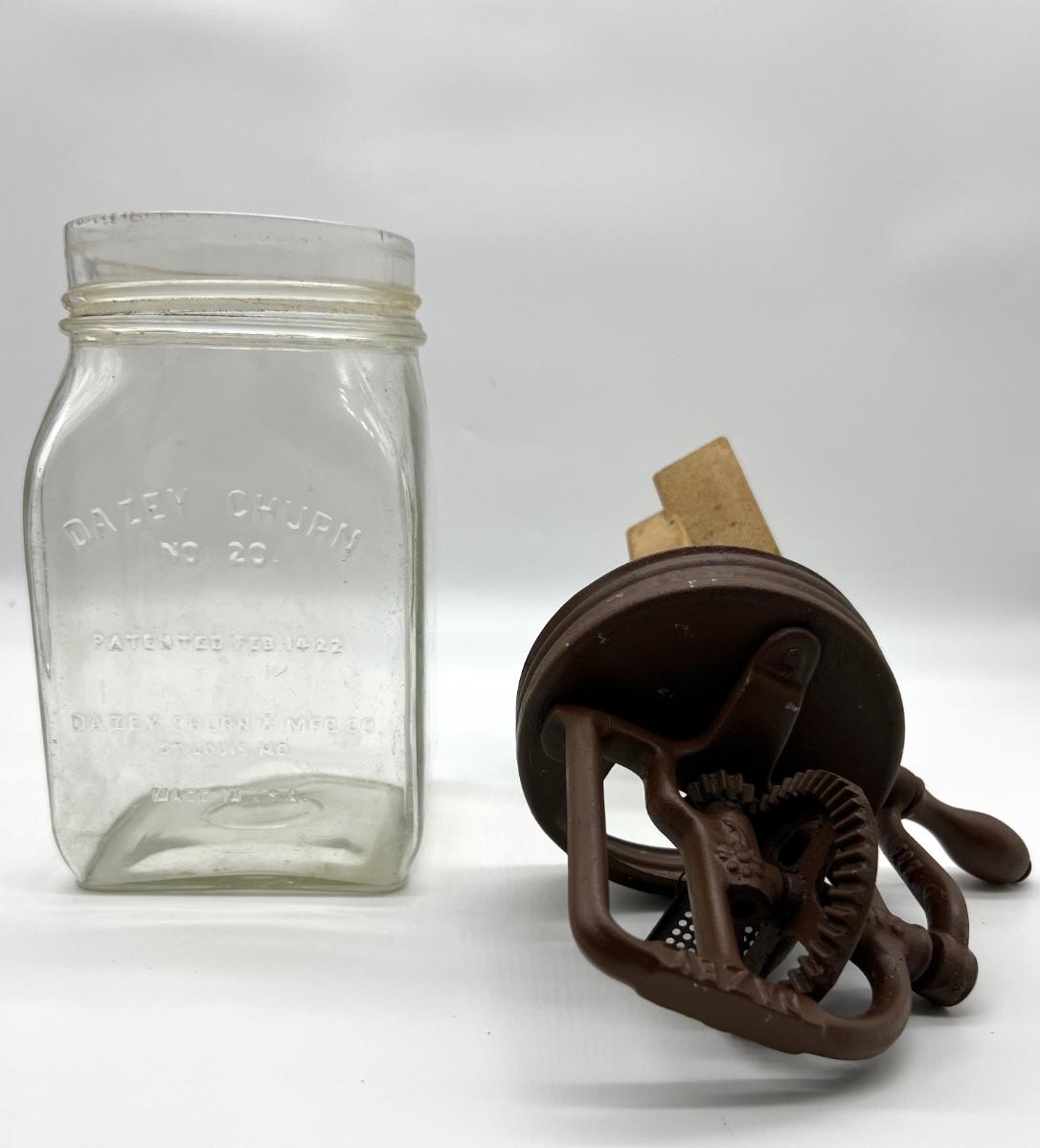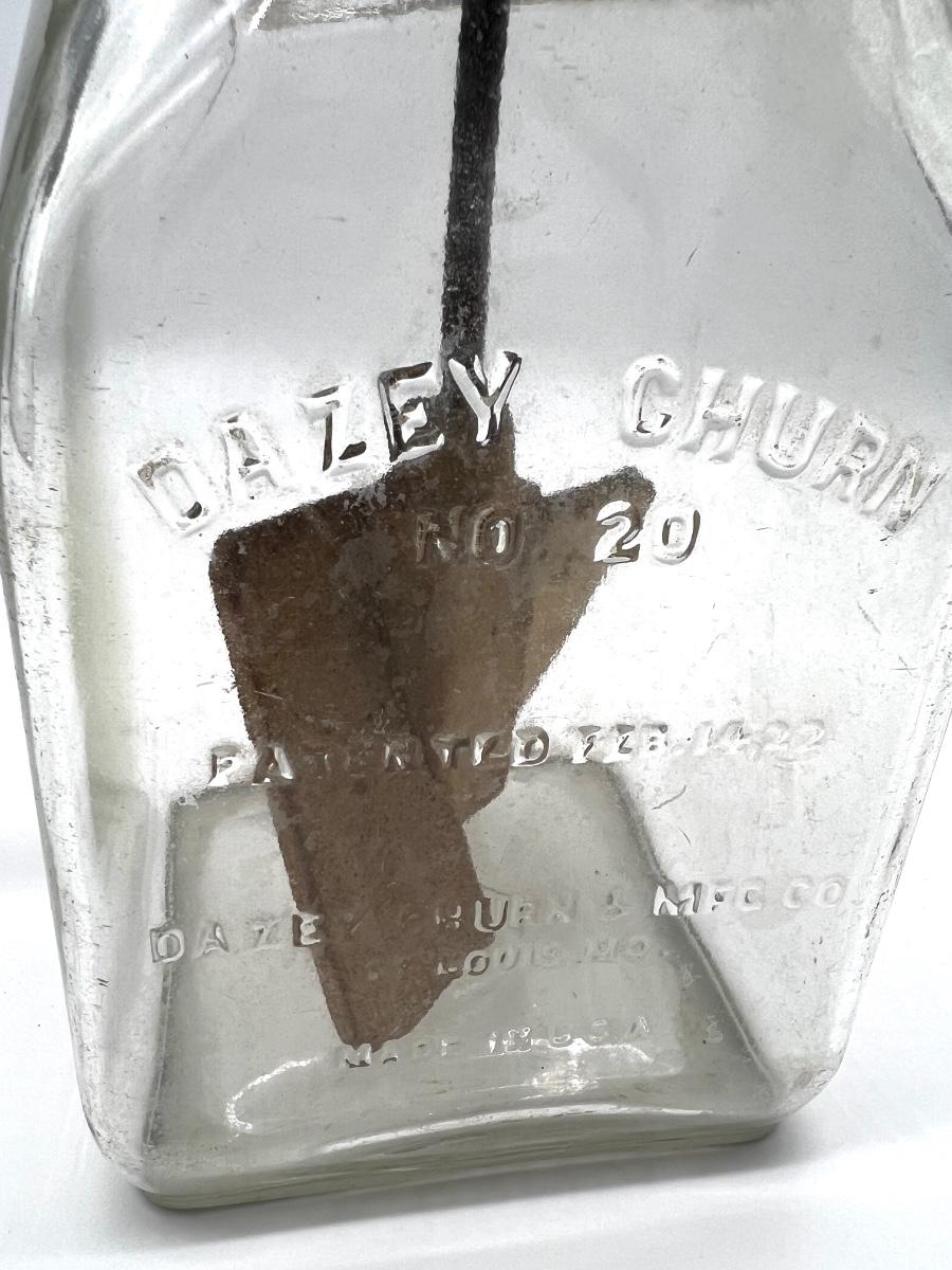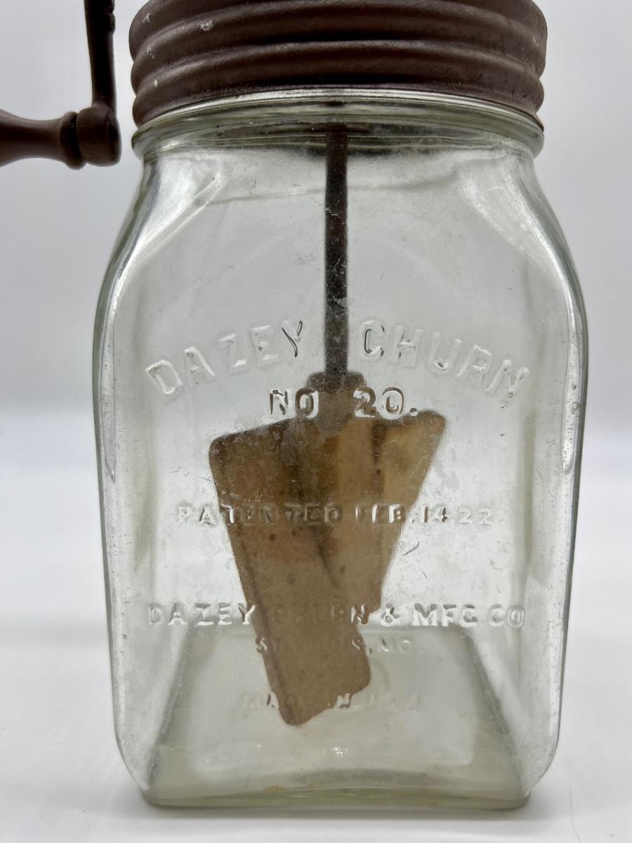 No. 20 DAZEY Churn Glass Butter Churn with Wood Paddle. Measures 12 inches tall, 8 inches wide and 5 inches deep.