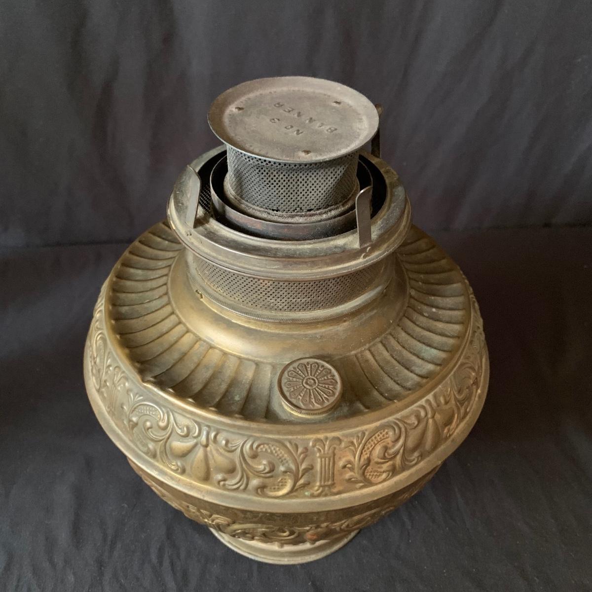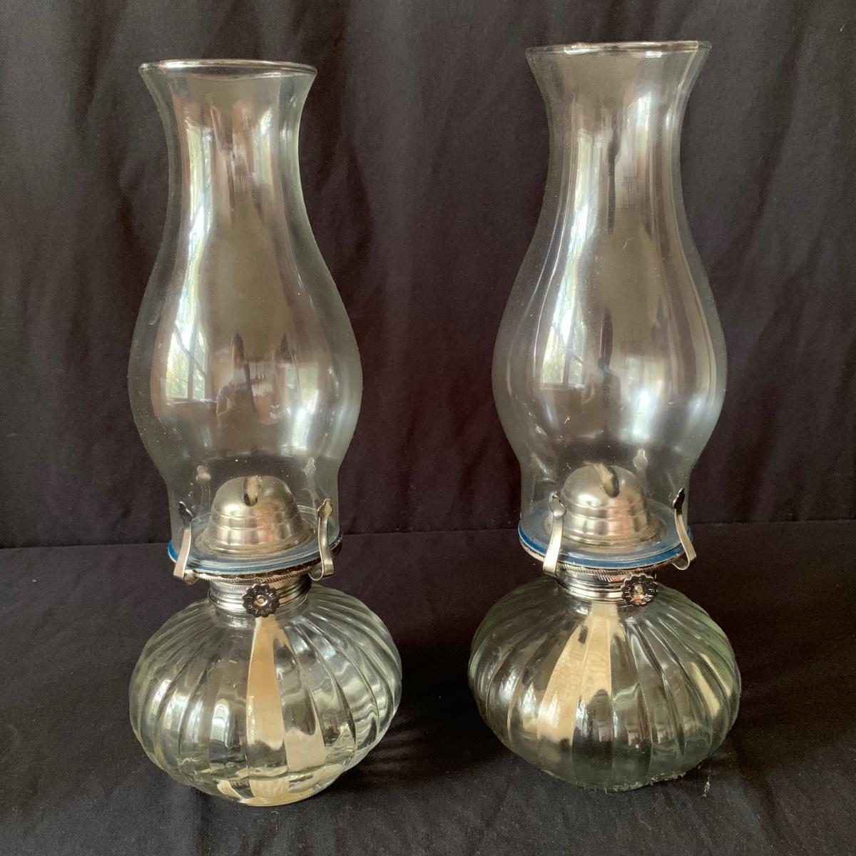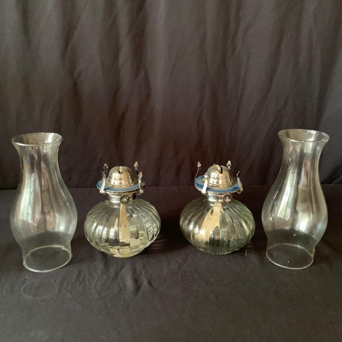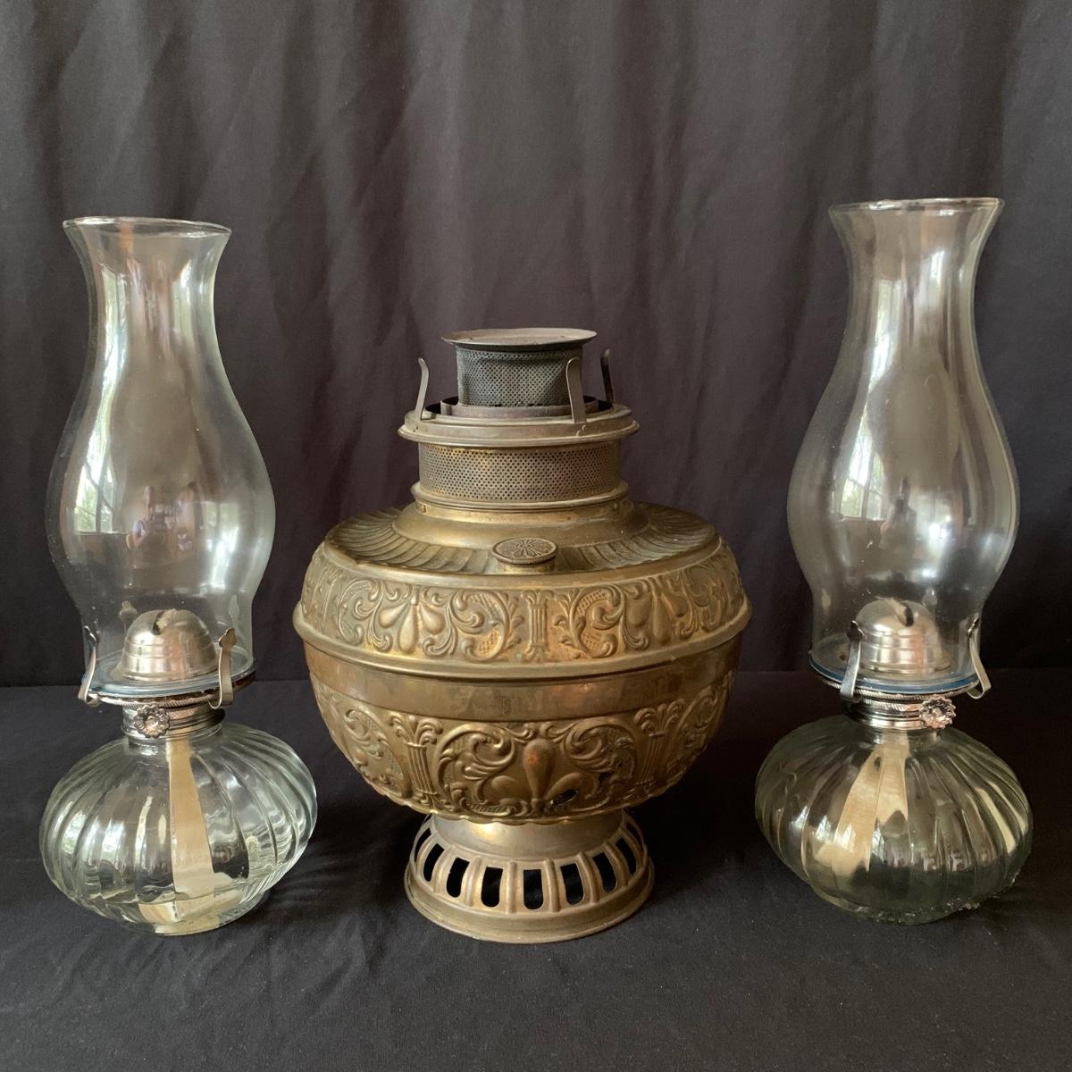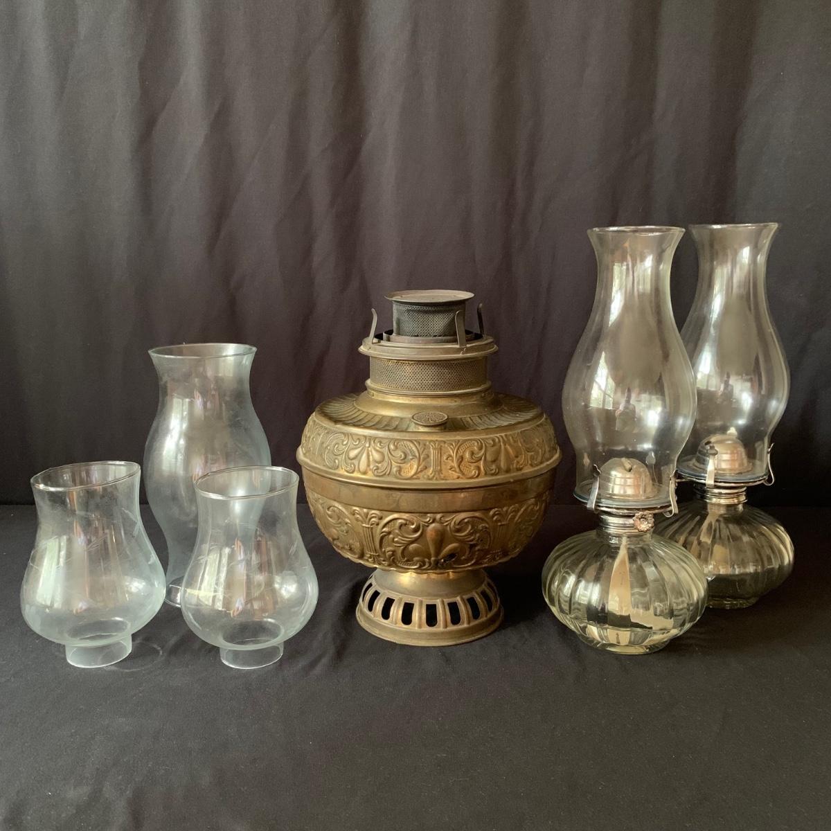 Six items in this collection include a No. 3 Banner beautiful embossed brass oil lamp base, two glass oil lamps, and three glass oil lamp chimneys. The No. 3 Banner is just the base, not a complete lamp. It is a bit tarnished and has a dent in its top metal piece, but is otherwise in good condition. It is about 10.5” tall and its base is 5”D. The two matching glass oil lamps are Lamplight Farms brand and are dusty but in good condition. They are about 13” tall. There is a little liquid in the bottom of one, but we cannot verify the contents. The two matching extra glass chimneys have a delicate etched design. The other chimney has what appears to be some paint on it that should be removable.