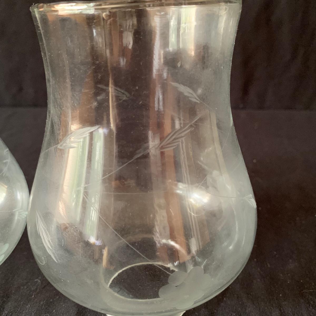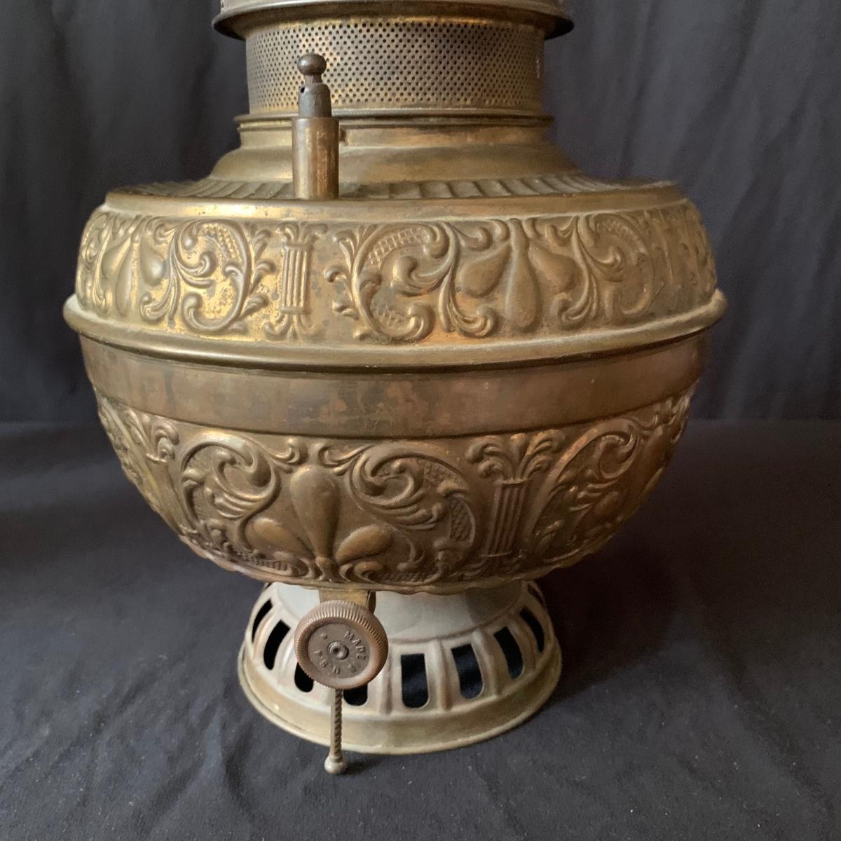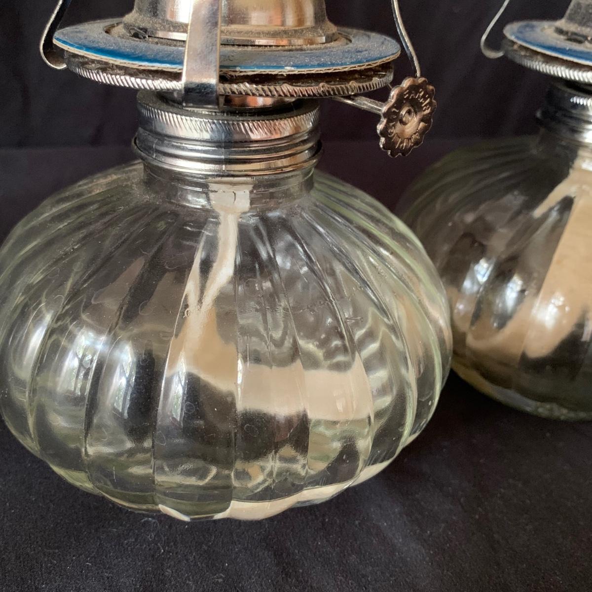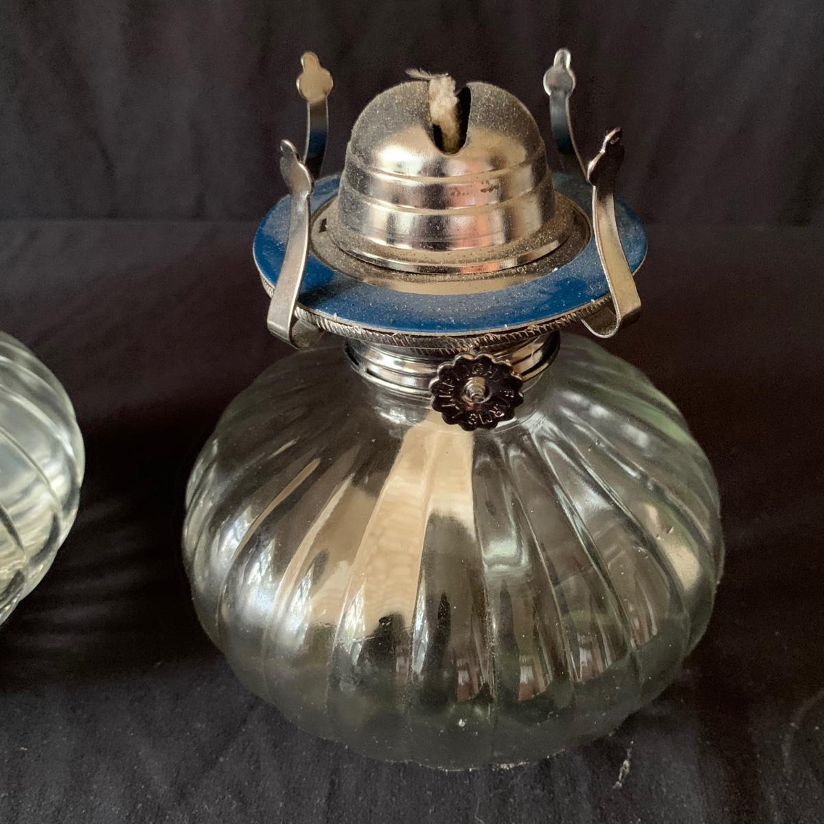 Six items in this collection include a No. 3 Banner beautiful embossed brass oil lamp base, two glass oil lamps, and three glass oil lamp chimneys. The No. 3 Banner is just the base, not a complete lamp. It is a bit tarnished and has a dent in its top metal piece, but is otherwise in good condition. It is about 10.5” tall and its base is 5”D. The two matching glass oil lamps are Lamplight Farms brand and are dusty but in good condition. They are about 13” tall. There is a little liquid in the bottom of one, but we cannot verify the contents. The two matching extra glass chimneys have a delicate etched design. The other chimney has what appears to be some paint on it that should be removable.