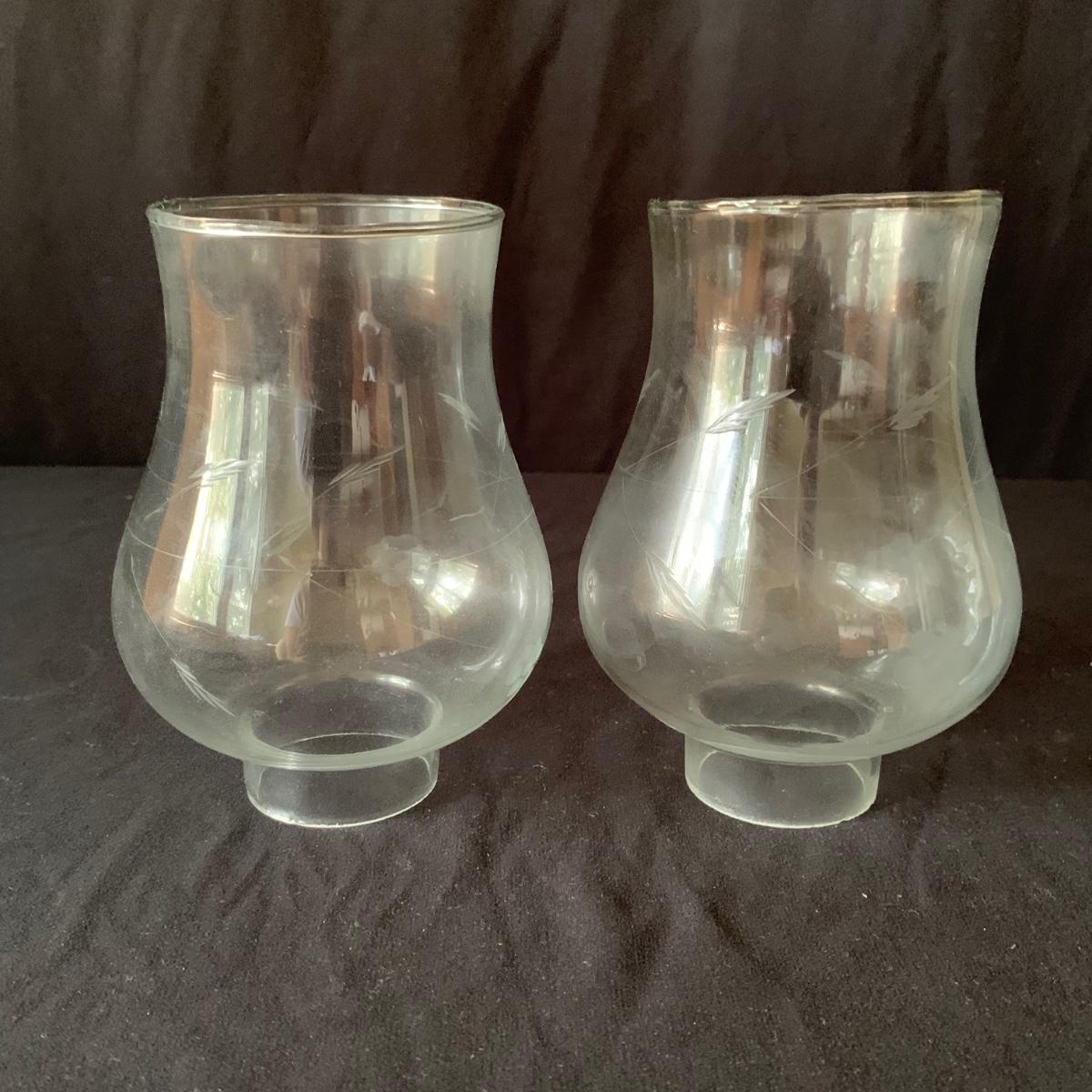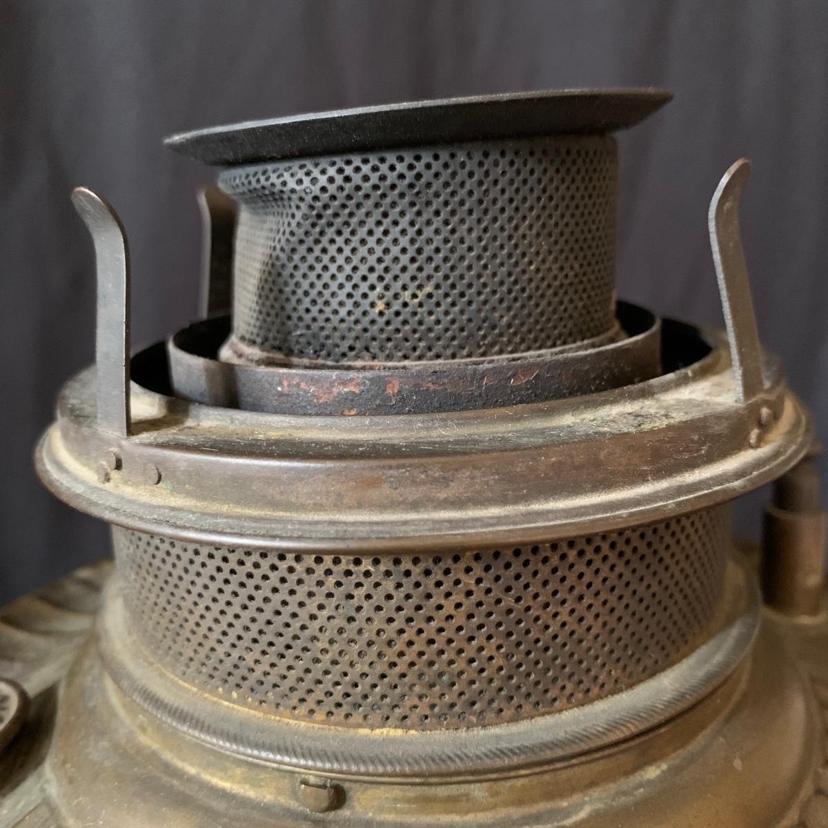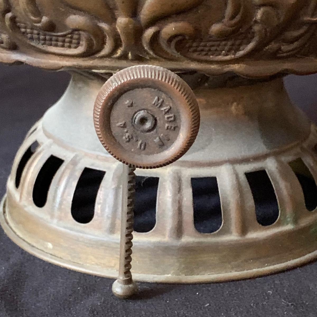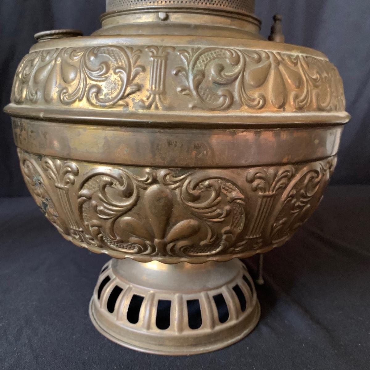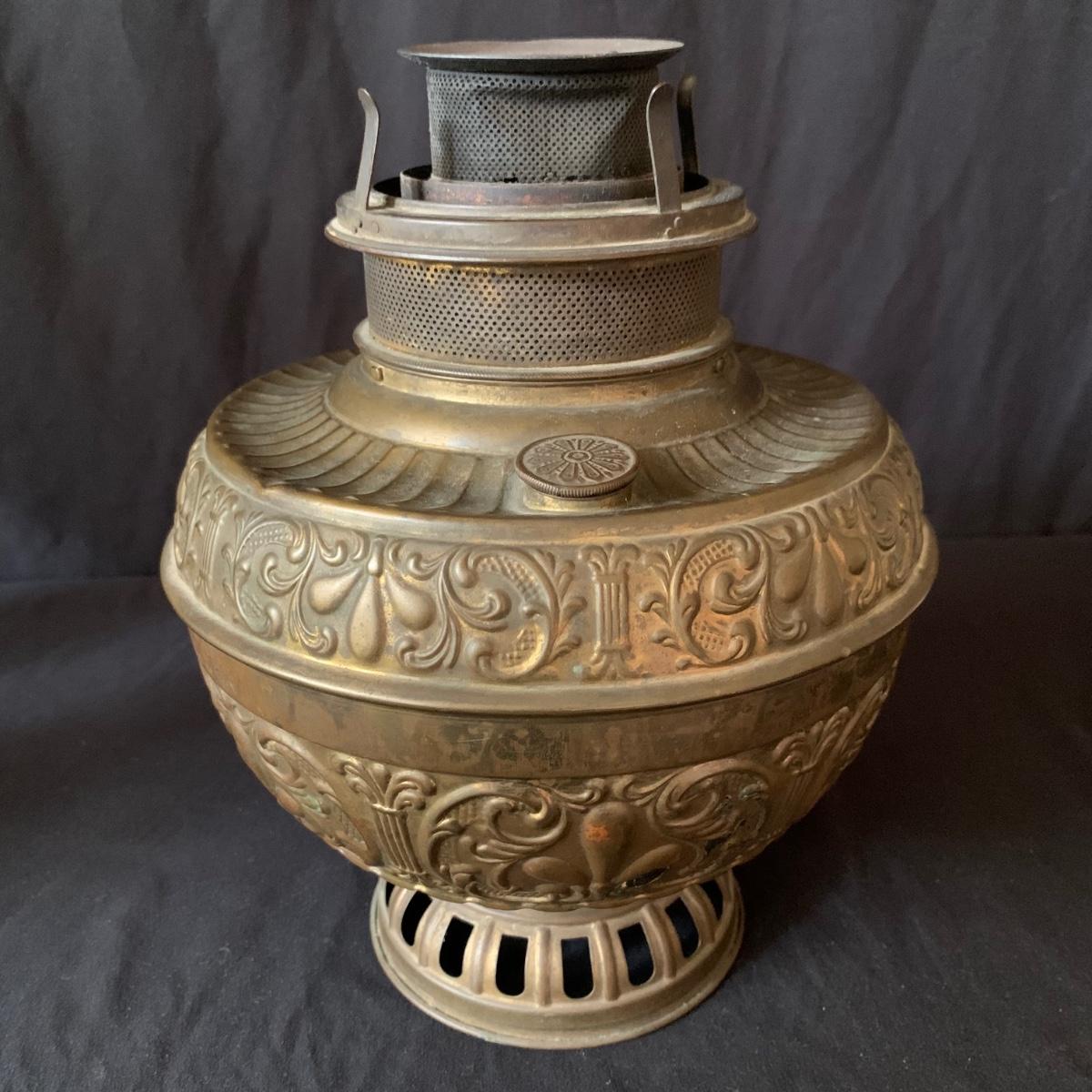 Six items in this collection include a No. 3 Banner beautiful embossed brass oil lamp base, two glass oil lamps, and three glass oil lamp chimneys. The No. 3 Banner is just the base, not a complete lamp. It is a bit tarnished and has a dent in its top metal piece, but is otherwise in good condition. It is about 10.5” tall and its base is 5”D. The two matching glass oil lamps are Lamplight Farms brand and are dusty but in good condition. They are about 13” tall. There is a little liquid in the bottom of one, but we cannot verify the contents. The two matching extra glass chimneys have a delicate etched design. The other chimney has what appears to be some paint on it that should be removable.