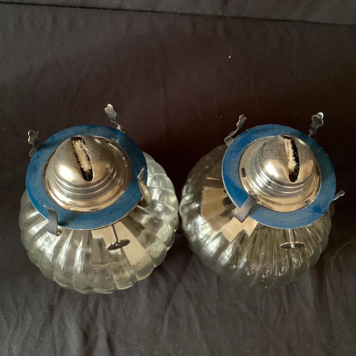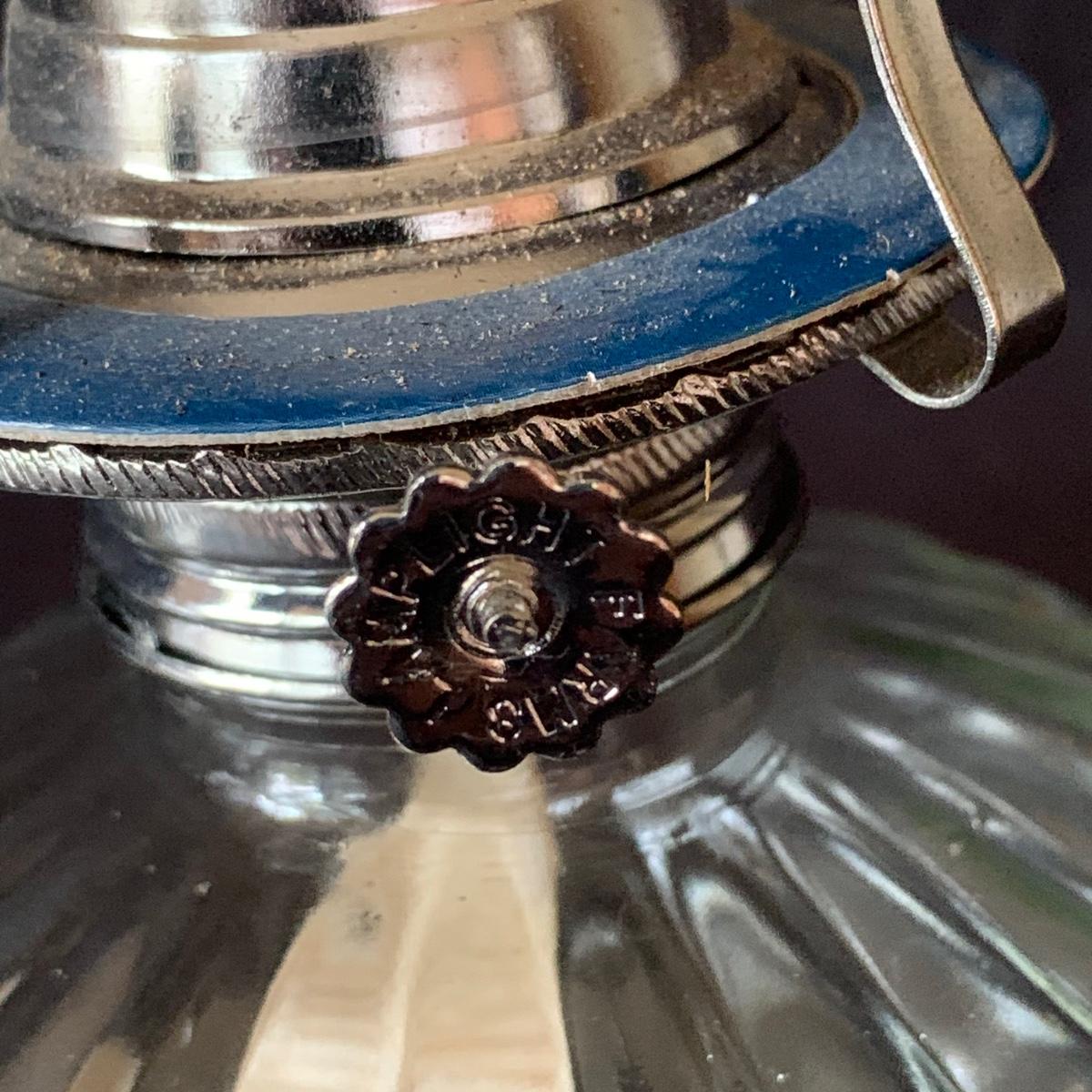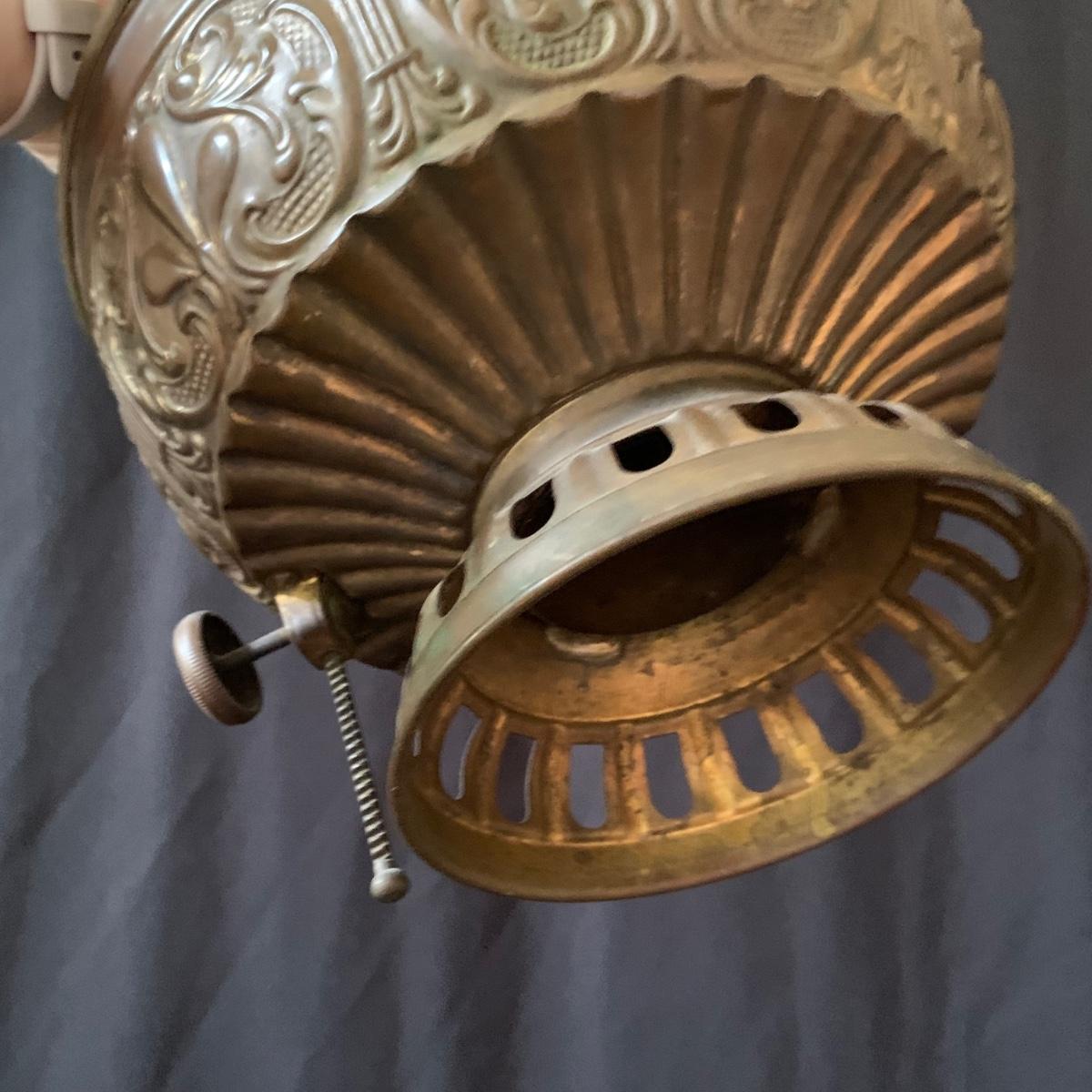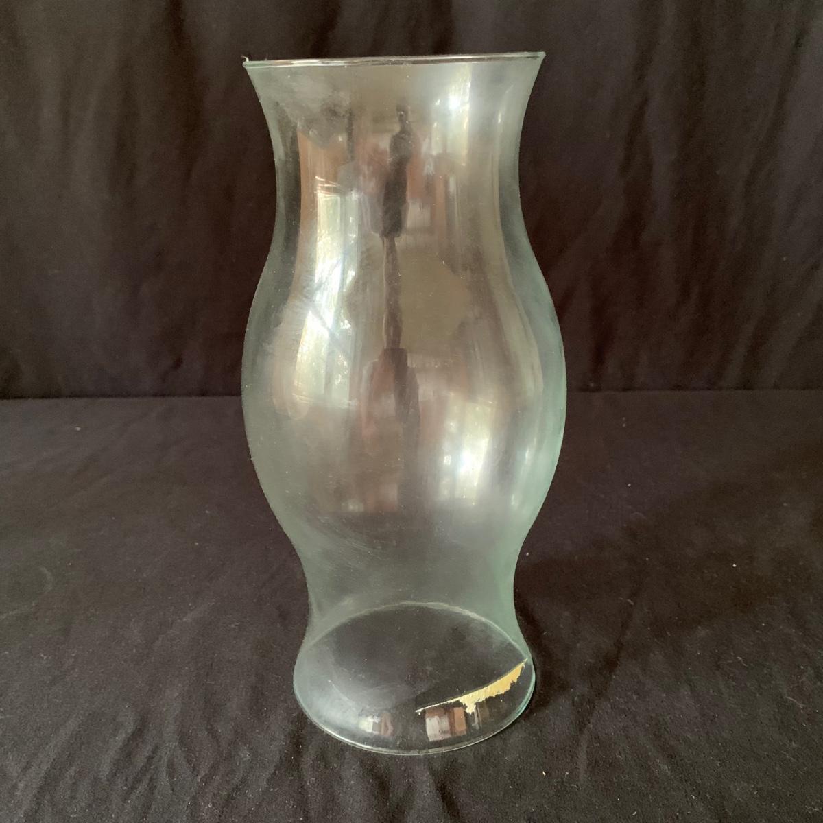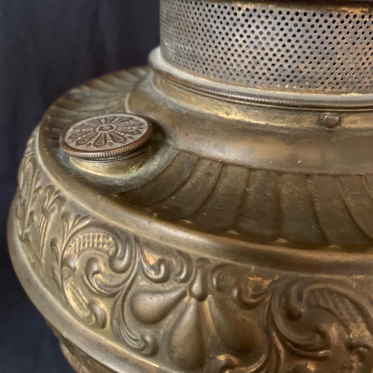 Six items in this collection include a No. 3 Banner beautiful embossed brass oil lamp base, two glass oil lamps, and three glass oil lamp chimneys. The No. 3 Banner is just the base, not a complete lamp. It is a bit tarnished and has a dent in its top metal piece, but is otherwise in good condition. It is about 10.5” tall and its base is 5”D. The two matching glass oil lamps are Lamplight Farms brand and are dusty but in good condition. They are about 13” tall. There is a little liquid in the bottom of one, but we cannot verify the contents. The two matching extra glass chimneys have a delicate etched design. The other chimney has what appears to be some paint on it that should be removable.