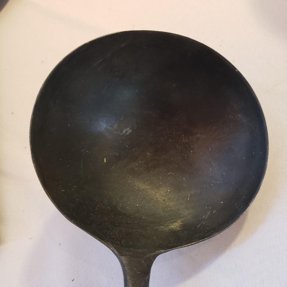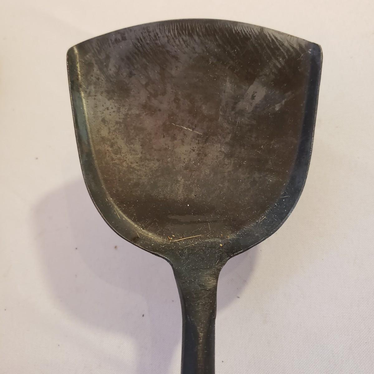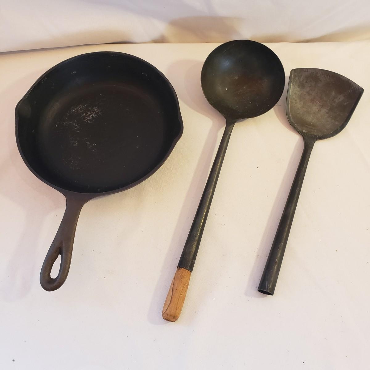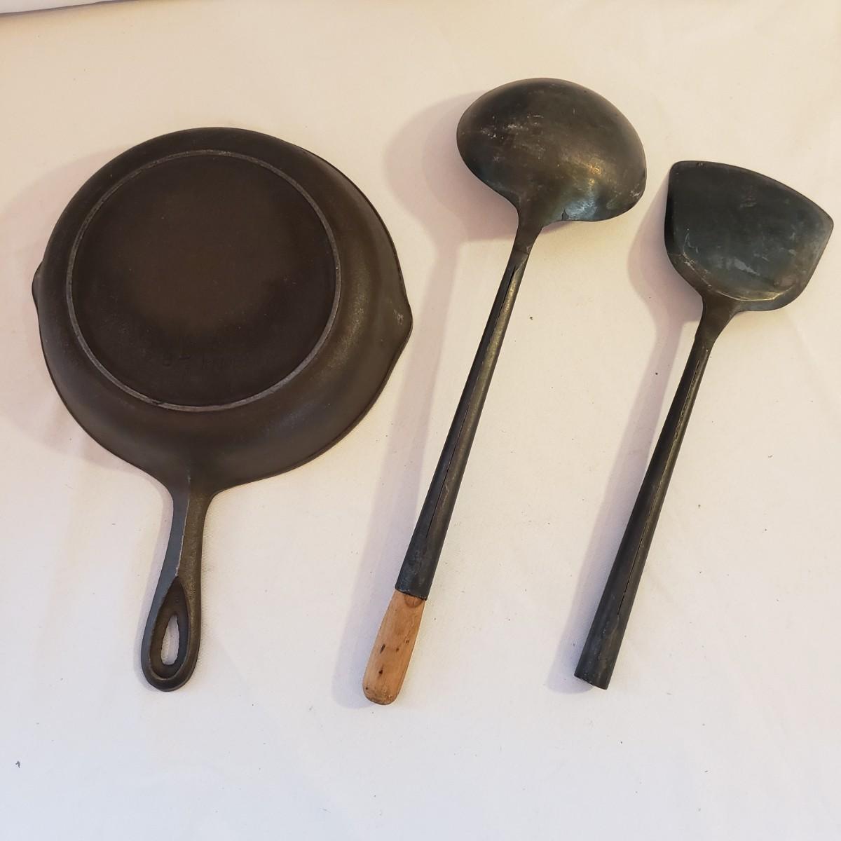 This lot has an 8" No. 5 cast iron pan. There appears to be no rusting on the pan. The metal with wooden end ladle measures 4" x 14". The metal spatula is missing the wood end, see picture.